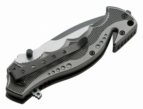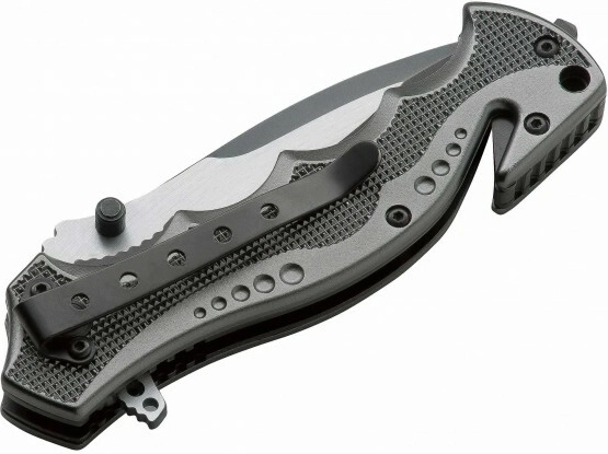La poignée ergonomique en aluminium anodisé, de couleur gris anthracite, est robuste, légère et tient parfaitement en main. À son extrémité se trouvent un brise‑vitre intégré et un coupe‑ceinture de sécurité qui font gagner de précieuses secondes lors des interventions. Le clip de poche permet un port confortable et sécurisé.