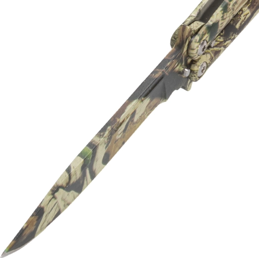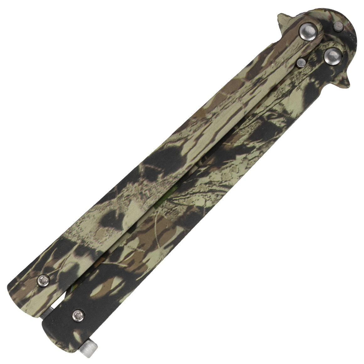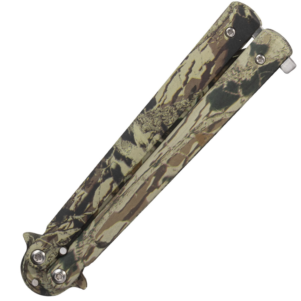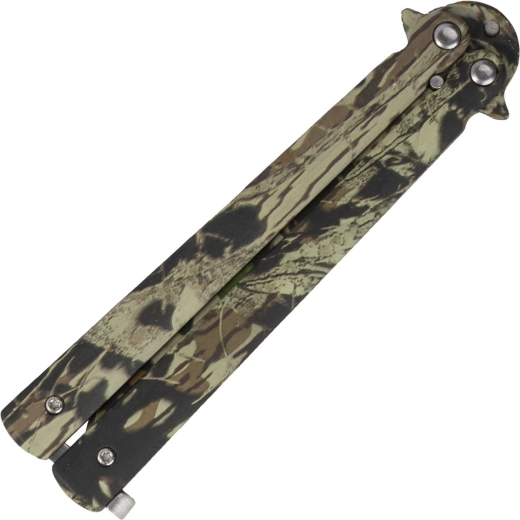 Stylish couteau papillon MAGNUM Balisong Camo en finition tactique camouflage, idéal pour le port quotidien. Il offre un design pratique avec deux poignées pivotantes pour une ouverture et une fermeture rapides, ainsi qu’une lame en acier résistante. Le motif camouflage sur la lame et les poignées confère au couteau un look moderne et tactique.