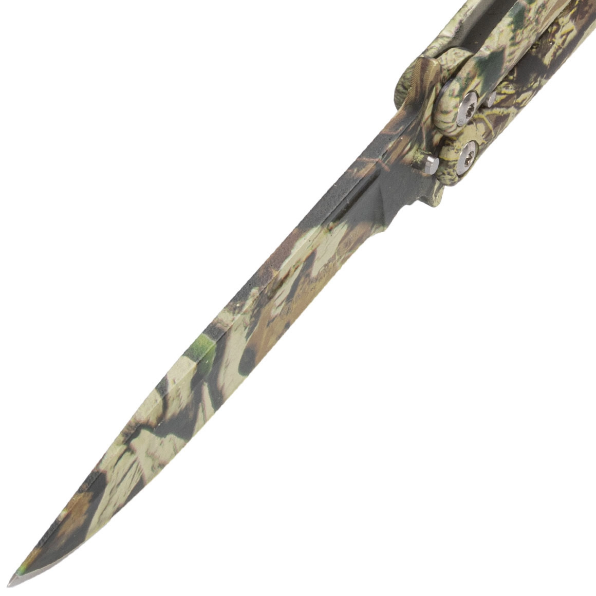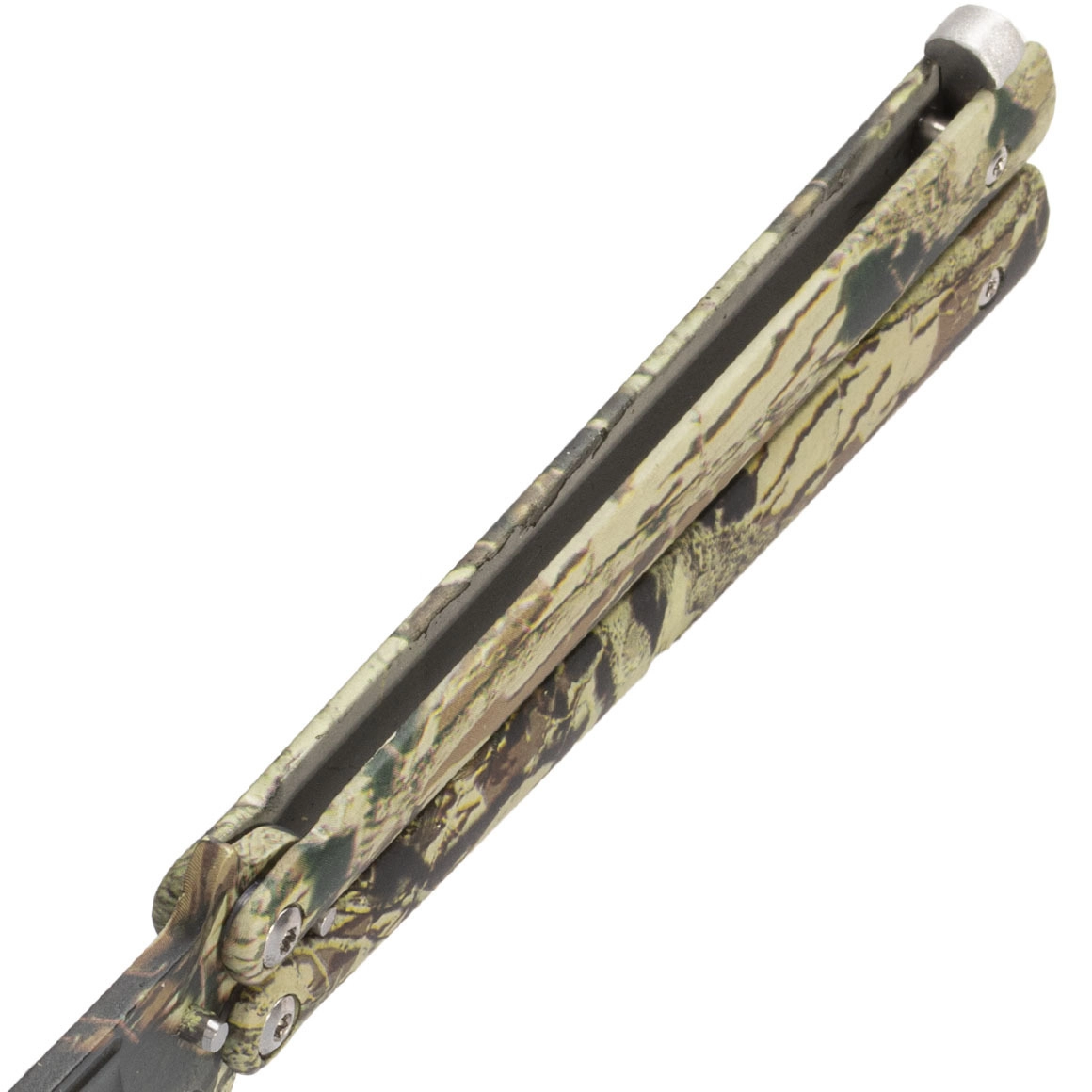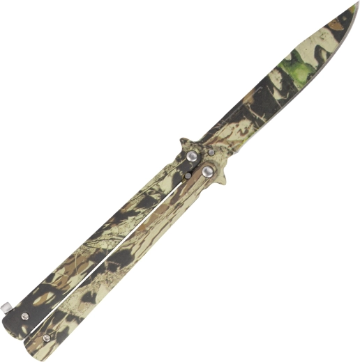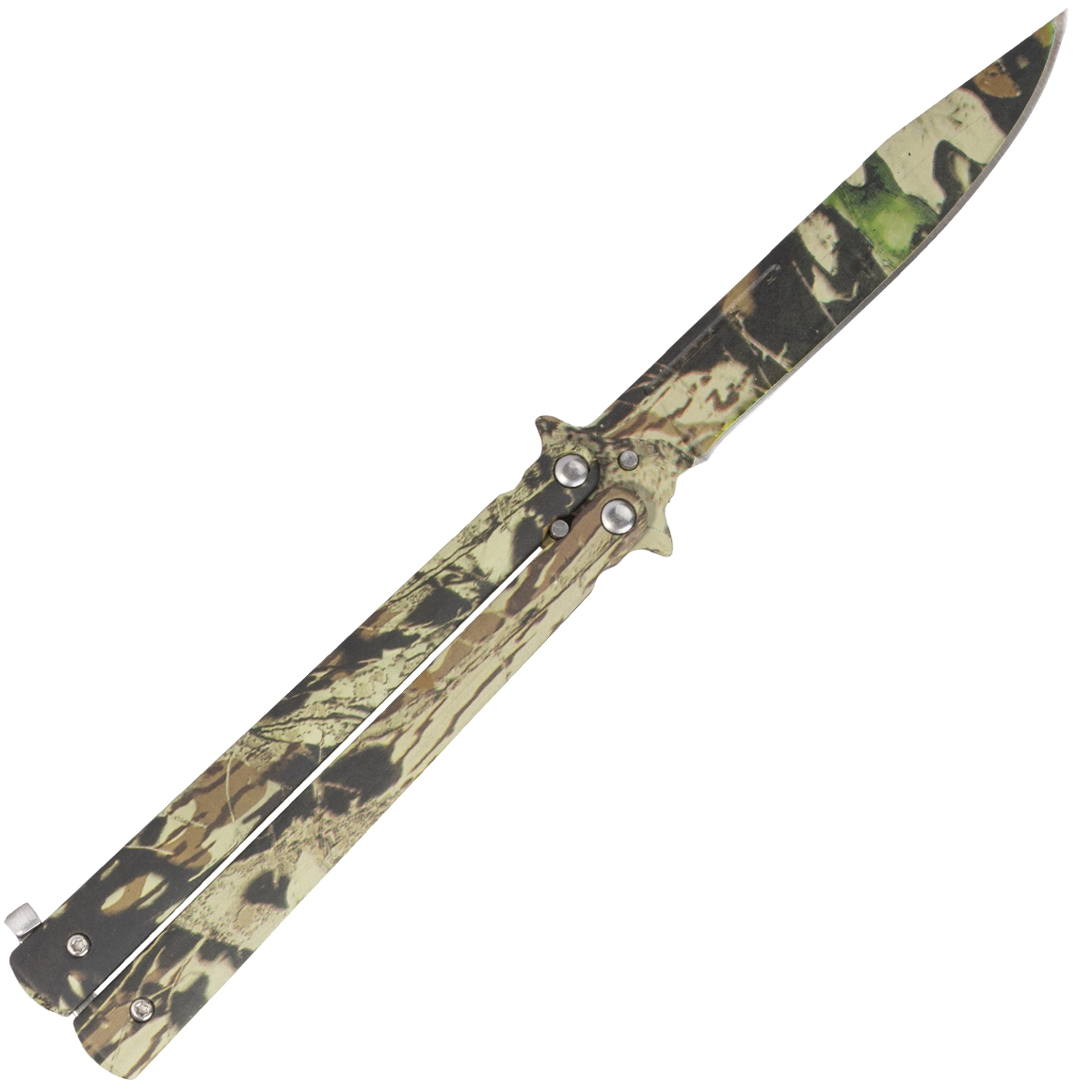 Stylish couteau papillon MAGNUM Balisong Camo en finition tactique camouflage, idéal pour le port quotidien. Il offre un design pratique avec deux poignées pivotantes pour une ouverture et une fermeture rapides, ainsi qu’une lame en acier résistante. Le motif camouflage sur la lame et les poignées confère au couteau un look moderne et tactique.