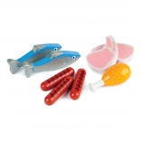 Livraison fraîche de viande et de poissons dans une boîte en bois avec poignées. Excellent jouet pour jouer au marchand ou au cuisinier, l’ensemble comprend 2 poissons, 2 côtelettes, 3 saucisses et 1 pilon de poulet. Une excellente façon d’enseigner aux enfants l’importance d’une alimentation saine et équilibrée, ainsi que l’origine des aliments et leur préparation. Chaque pièce est dodue et idéale pour les petites mains d’enfants. Encourage le jeu créatif et imaginatif. Fabriqué avec des matériaux de qualité provenant de sources responsables. Conforme à la norme de sécurité européenne. Principales caractéristiques : forme idéale pour les petites mains d’enfants, stimule la créativité et l’imagination