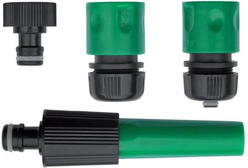 L’emballage comprend un jeu d’accessoires complet – une buse, des raccords rapides et un adaptateur – permettant un branchement rapide à la source d’eau et un contrôle aisé du débit.