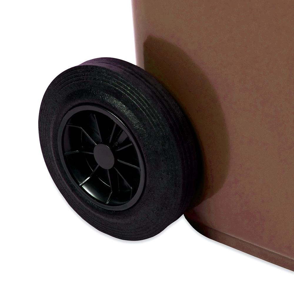 Deux grandes roues arrière robustes et une poignée pratique permettent de déplacer la poubelle confortablement, même à pleine charge, sur des pavés ou des surfaces irrégulières.