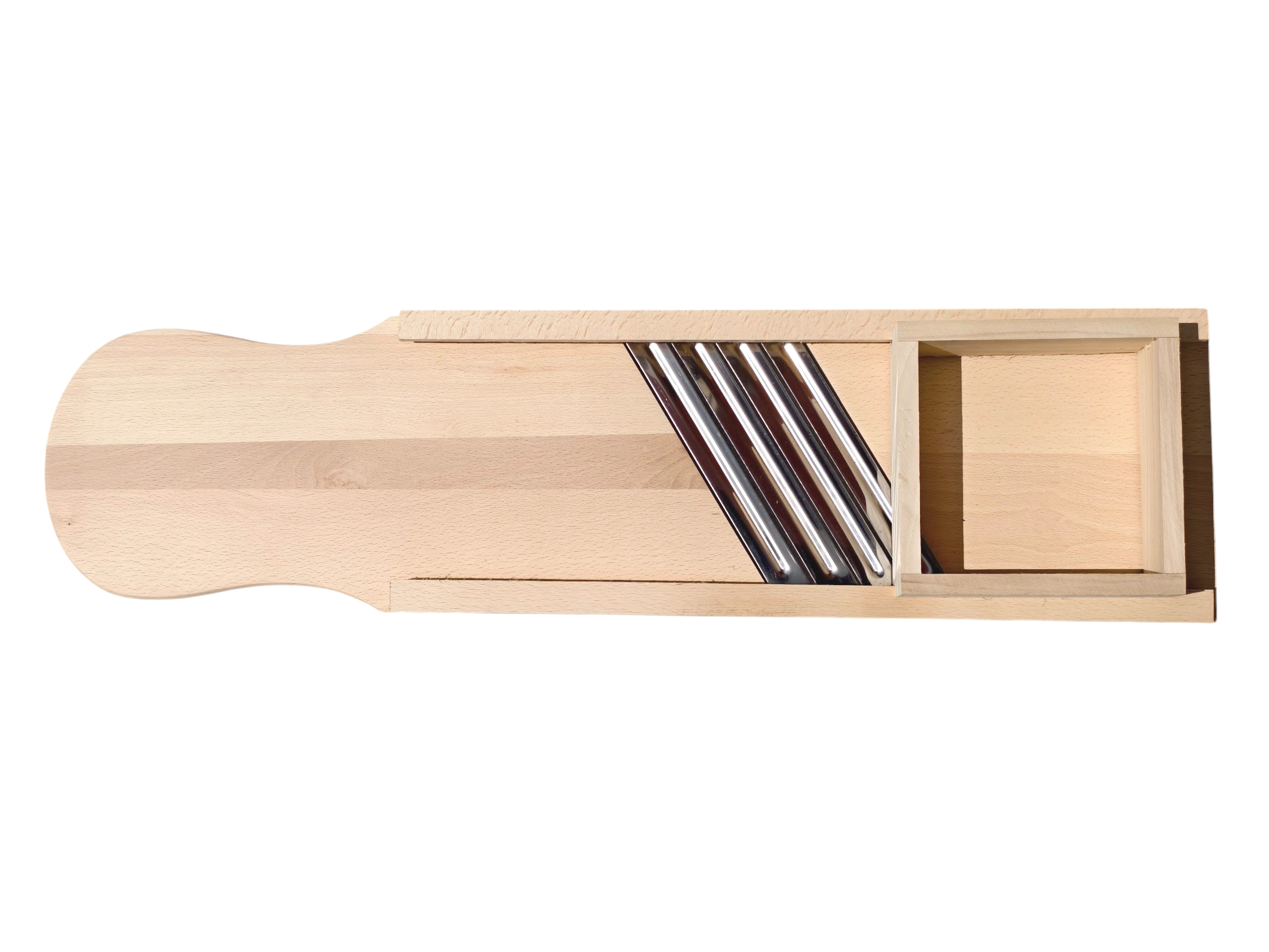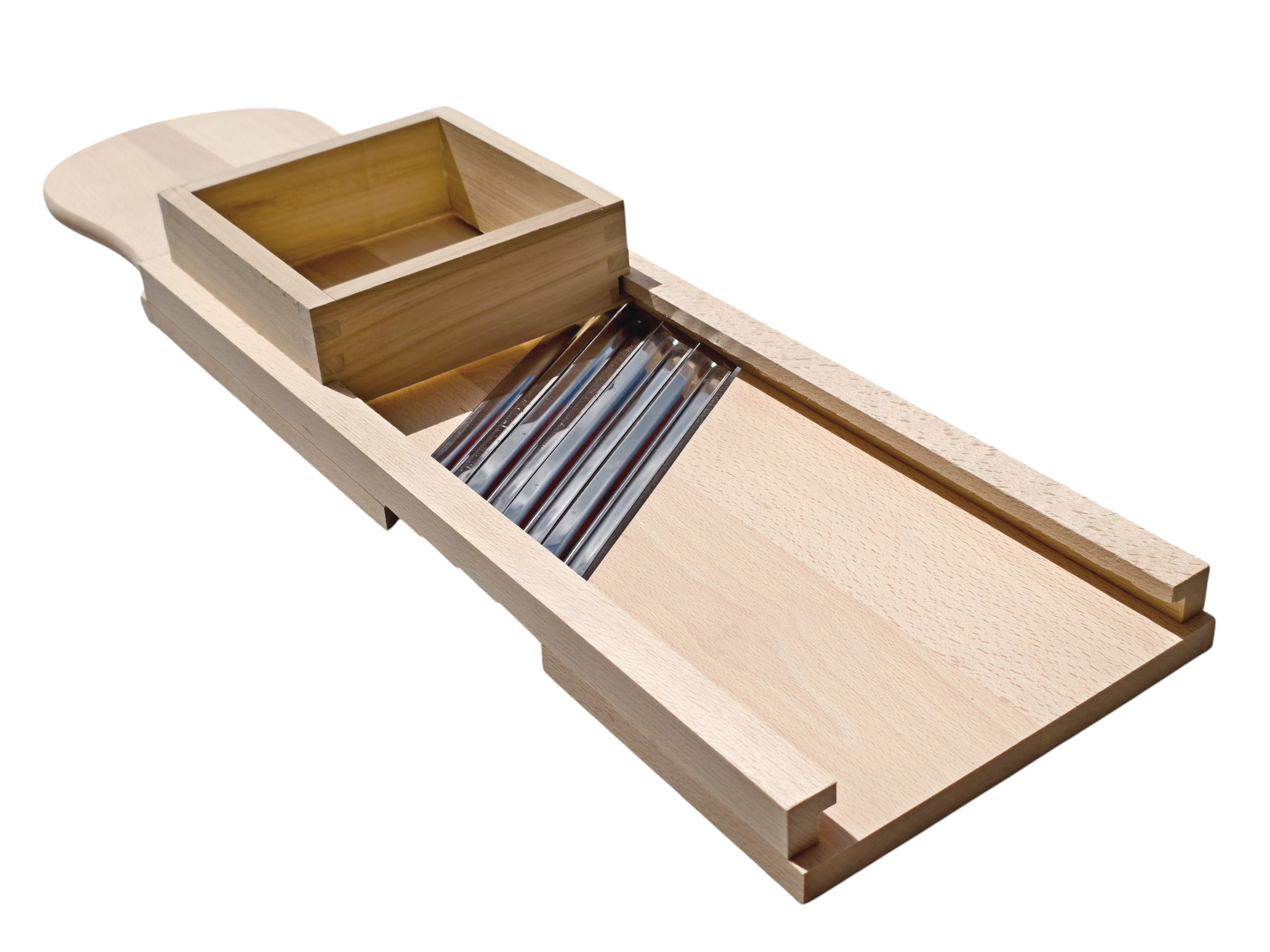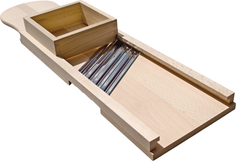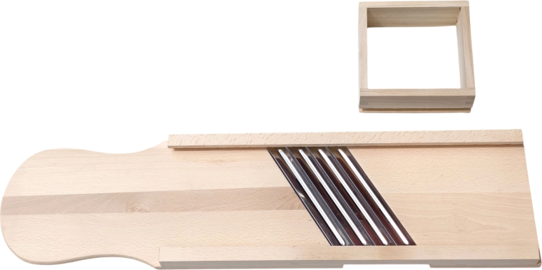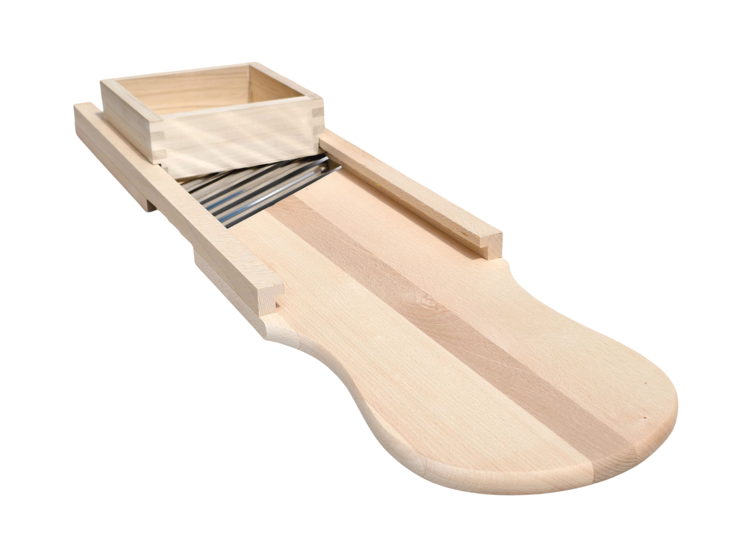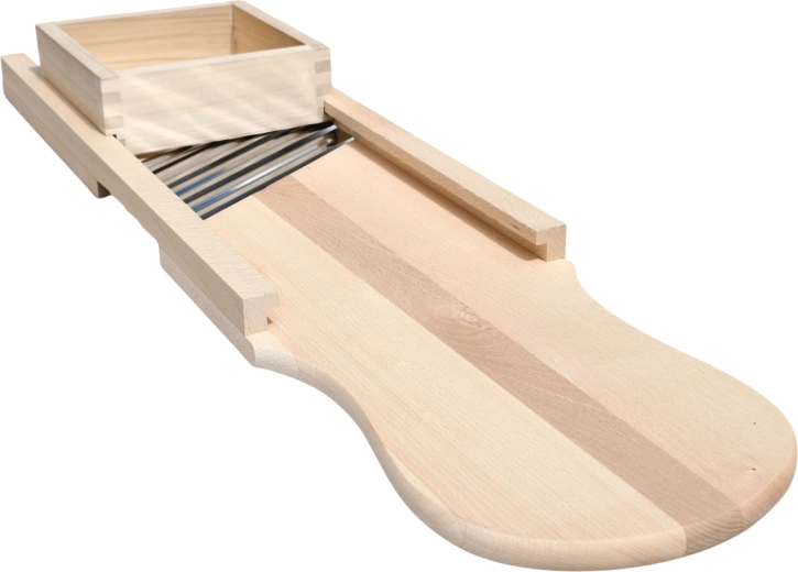 Découvrez une solution éprouvée pour préparer du chou maison, des salades et des pickles. Cette grande râpe en bois est fabriquée en bois massif naturel, hygiénique et extrêmement robuste. Quatre lames en acier inoxydable tranchantes assurent un éminçage fluide et précis avec des tranches régulières, tandis que le tiroir/boîte de guidage intégré(e) maintient les ingrédients en sécurité et protège les doigts pendant le travail.