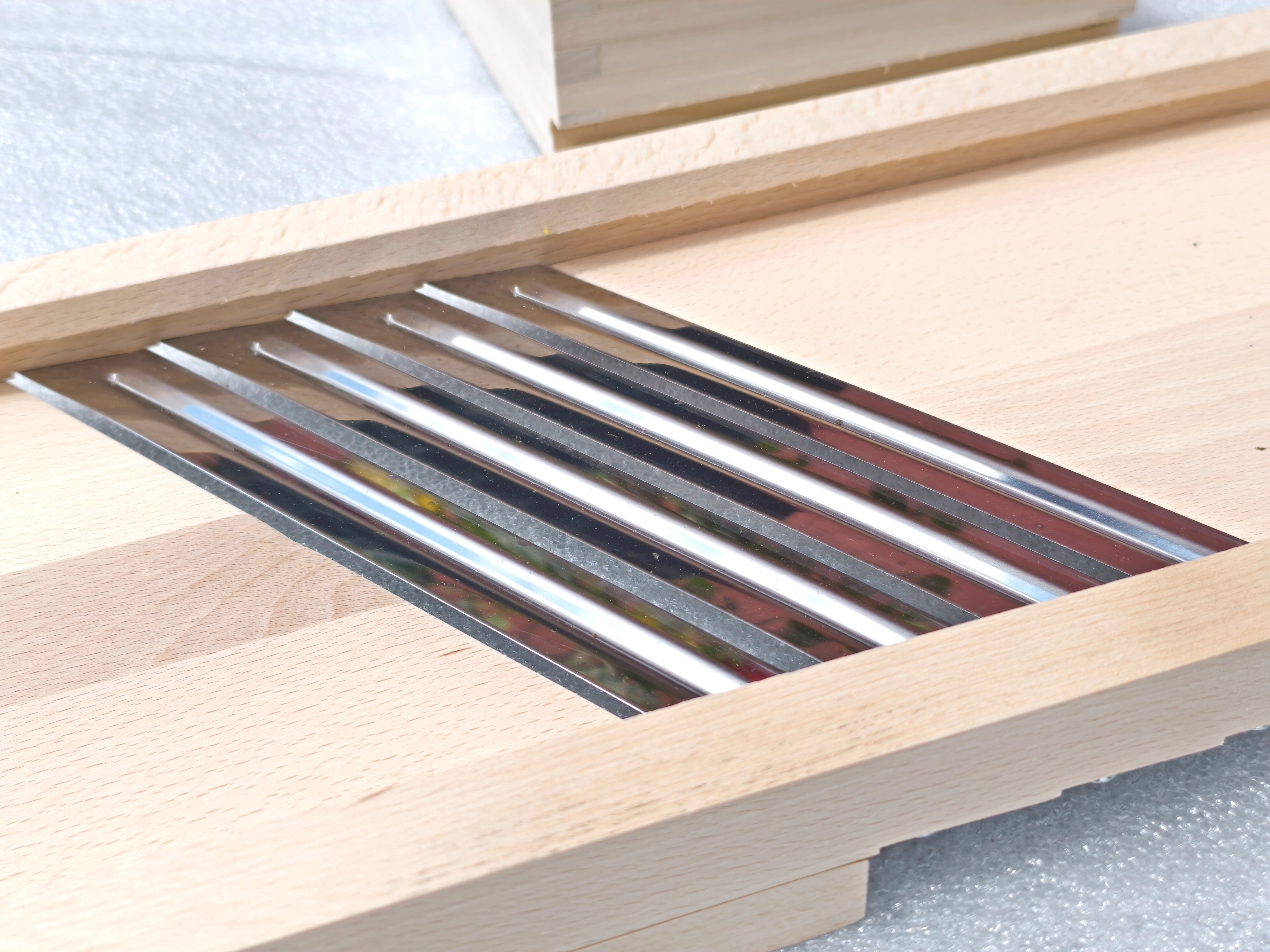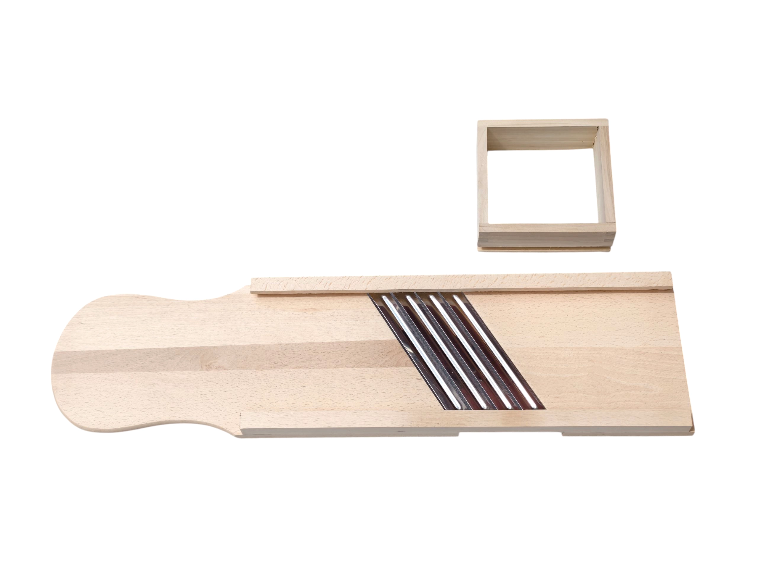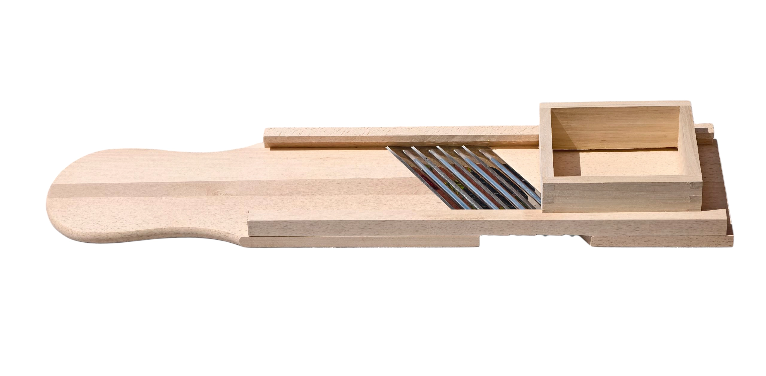 Découvrez une solution éprouvée pour préparer du chou maison, des salades et des pickles. Cette grande râpe en bois est fabriquée en bois massif naturel, hygiénique et extrêmement robuste. Quatre lames en acier inoxydable tranchantes assurent un éminçage fluide et précis avec des tranches régulières, tandis que le tiroir/boîte de guidage intégré(e) maintient les ingrédients en sécurité et protège les doigts pendant le travail.