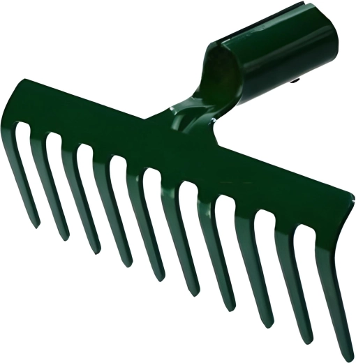Pratique râteau en fer sans manche avec 10 dents résistantes pour l’entretien du jardin. Idéal pour ratisser les feuilles mortes, les débris plus grossiers, les branches coupées et pour niveler la terre. La tête compacte permet un travail précis même dans les zones difficiles d’accès.