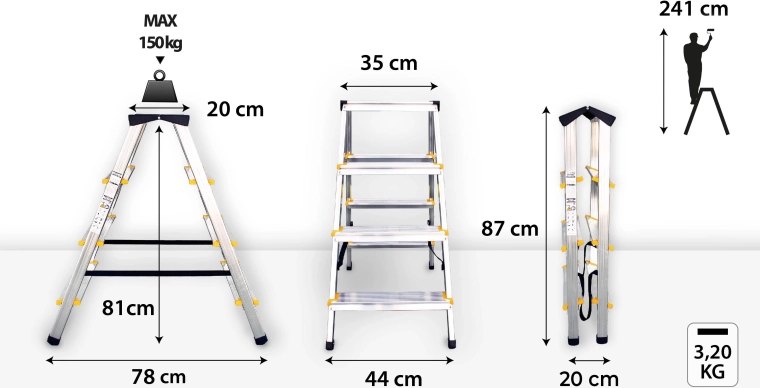 Grâce à sa plateforme de travail confortable et à une charnière pratique empêchant l’ouverture excessive, il est idéal pour la peinture, l’entretien, les montages et les travaux domestiques. Les certifications EN 131 et TÜV Rheinland confirment un haut niveau de sécurité et de qualité.