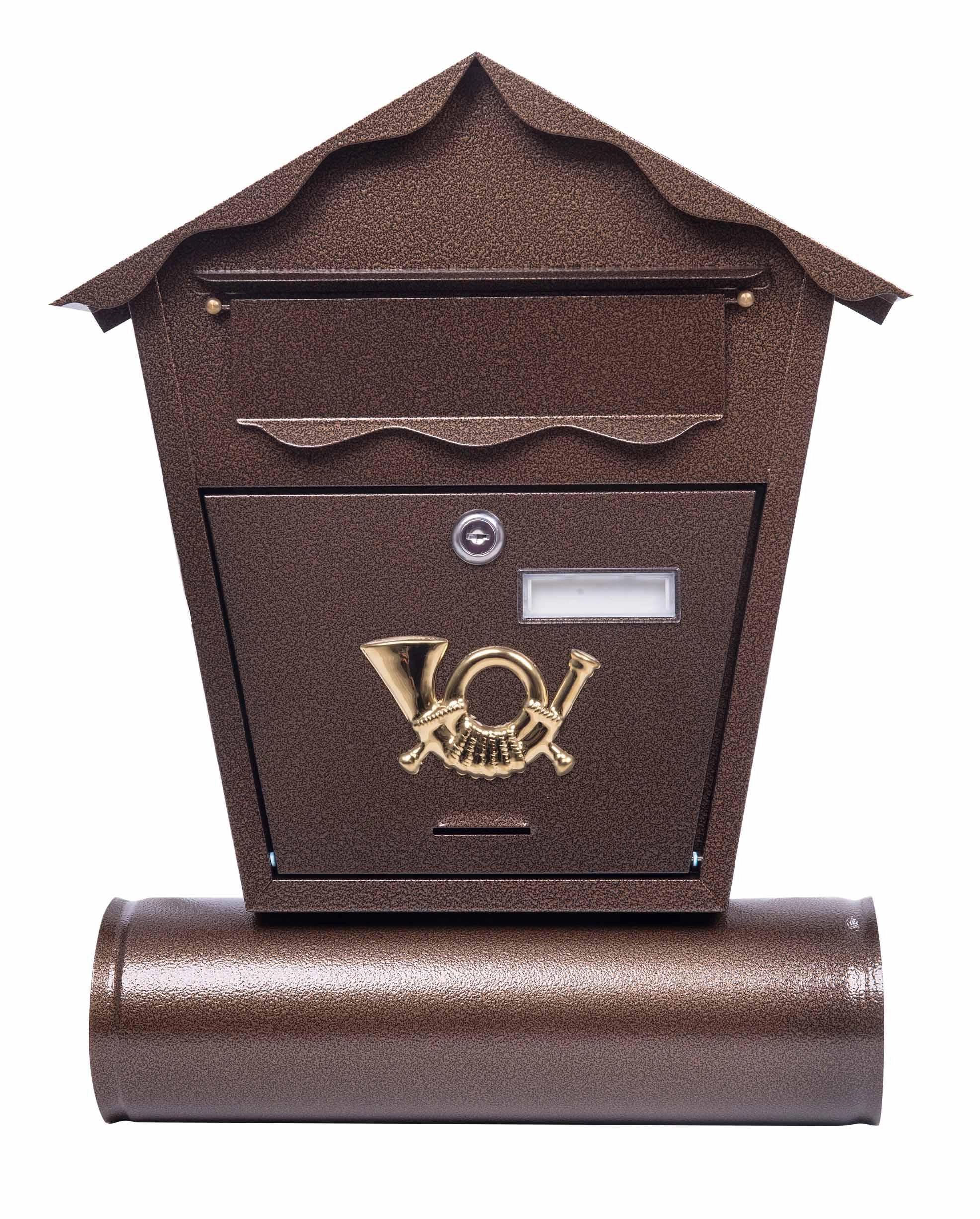 Élégante boîte aux lettres en acier de couleur bronze, au design classique avec toit pointu et tube pratique pour imprimés. Grâce à sa construction robuste, elle convient à une utilisation intérieure et extérieure, se monte facilement sur un mur ou une clôture et est livrée avec 2 clés et le matériel de montage pour une installation rapide.