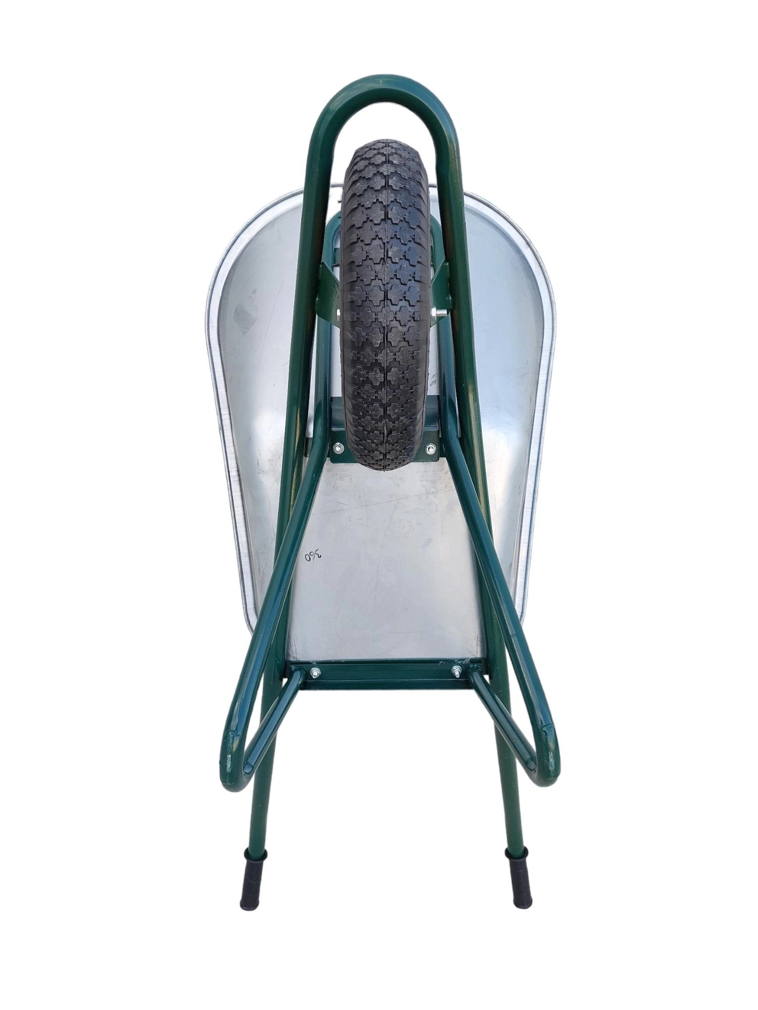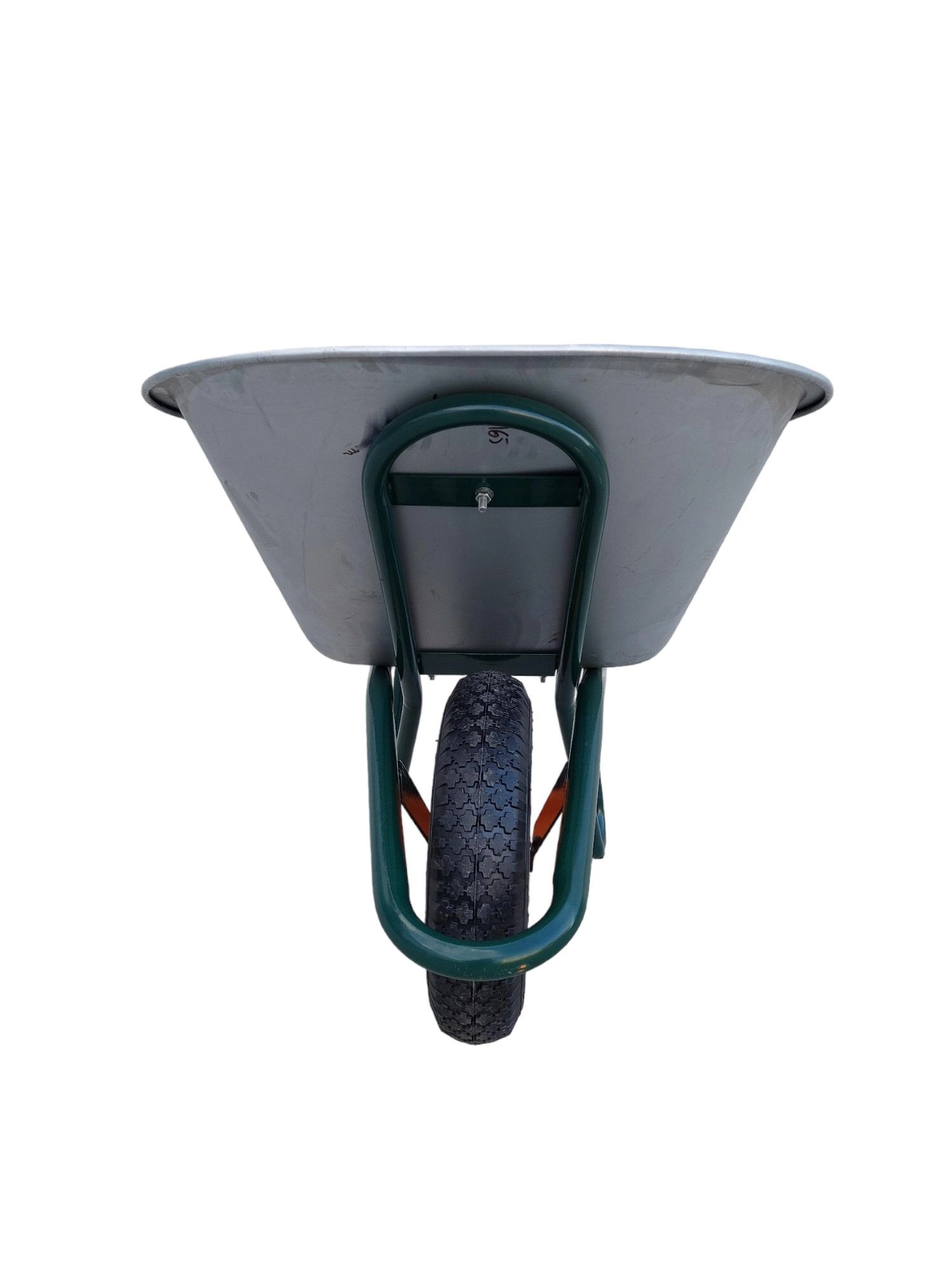 Grande benne en acier avec surface galvanisée, résistante à la corrosion, idéale pour transporter terre, feuilles et petits matériaux de construction.