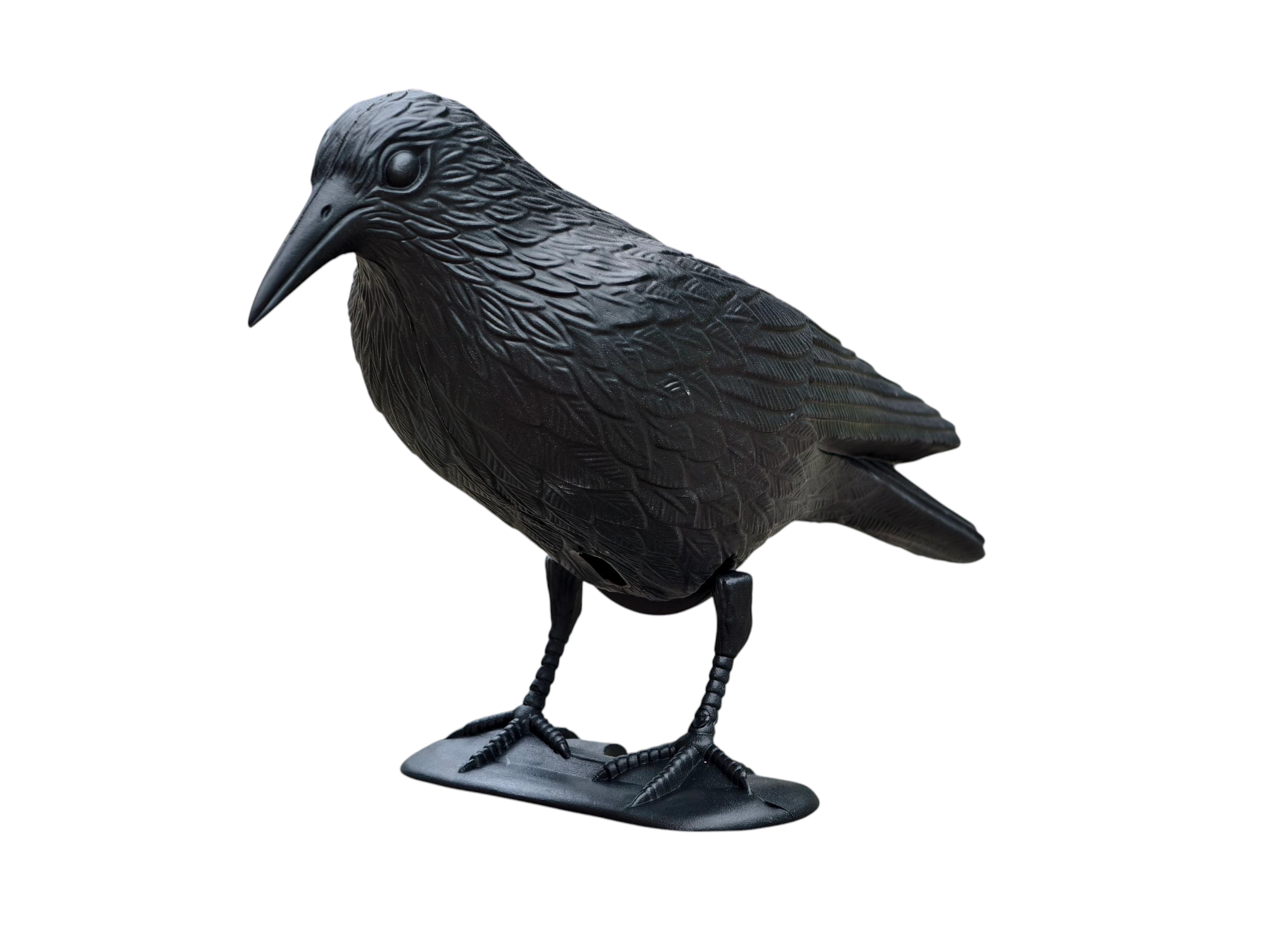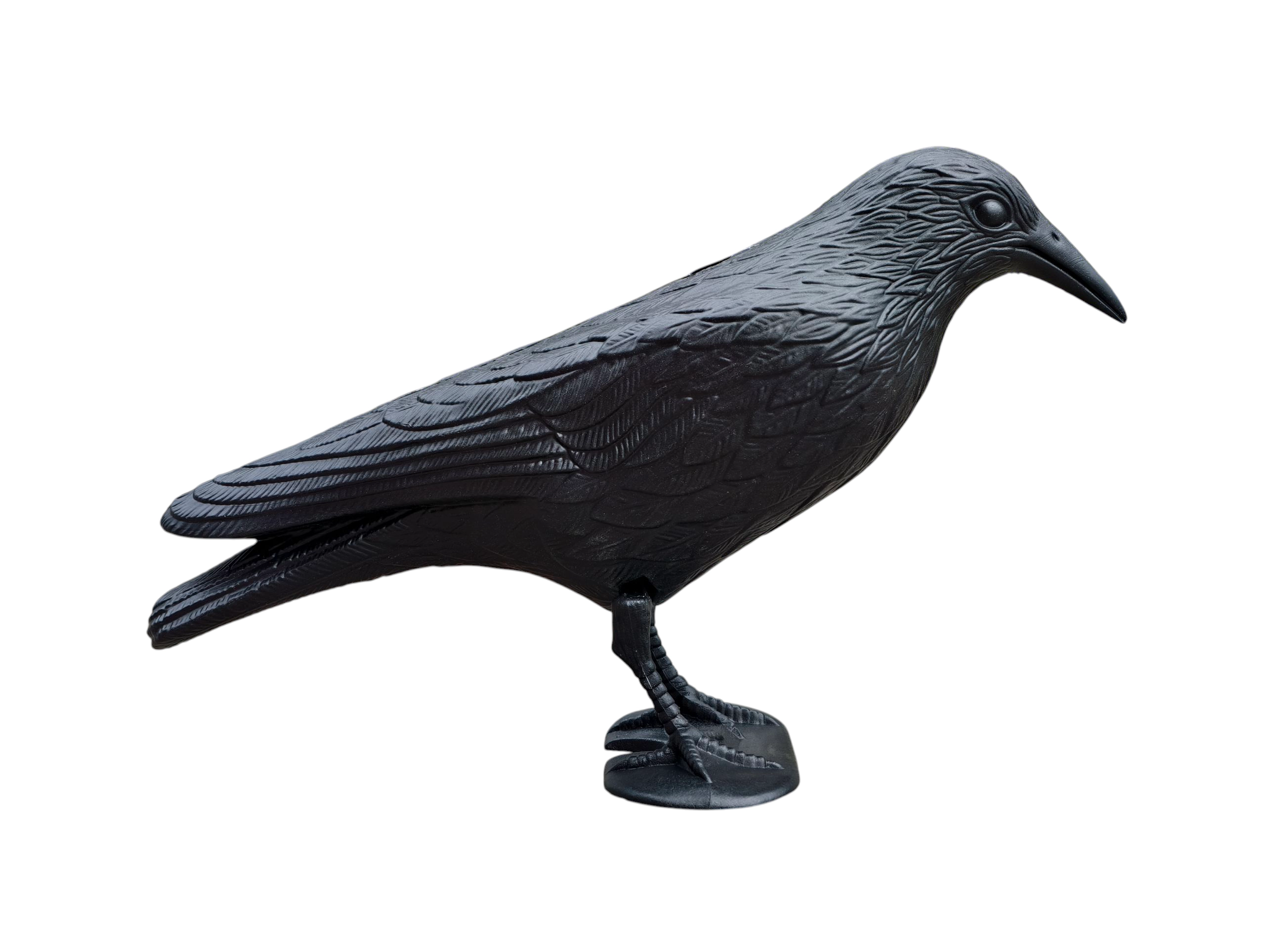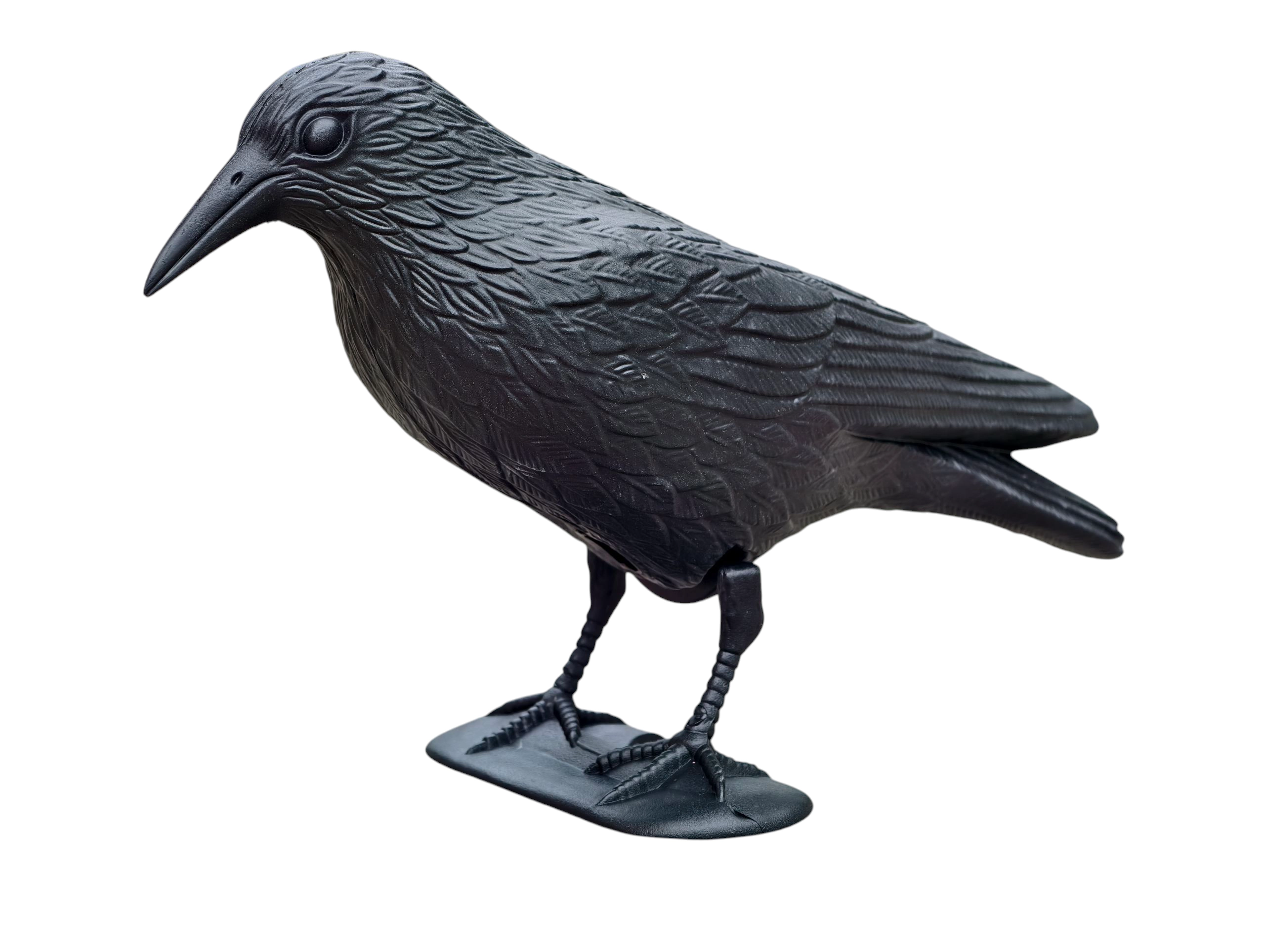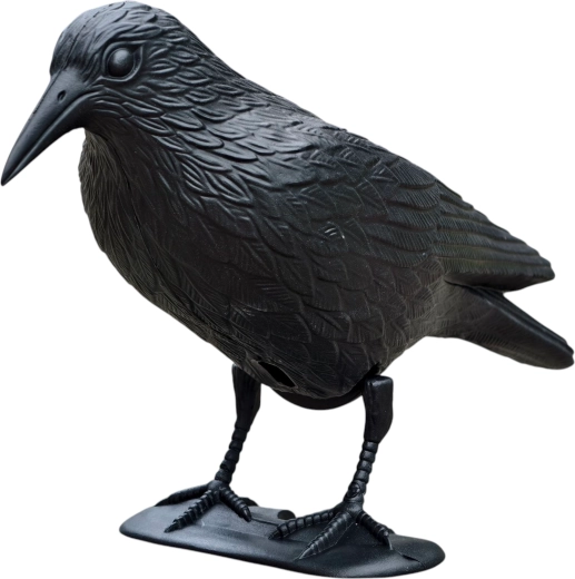 La texture détaillée du plumage et les proportions naturelles imitent un véritable corbeau, renforçant l’effet dissuasif sur les oiseaux indésirables.