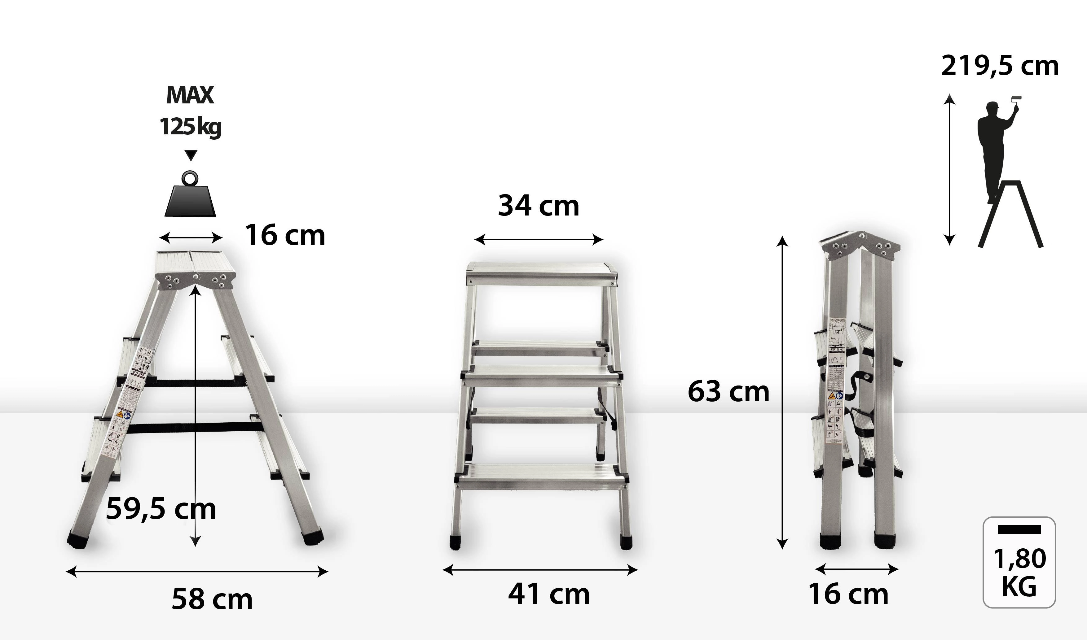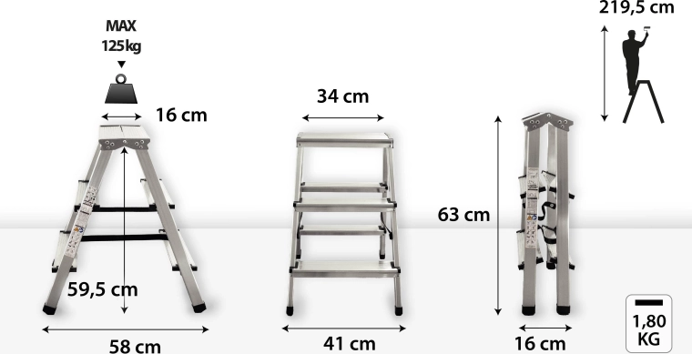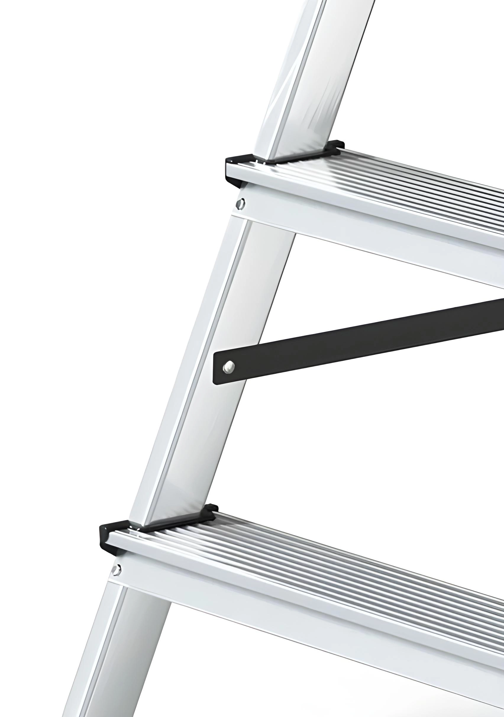 La stabilité est renforcée par des embouts plastiques antidérapants et des renforts qui minimisent le vacillement. Avec une capacité de charge de 125 kg et une hauteur de travail jusqu’à 2,2 m, c’est un excellent choix pour atteindre en toute sécurité les étagères hautes, les fenêtres ou les luminaires de plafond.