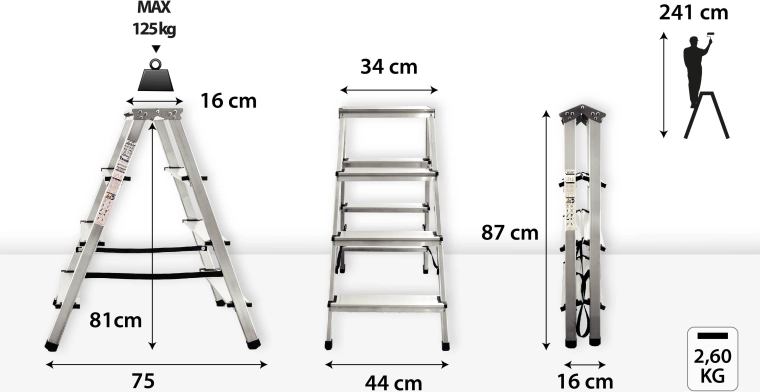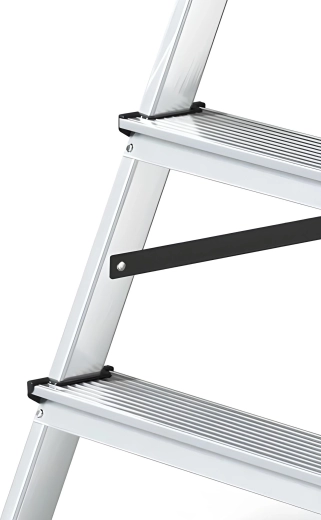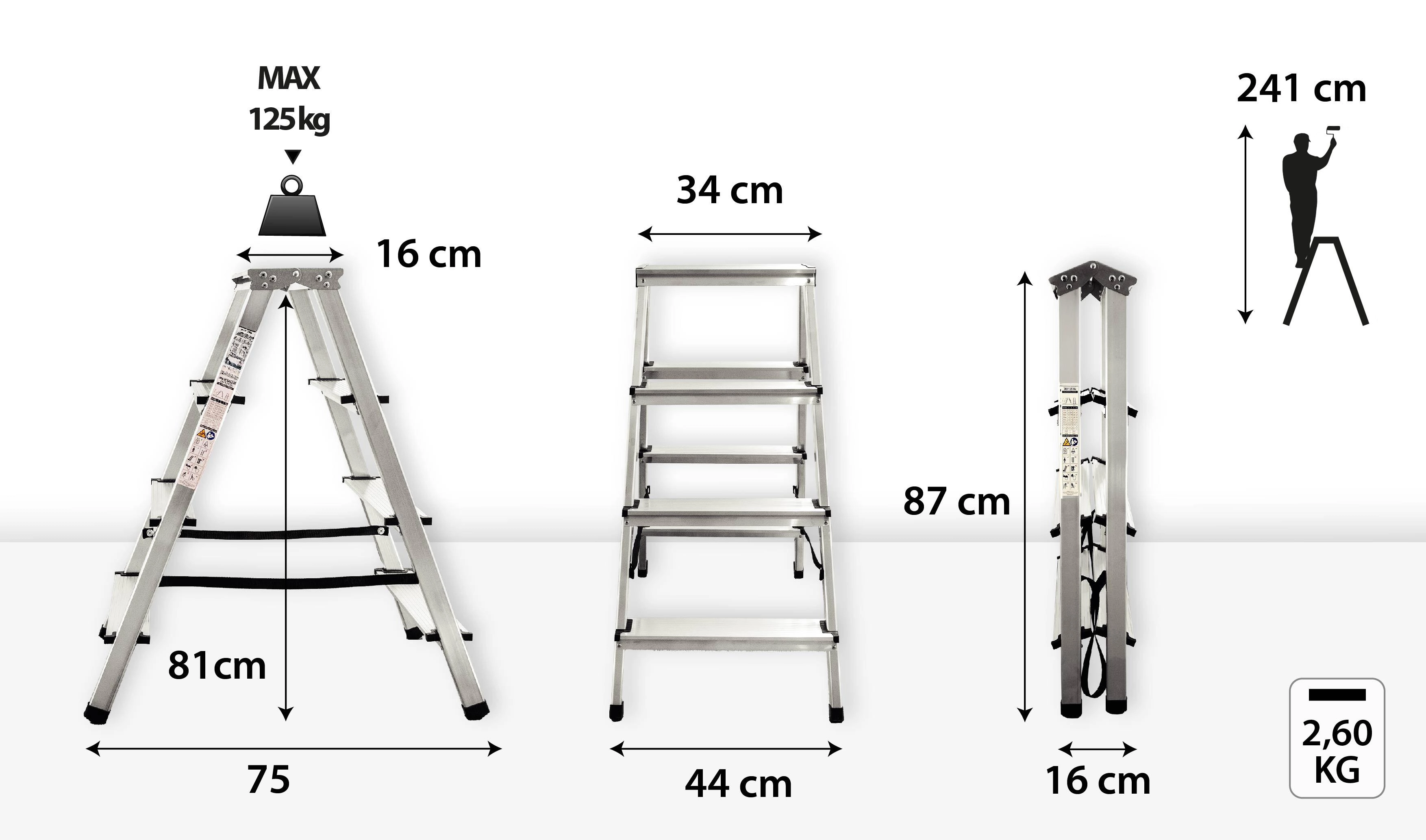 La conception robuste avec une capacité de charge de 125 kg offre une base sûre pour les travaux en hauteur, que vous ayez besoin de peindre, d’atteindre des étagères plus hautes ou d’effectuer de petites maintenances. Grâce à ses dimensions compactes, l’escabeau est facile à ranger et n’occupe que peu d’espace.