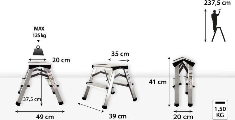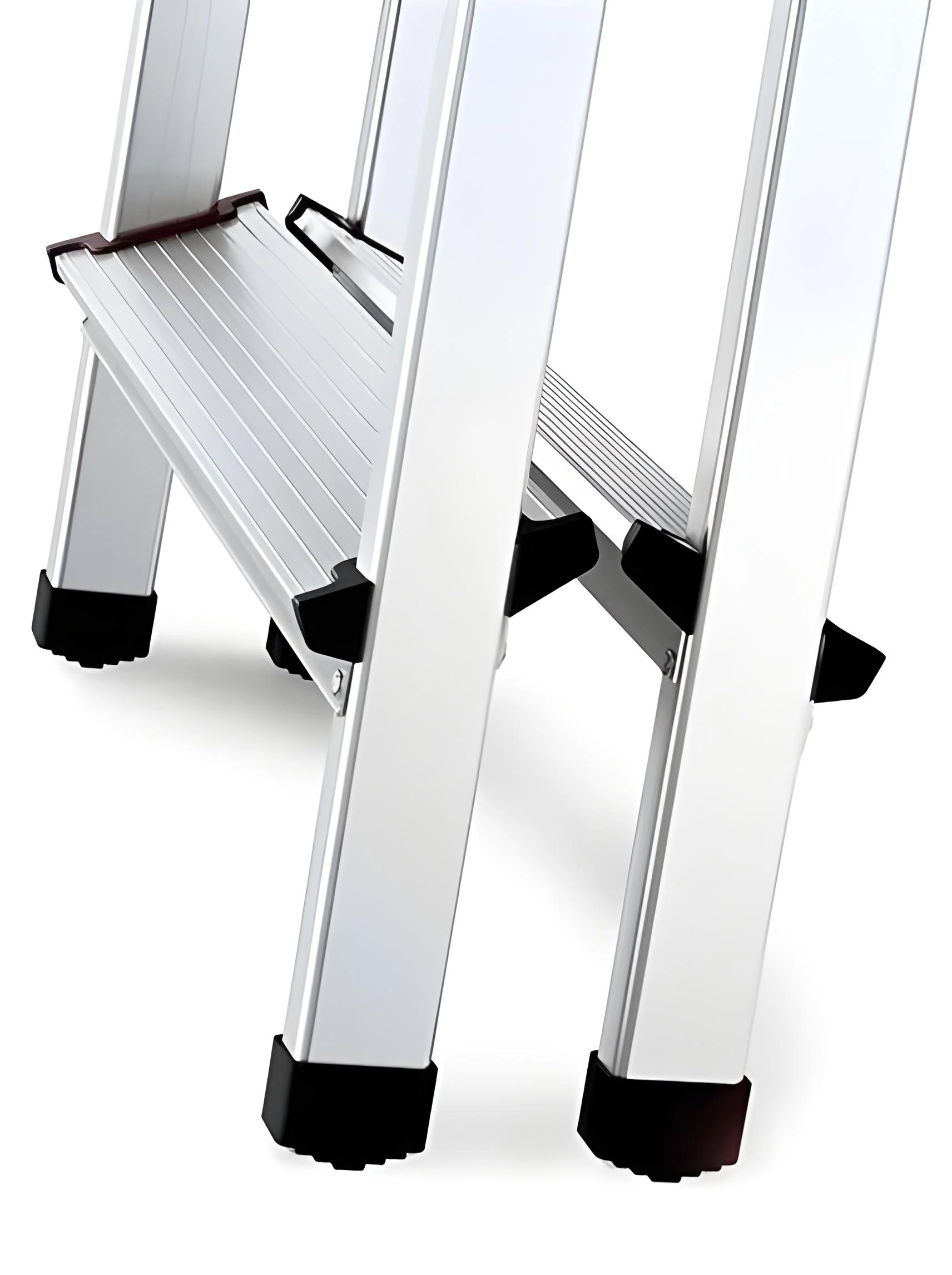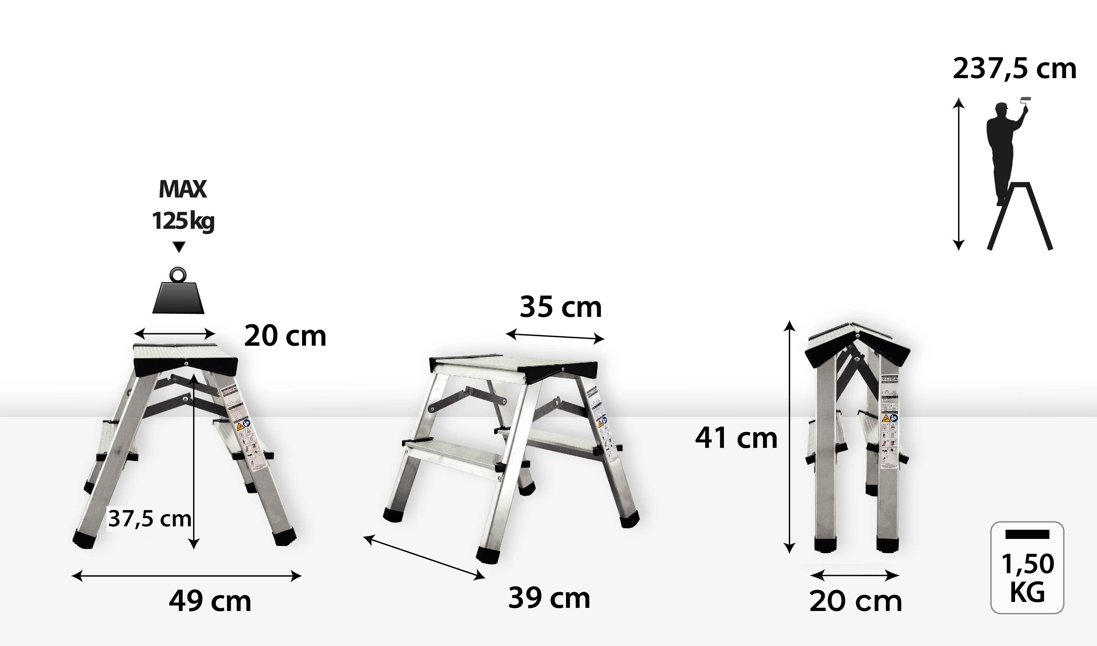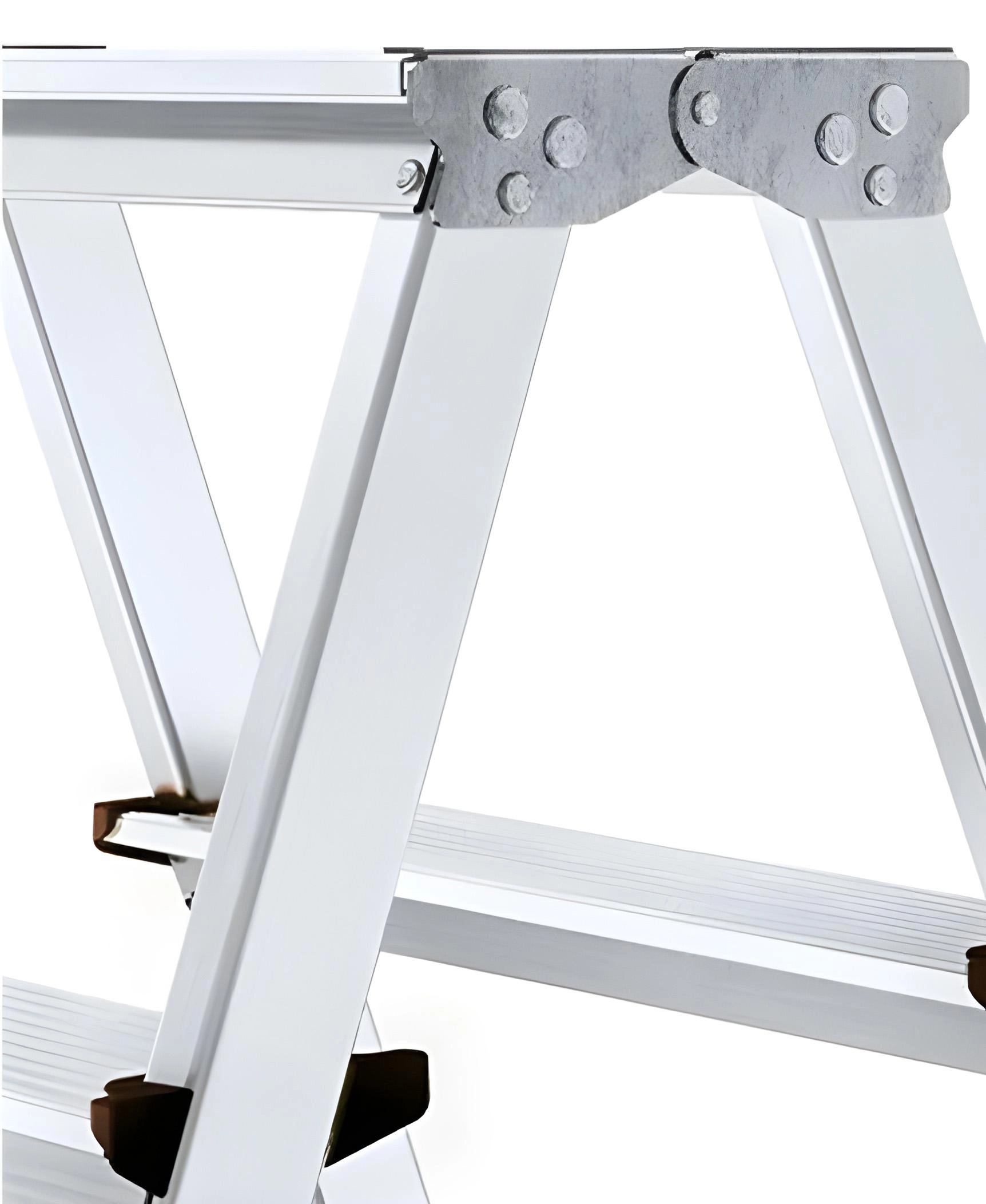 Les marches striées larges et la plate-forme de travail offrent une posture stable, tandis que les embouts plastiques antidérapants protègent le sol et évitent tout glissement involontaire. Avec une capacité de charge de 125 kg et une hauteur de travail jusqu’à 1,98 m, vous réalisez les tâches courantes confortablement et en toute sécurité.
