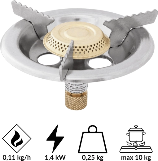 La structure métallique robuste et les trois supports dentés garantissent une excellente stabilité des ustensiles, tandis que les capots de brûleur en acier protègent du vent et améliorent l’efficacité de combustion. Grâce à ses dimensions compactes et à son faible poids de 0,25 kg, le réchaud se transporte facilement et ne prend pas de place dans le sac ni dans la voiture.