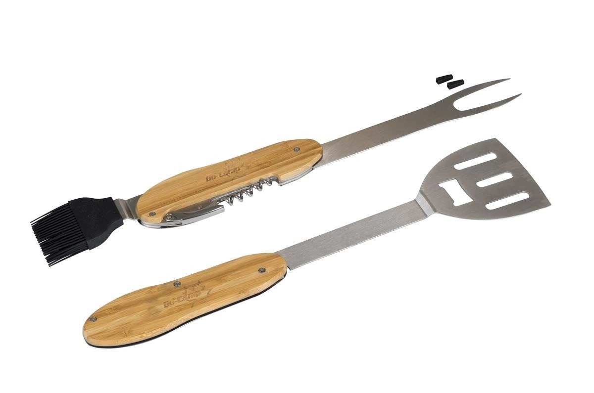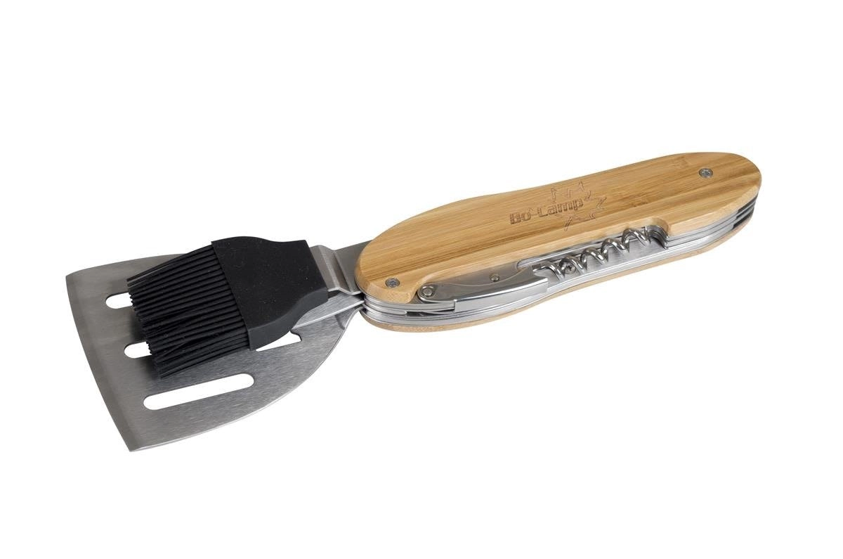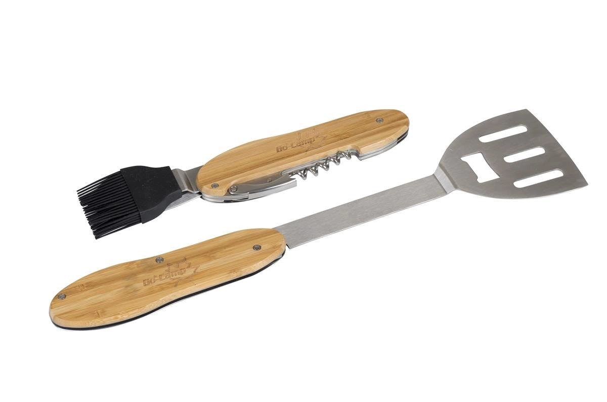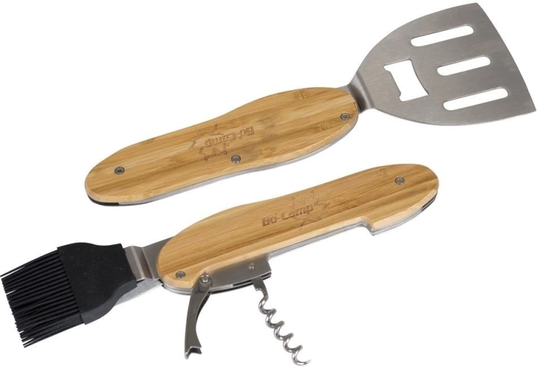 La spatule, la fourchette, le pinceau en silicone, le tire-bouchon et le décapsuleur sont intelligemment intégrés dans un seul set compact. Parfait pour des grillades rapides et bien organisées.