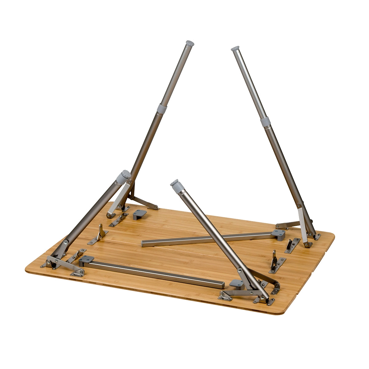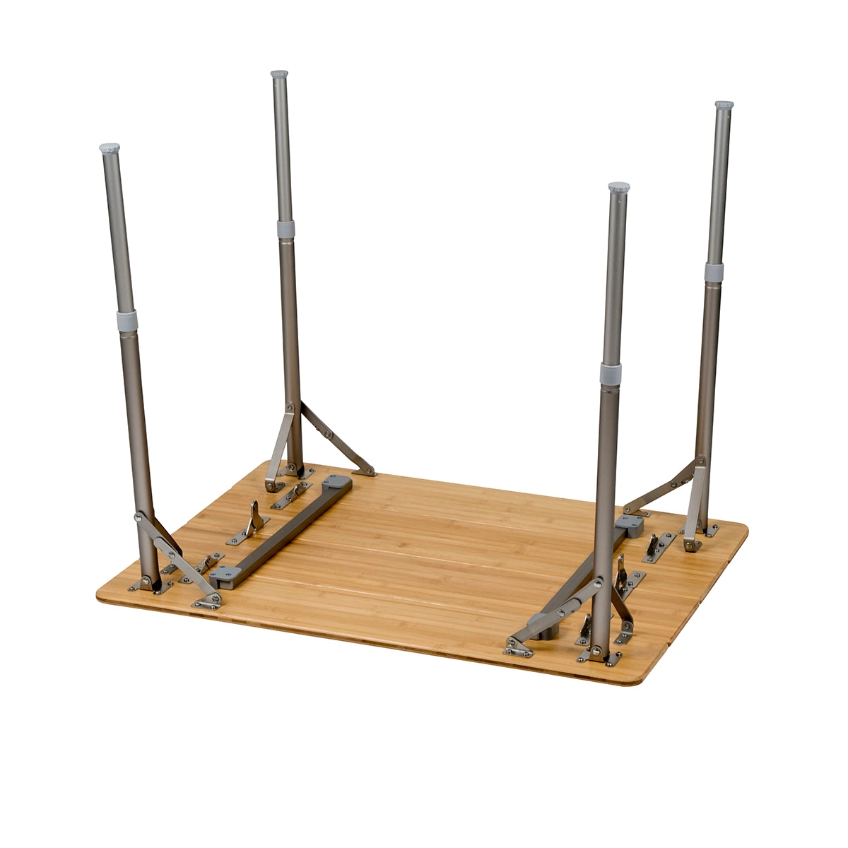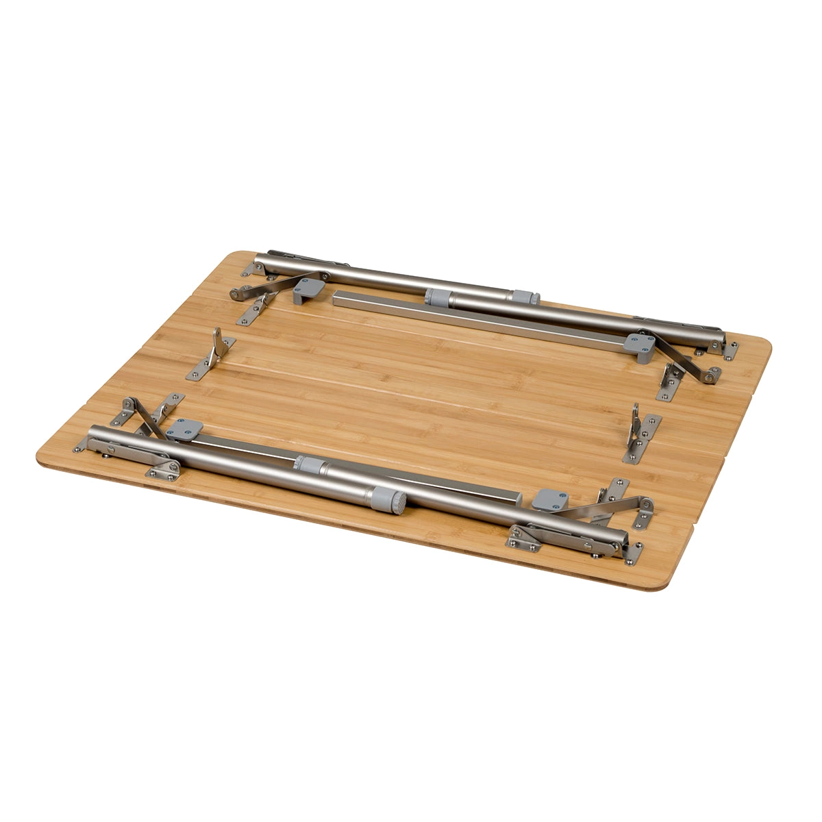 Profitez du confort d’une table partout en plein air. La table de camping pliante avec plateau en bambou naturel 80 × 60 cm et cadre en aluminium robuste offre une stabilité fiable même en usage fréquent. Les pieds télescopiques en aluminium aéronautique permettent d’ajuster rapidement la hauteur de 43 à 65 cm selon les besoins – d’une table basse de service à une hauteur de repas confortable.