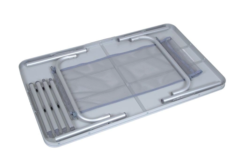 Grâce au réglage précis par vis, vous ajustez facilement la hauteur dans la plage de 36 à 70 cm, et les pieds ajustables assurent la stabilité même sur terrain irrégulier. Elle comprend une poche filet suspendue sous le plateau pour ranger facilement vos accessoires. Une fois l’activité terminée, la table se plie en un clin d’œil – les pieds dévissables et le profil fin une fois pliée (100 × 60 × 3,5 cm) facilitent le transport et le stockage. Une poignée confortable de transport est intégrée.