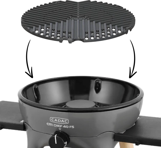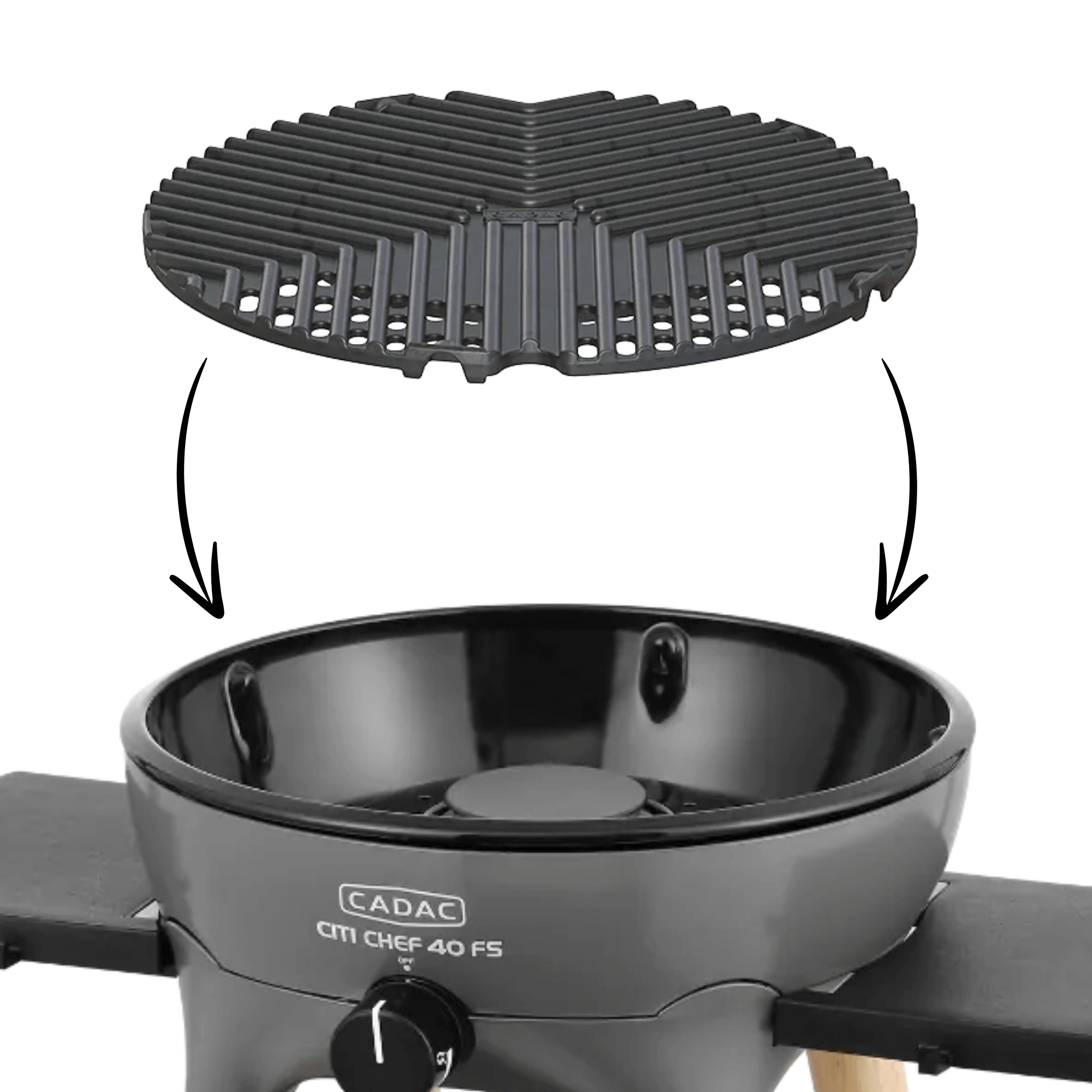 La grille est conçue pour être parfaitement compatible avec les modèles Citi Chef 40 et Carri Chef 40. Légère mais résistante, elle se manipule aisément, et la housse fournie protège la grille pendant le rangement et le transport.