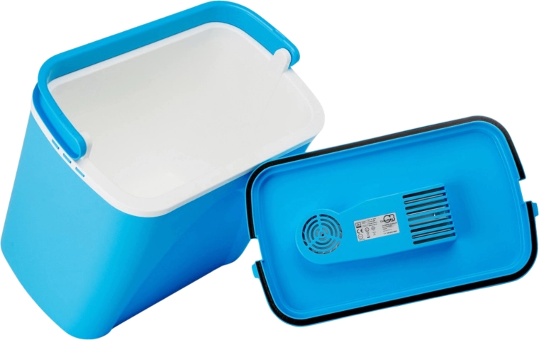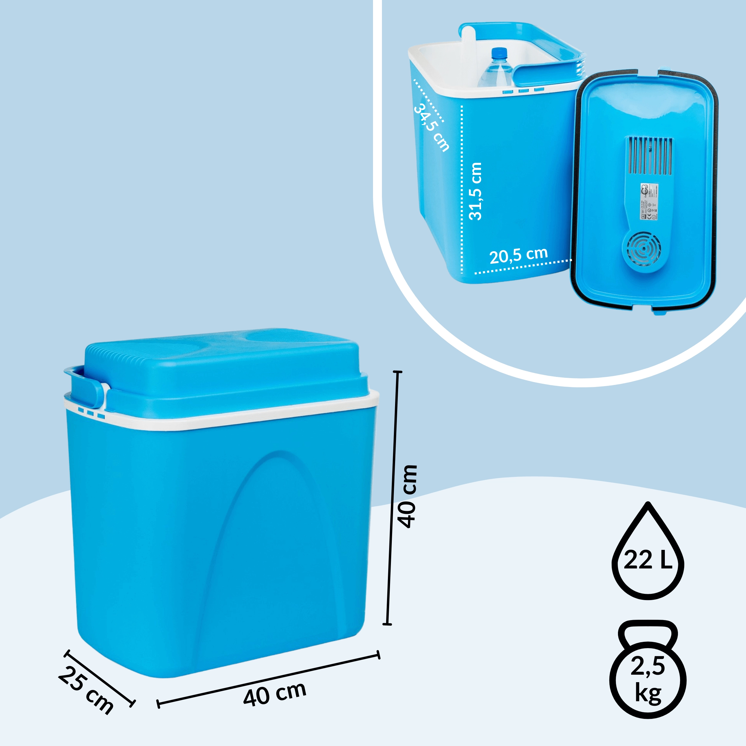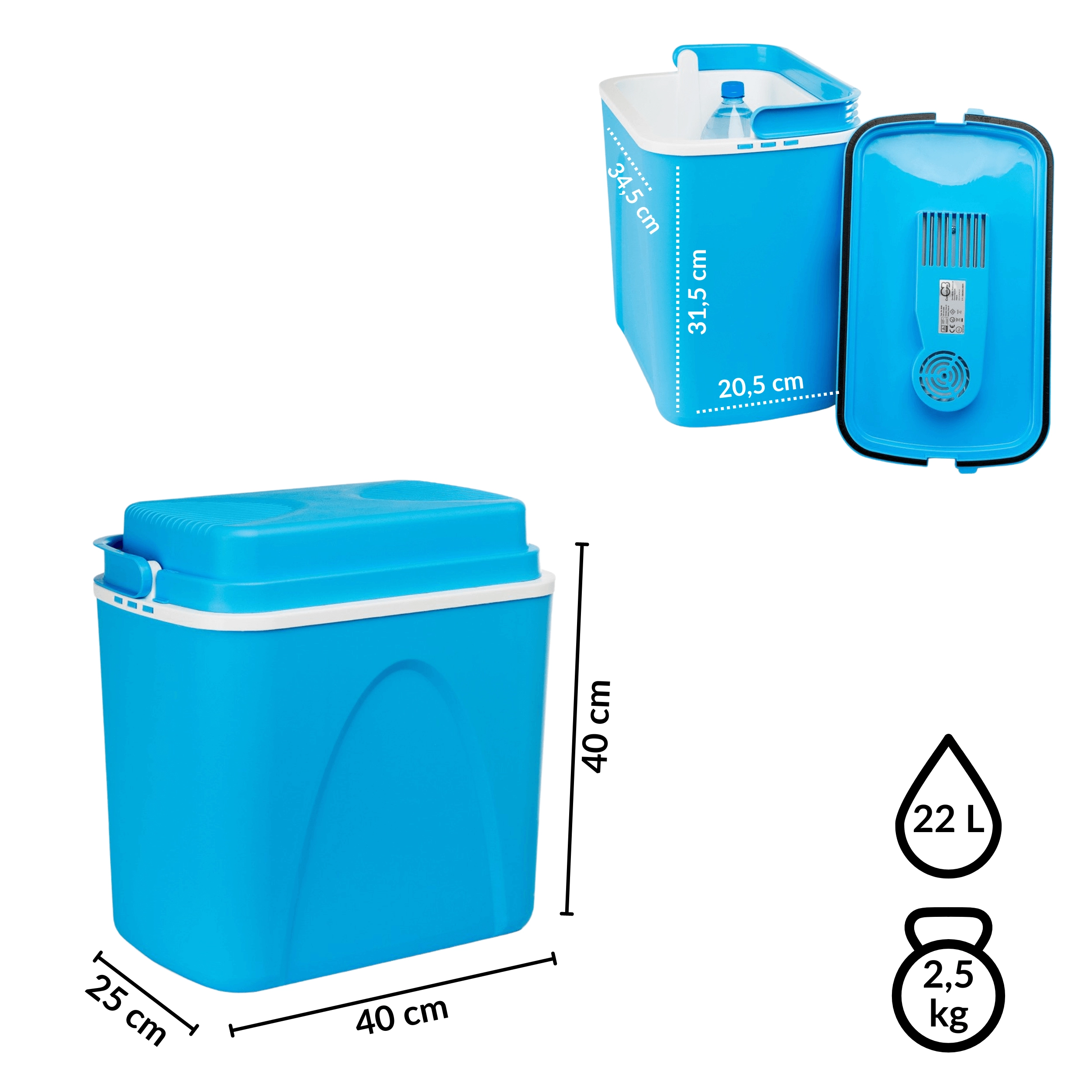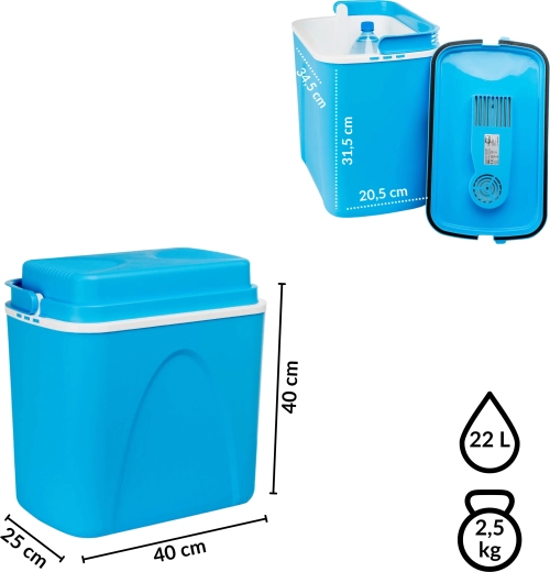 Des dimensions bien pensées permettent de placer des bouteilles de 1,5 l à la verticale et d’organiser clairement en-cas et boissons. La coque légère mais solide en polypropylène est résistante et facile à nettoyer. Son design bleu élégant s’intègre parfaitement à la plage, au camping et dans le coffre de la voiture.