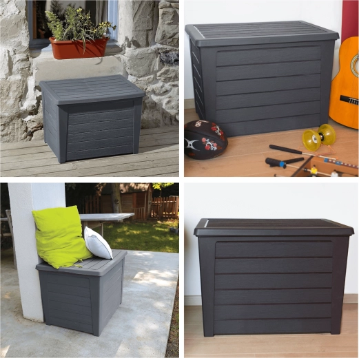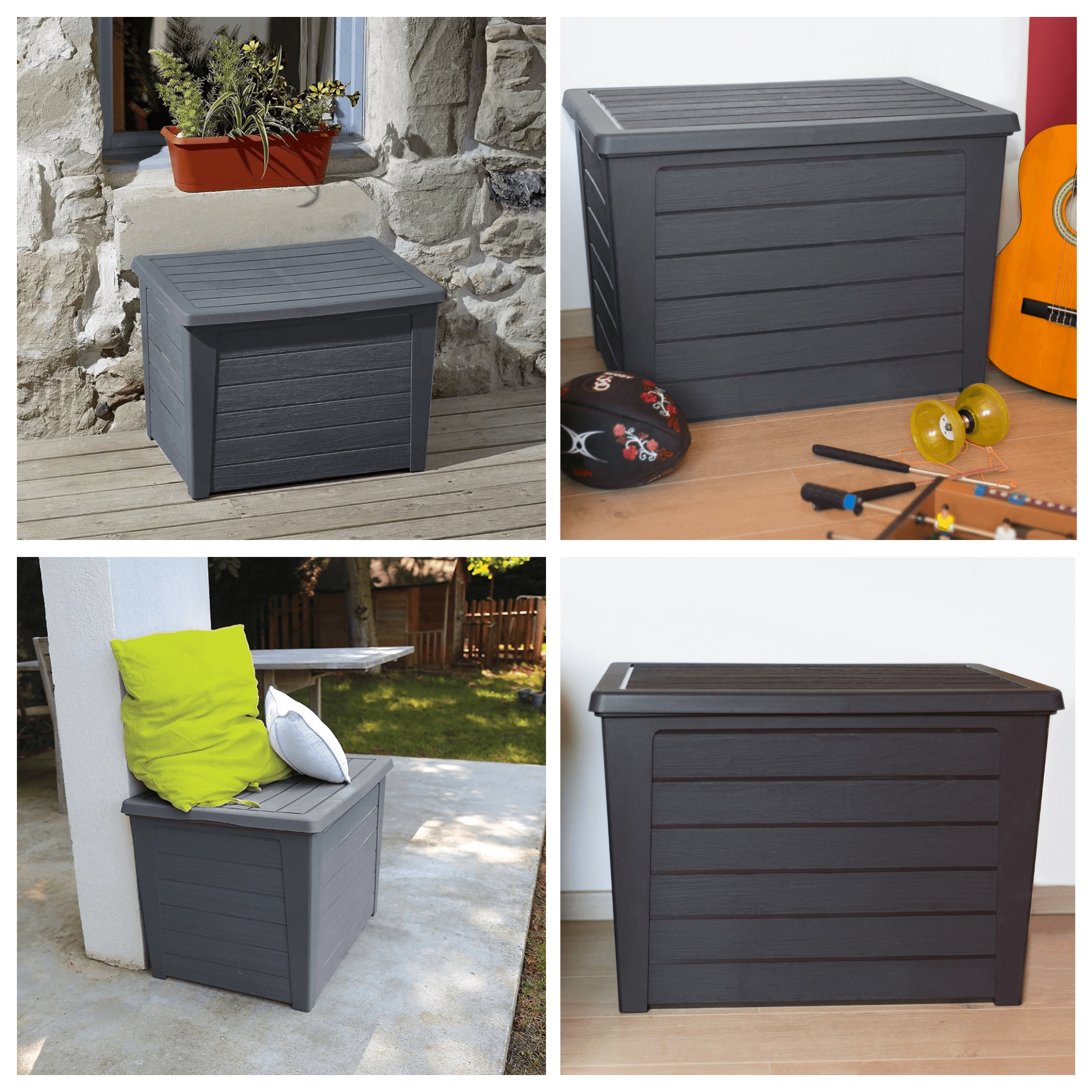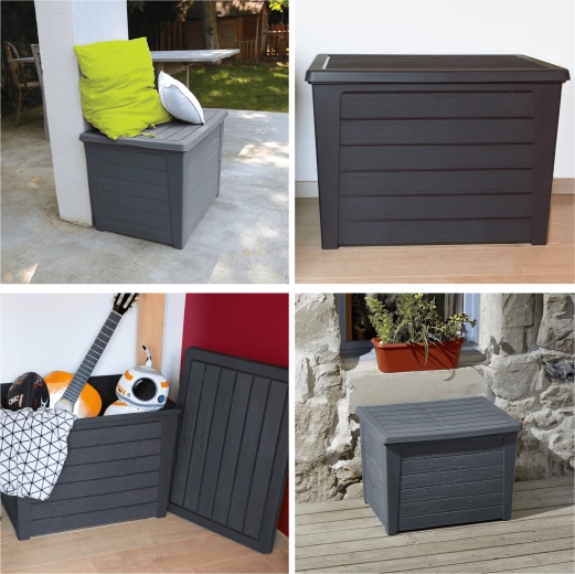 Ce coffre pratique maintient l’ordre sur la terrasse, le balcon et à l’intérieur, et peut aussi servir de surface d’appoint.