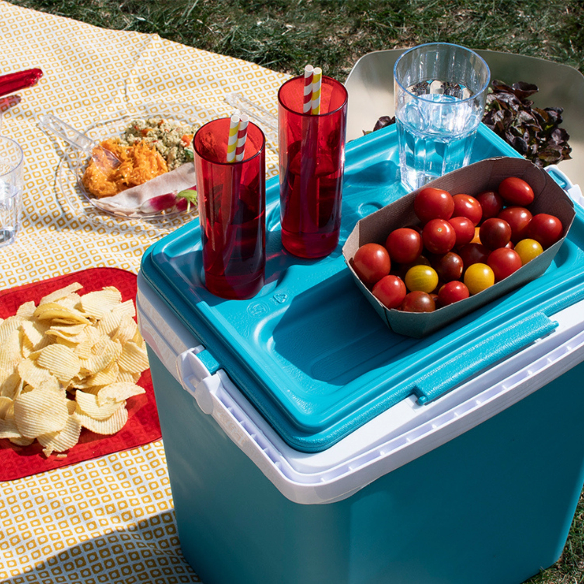• Couvercle pratique avec 4 porte-gobelets ou canettes intégrés.