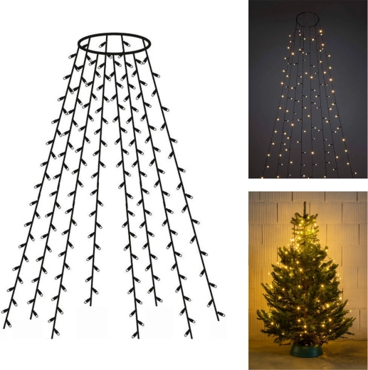 Créez une atmosphère festive et magique avec un rideau lumineux pour sapin doté de 300 LED blanc chaud. Installation facile grâce à l’anneau de montage, 12 guirlandes de 2,5 m pour une répartition uniforme de la lumière, long câble d’alimentation de 5 m et minuterie 6/18 h pratique. Convient à l’intérieur comme à l’extérieur (IP44), économe en énergie et prêt à illuminer vos fêtes de fin d’année.