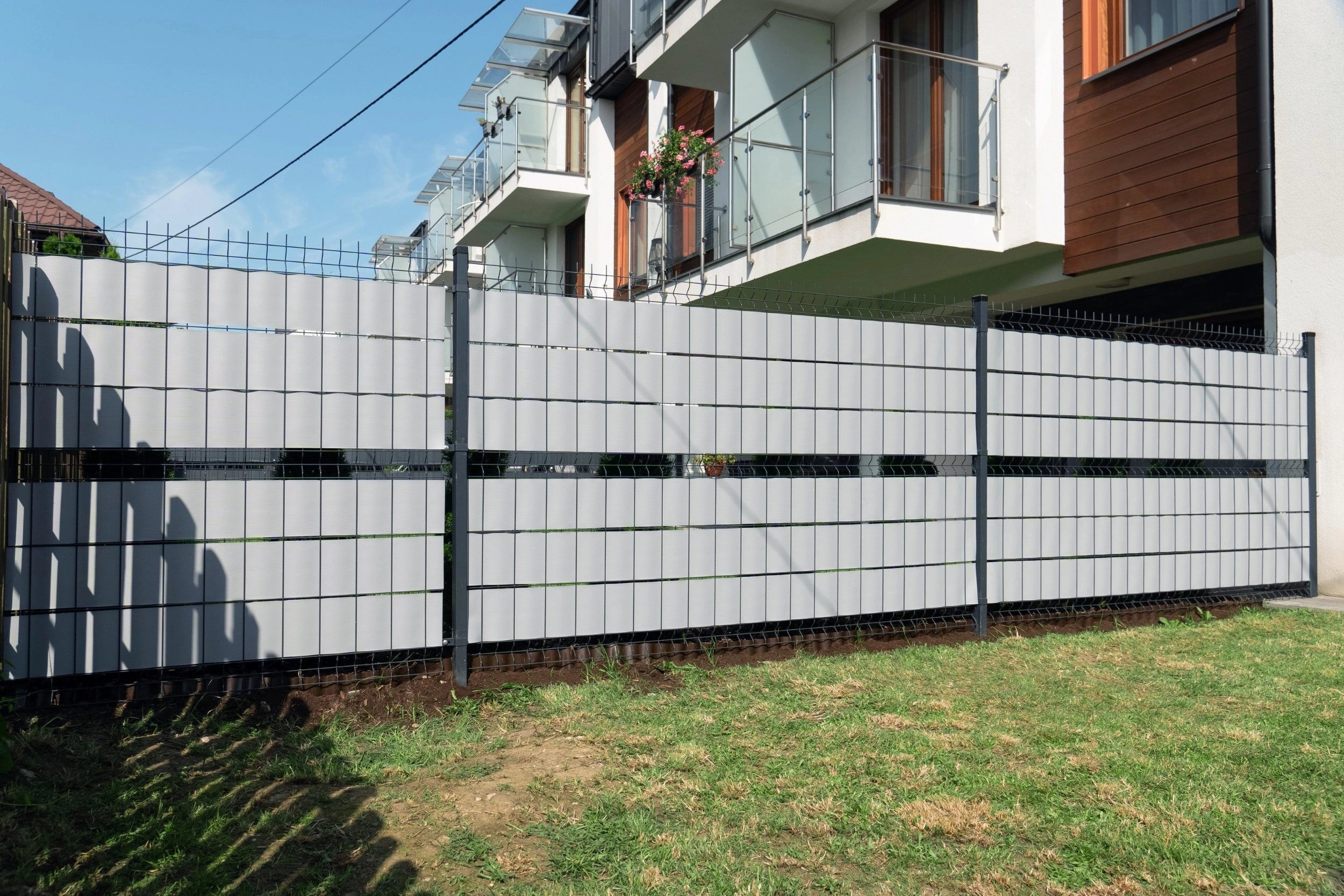 La teinte grise moderne RAL 7040 unifie l’apparence de la clôture et lui confère un caractère représentatif. La bande présente sur les deux faces la même structure BASIC et offre une intimité maximale ainsi qu’une barrière partielle contre le bruit et le vent. L’installation se fait soi-même en trois étapes, sans outils spéciaux.
