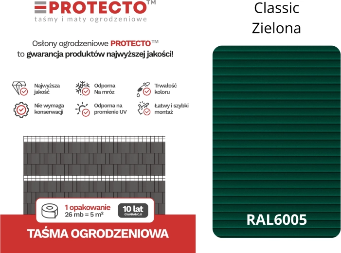 Le matériau PP stabilisé UV résiste au soleil, au gel, à l’humidité et aux saletés. La bande conserve durablement sa couleur RAL 6005 et sa forme.