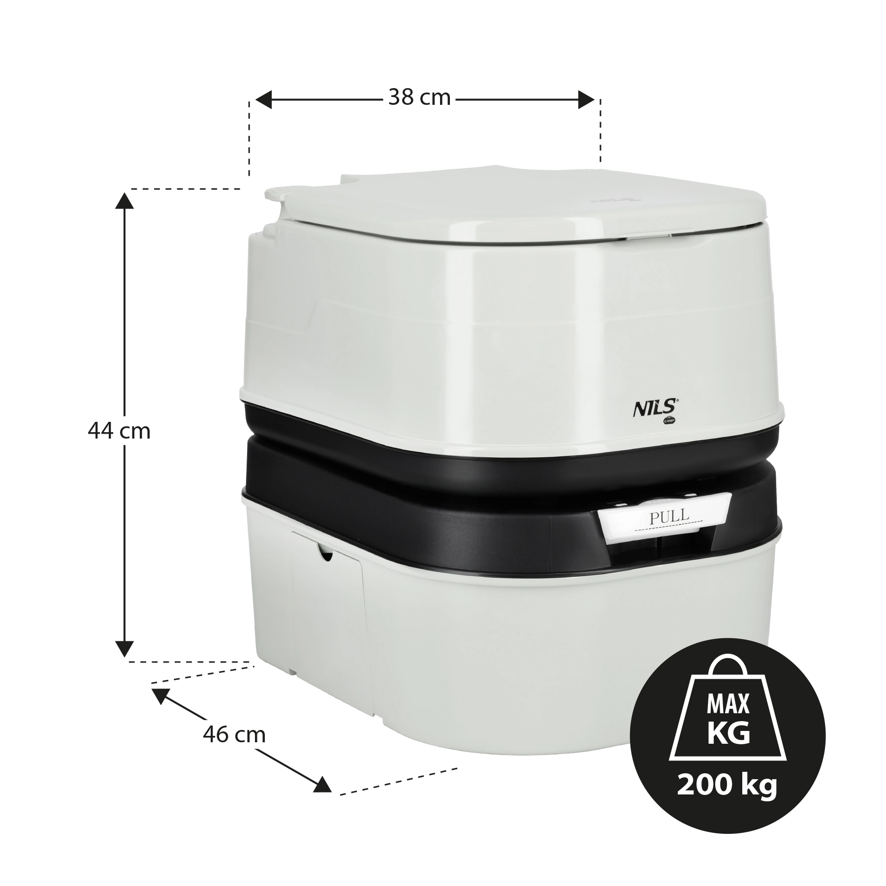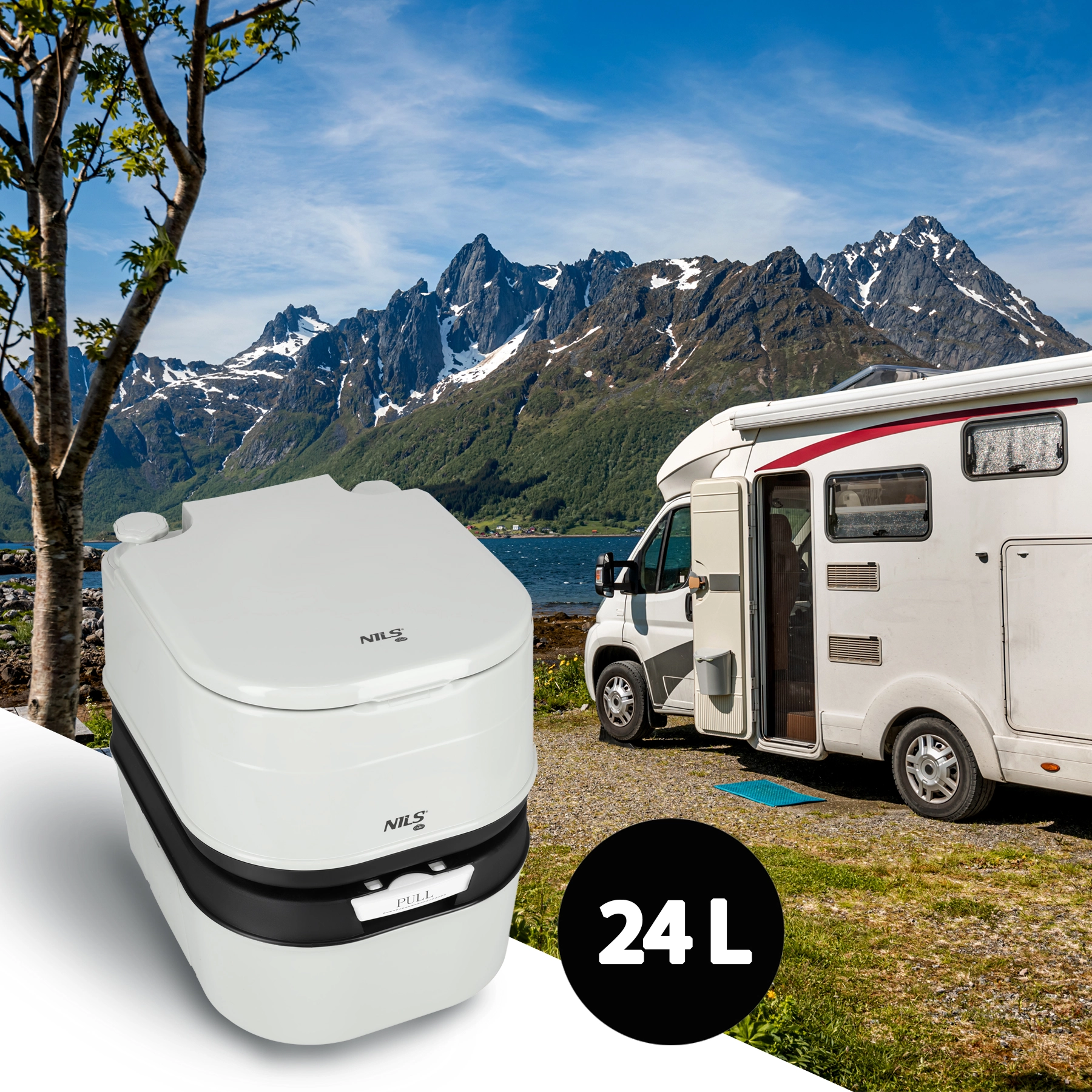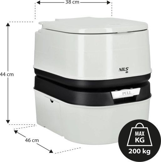 La toilette portable NILS Camp avec réservoir d’eaux usées de 24 l et réservoir d’eau propre de 20 l offre un confort maximal, une longue autonomie sans vidange et un indicateur de remplissage. Grâce au rinçage manuel, à la vanne coulissante étanche et à la construction robuste, elle est idéale pour le camping, les camping-cars, les bateaux et comme solution d’appoint.