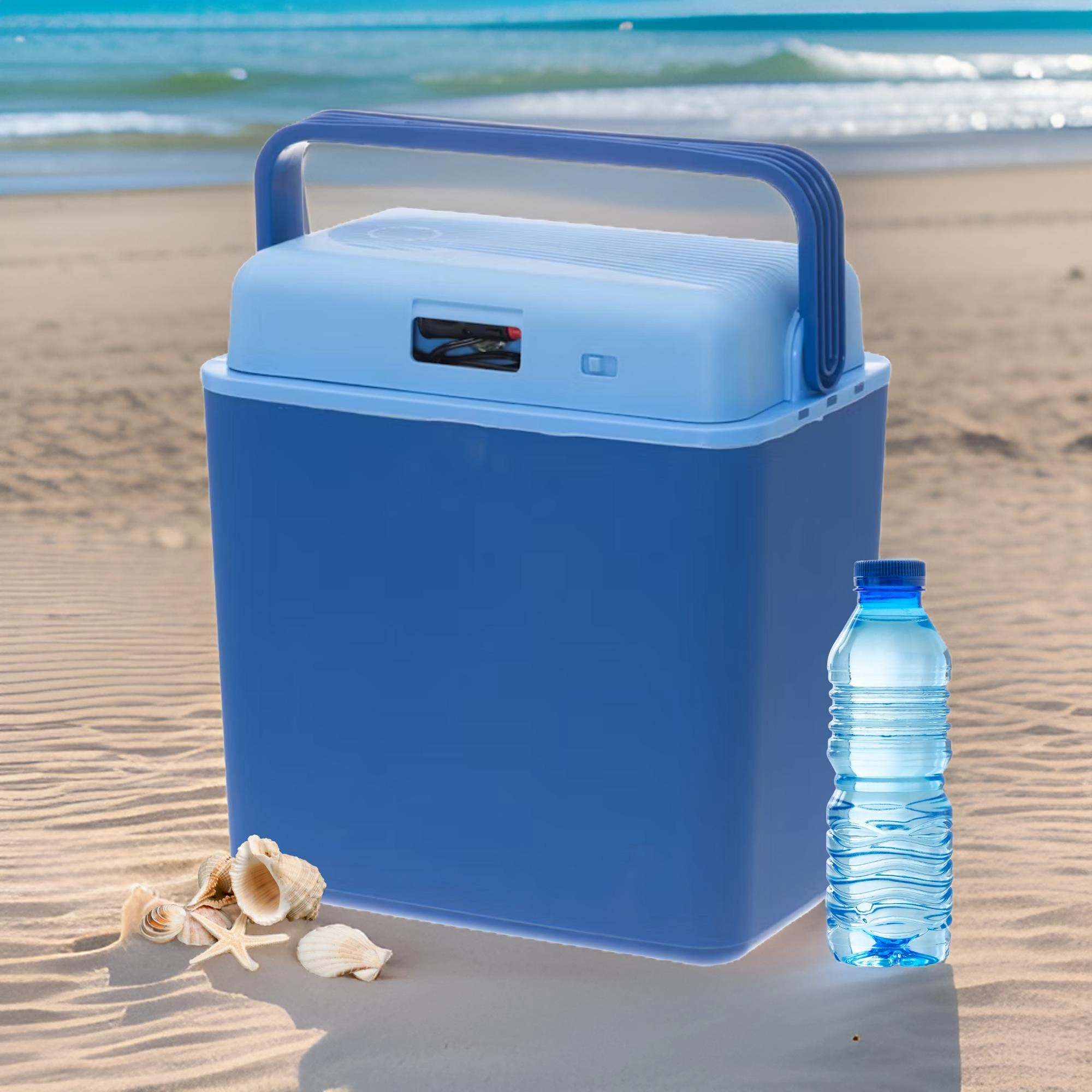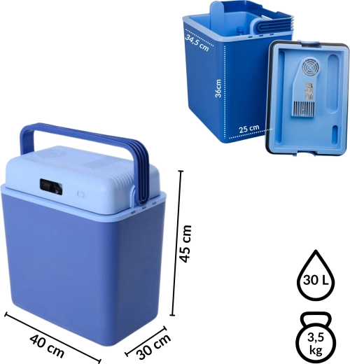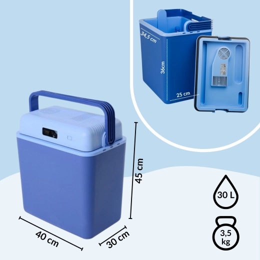 Glacière auto portable pratique de 30 l alimentée par une prise 12 V du véhicule, pour garder vos boissons et aliments au frais pendant le trajet. Elle utilise un module Peltier pour un refroidissement efficace sans produits chimiques nocifs, offre un intérieur spacieux permettant de placer des bouteilles de 1,5 l en position verticale et dispose d’une construction solide et résistante avec une poignée à verrouillage et un ventilateur intégré pour une circulation d’air homogène.