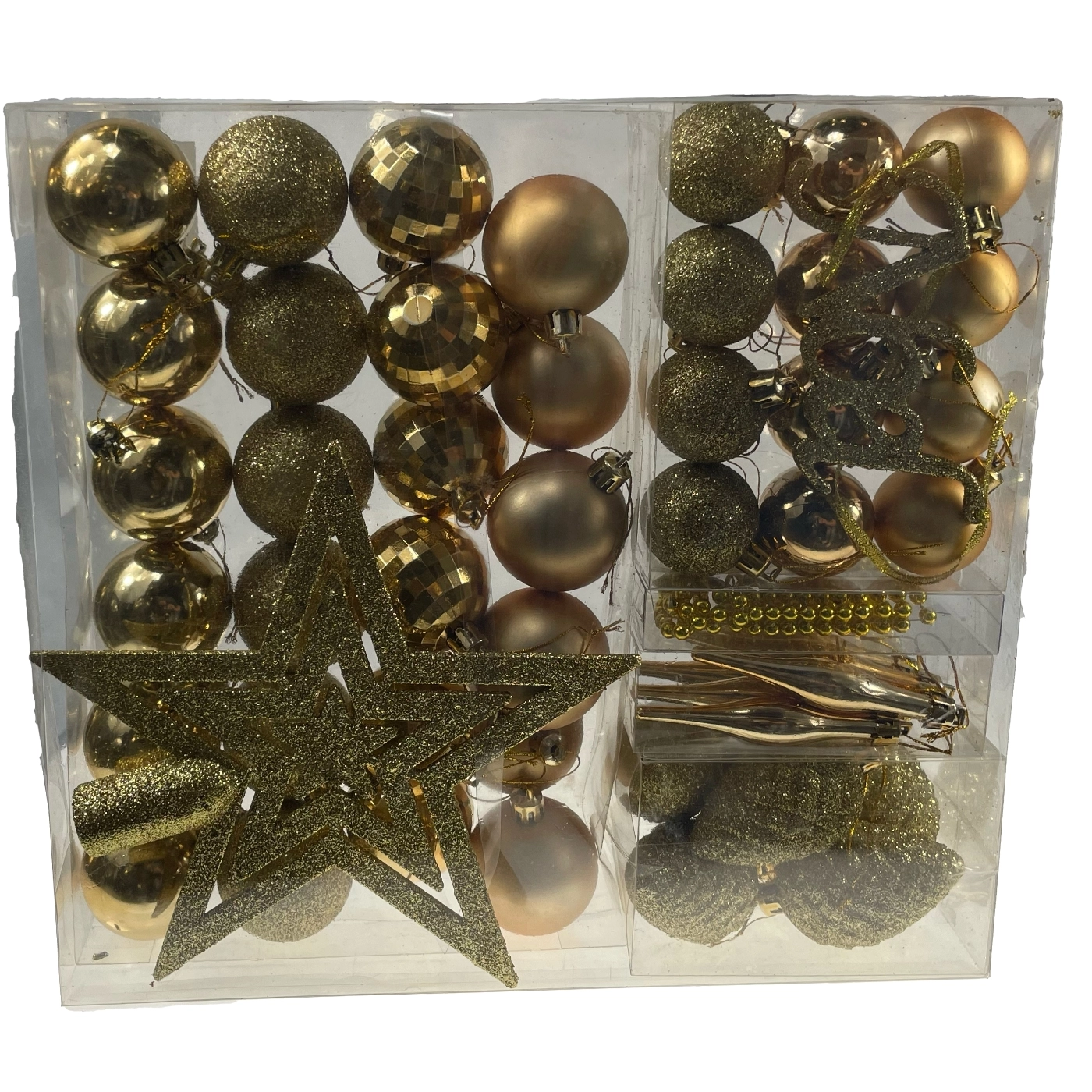 - Solution complète – boules, étoile de cime et guirlande de perles dans un seul coffret.
