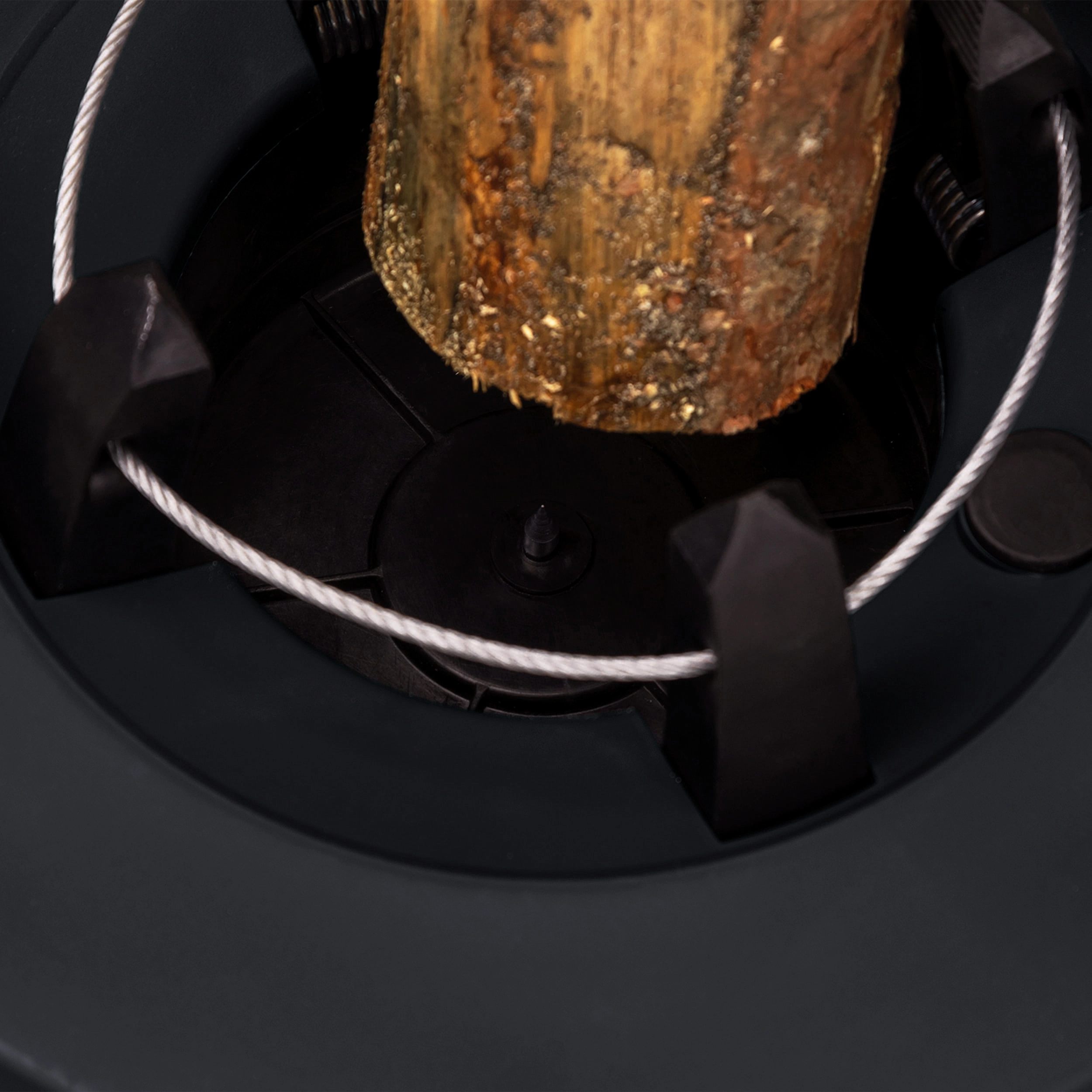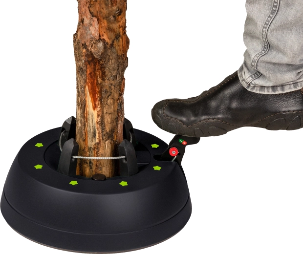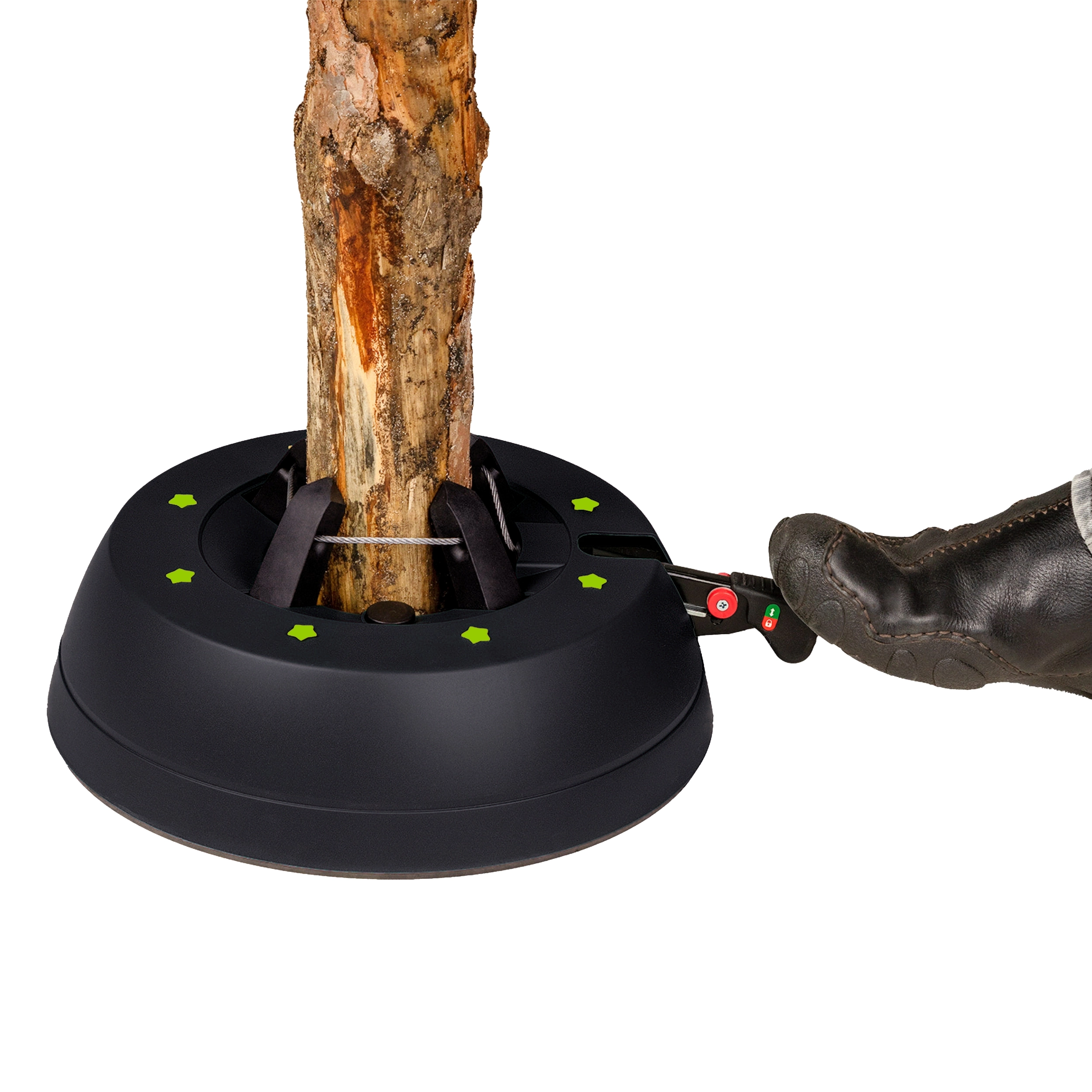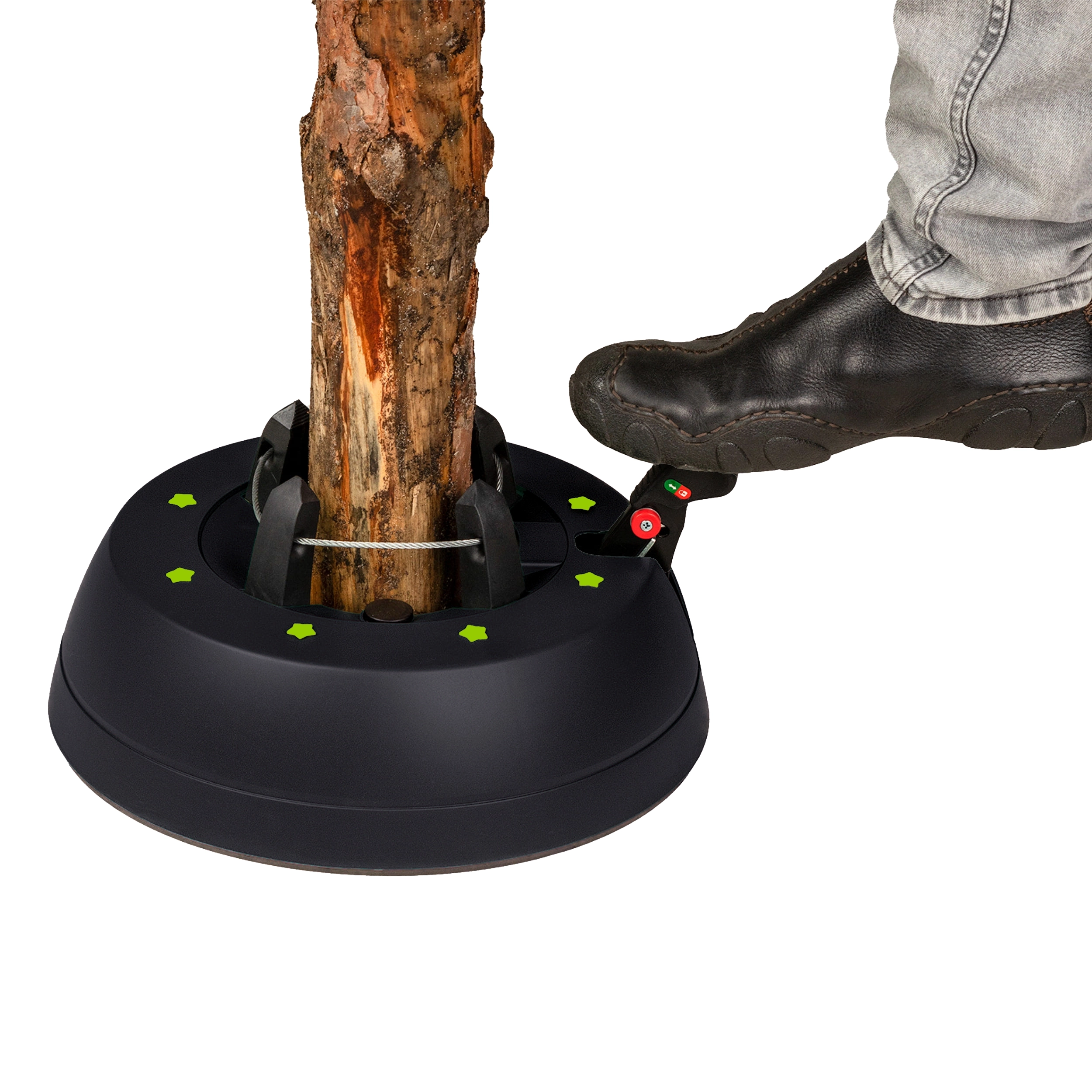 Placez le tronc sur la pointe centrale et actionnez le levier : les mâchoires intérieures se resserrent immédiatement autour de l’arbre via le câble en acier. Le verrou du levier empêche tout desserrage accidentel.