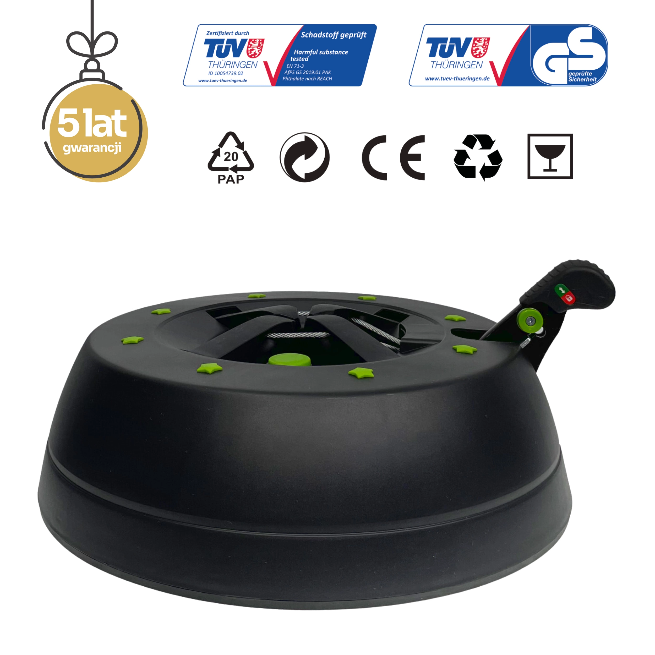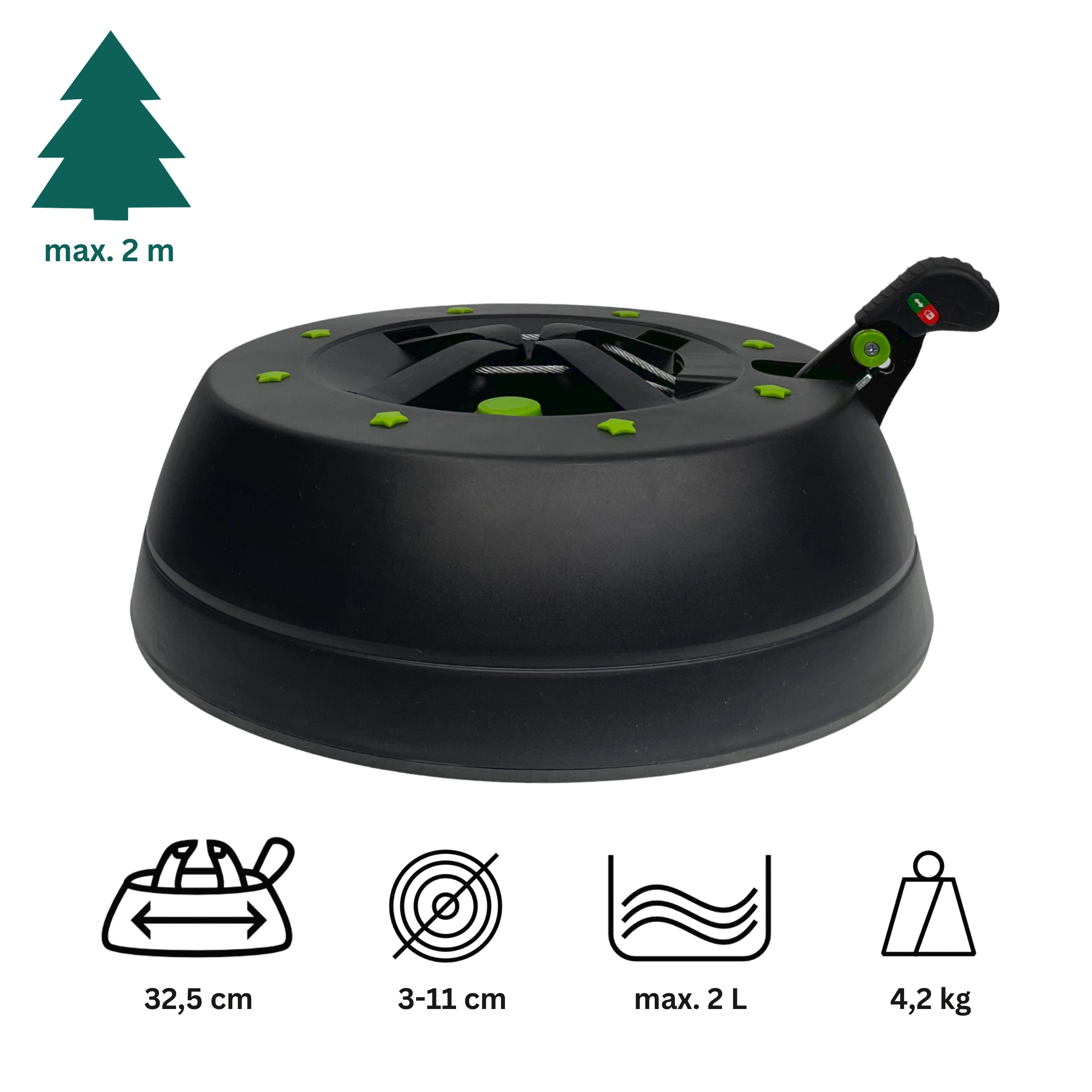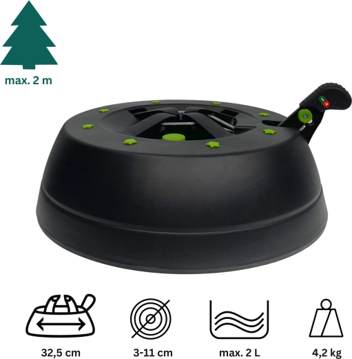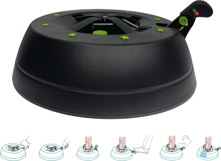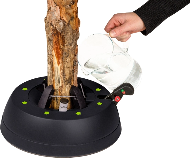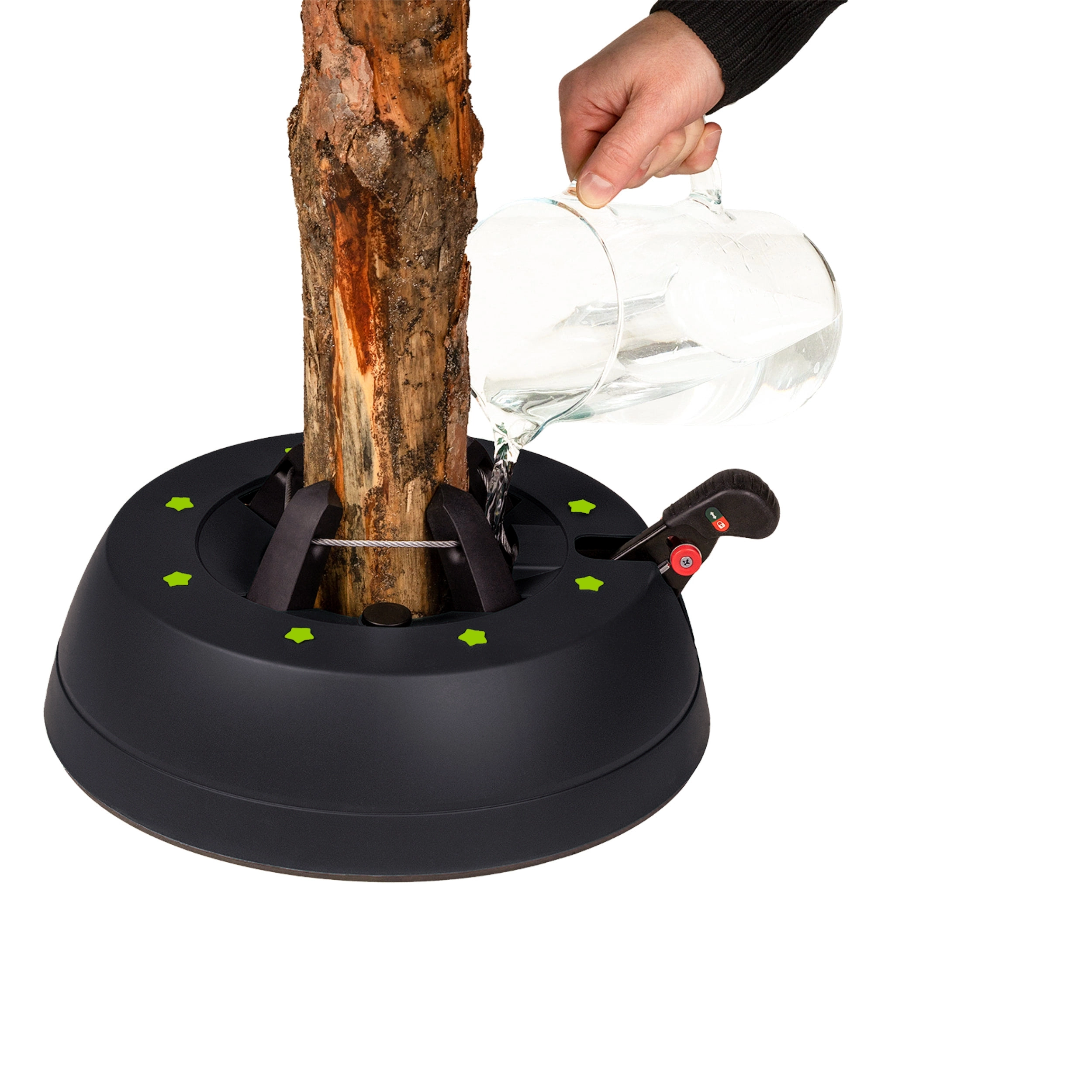 Grâce au levier de serrage rapide, vous installez l’arbre en un rien de temps : placez le tronc sur la pointe centrale, appuyez/soulevez le levier plusieurs fois et les mâchoires se resserrent automatiquement. Le réservoir de 2 litres garde l’arbre frais plus longtemps, à la maison, à l’hôtel comme dans les espaces commerciaux.