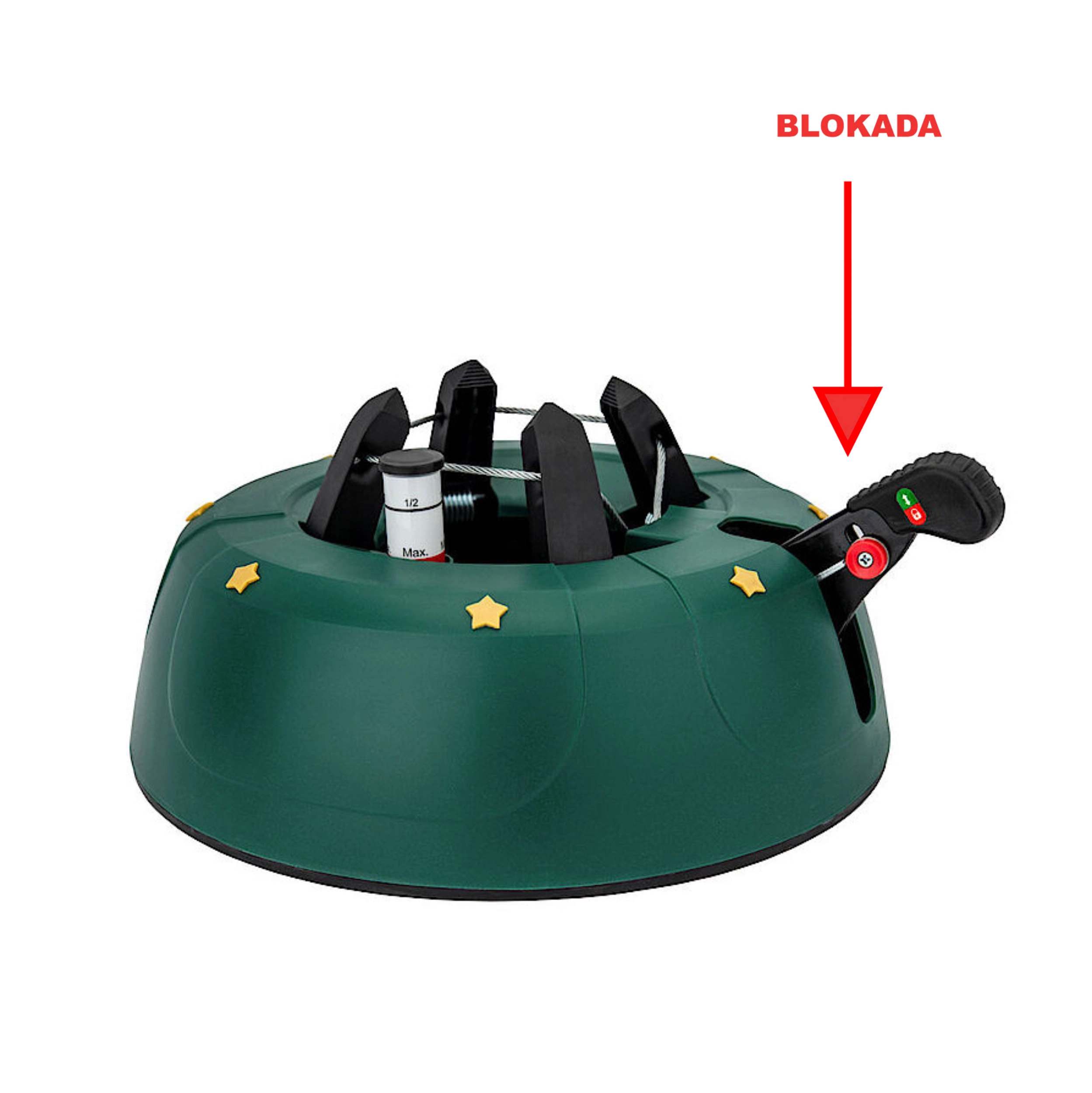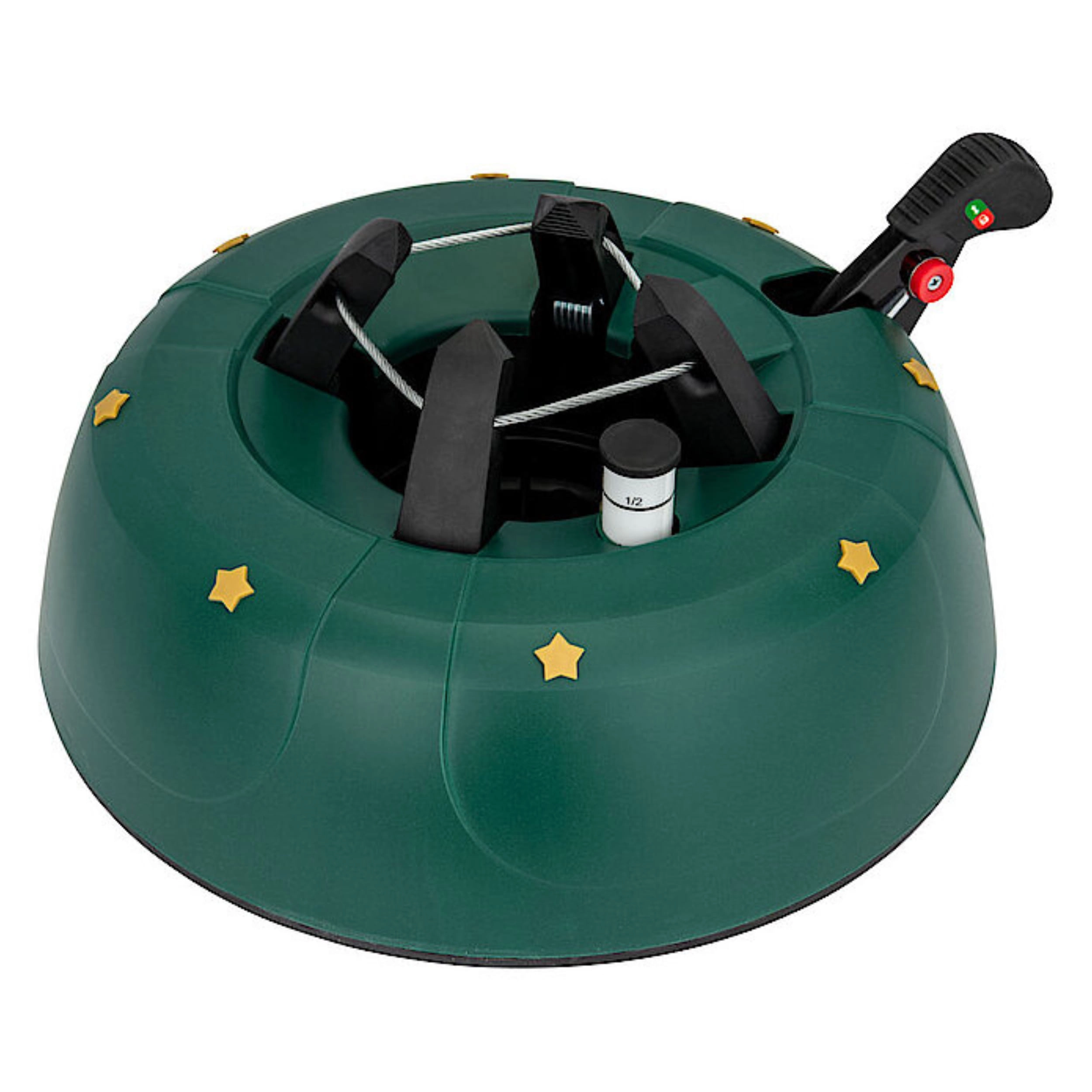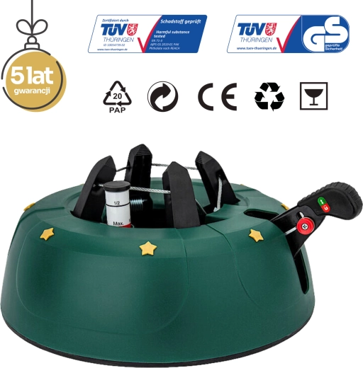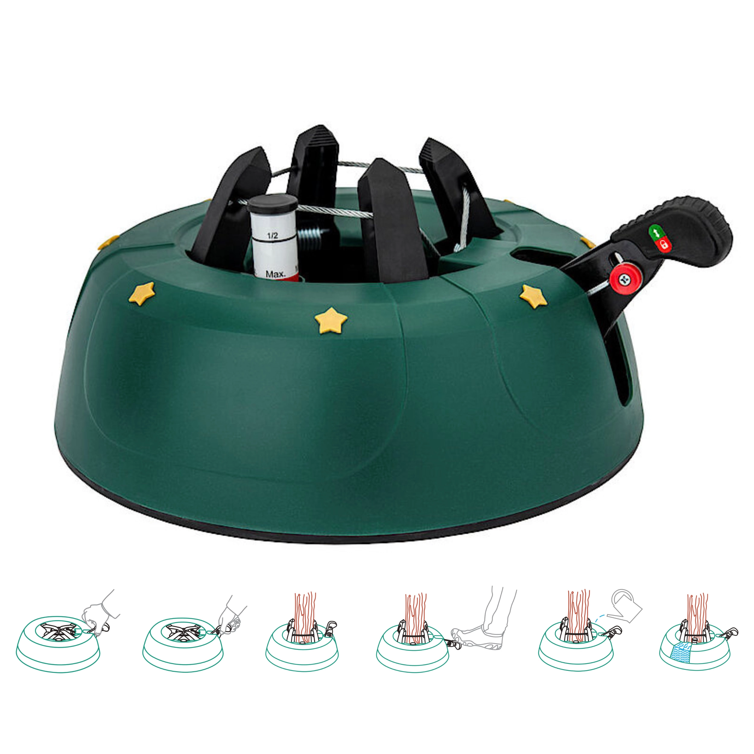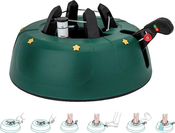L’utilisation est intuitive : posez l’arbre sur la pointe centrale en acier, appuyez plusieurs fois sur le levier pour serrer les mâchoires, puis activez le verrou de sécurité du levier pour éviter tout desserrage accidentel. La décoration en étoiles dorées et la couleur vert festif conviennent aux foyers, hôtels, magasins et espaces publics.