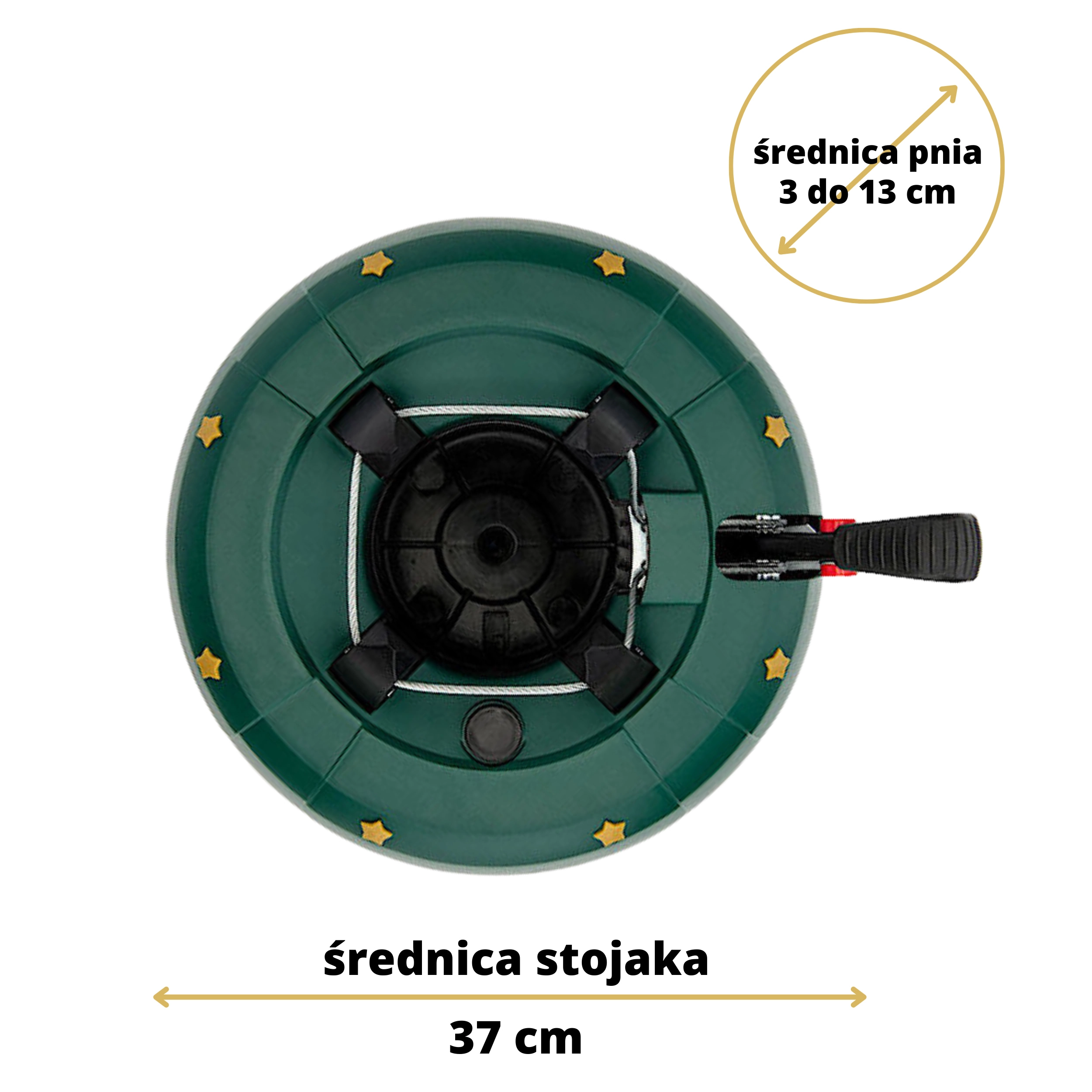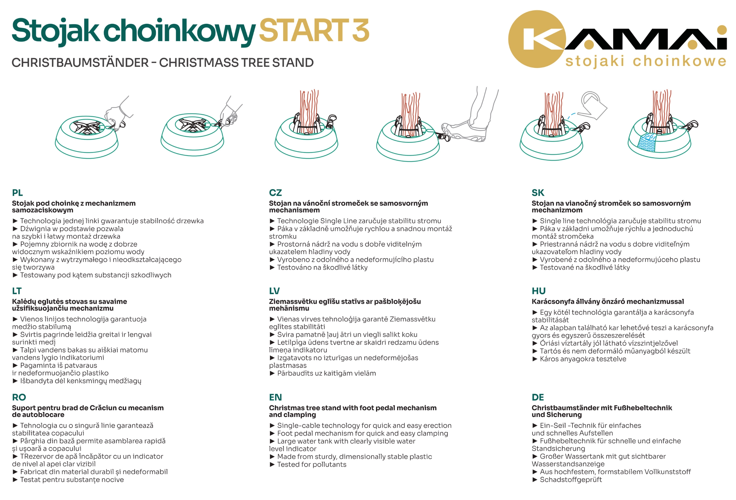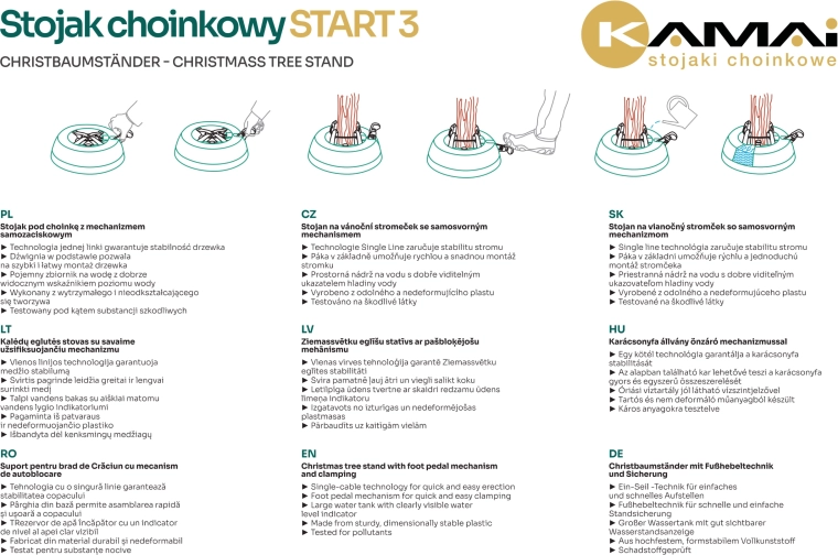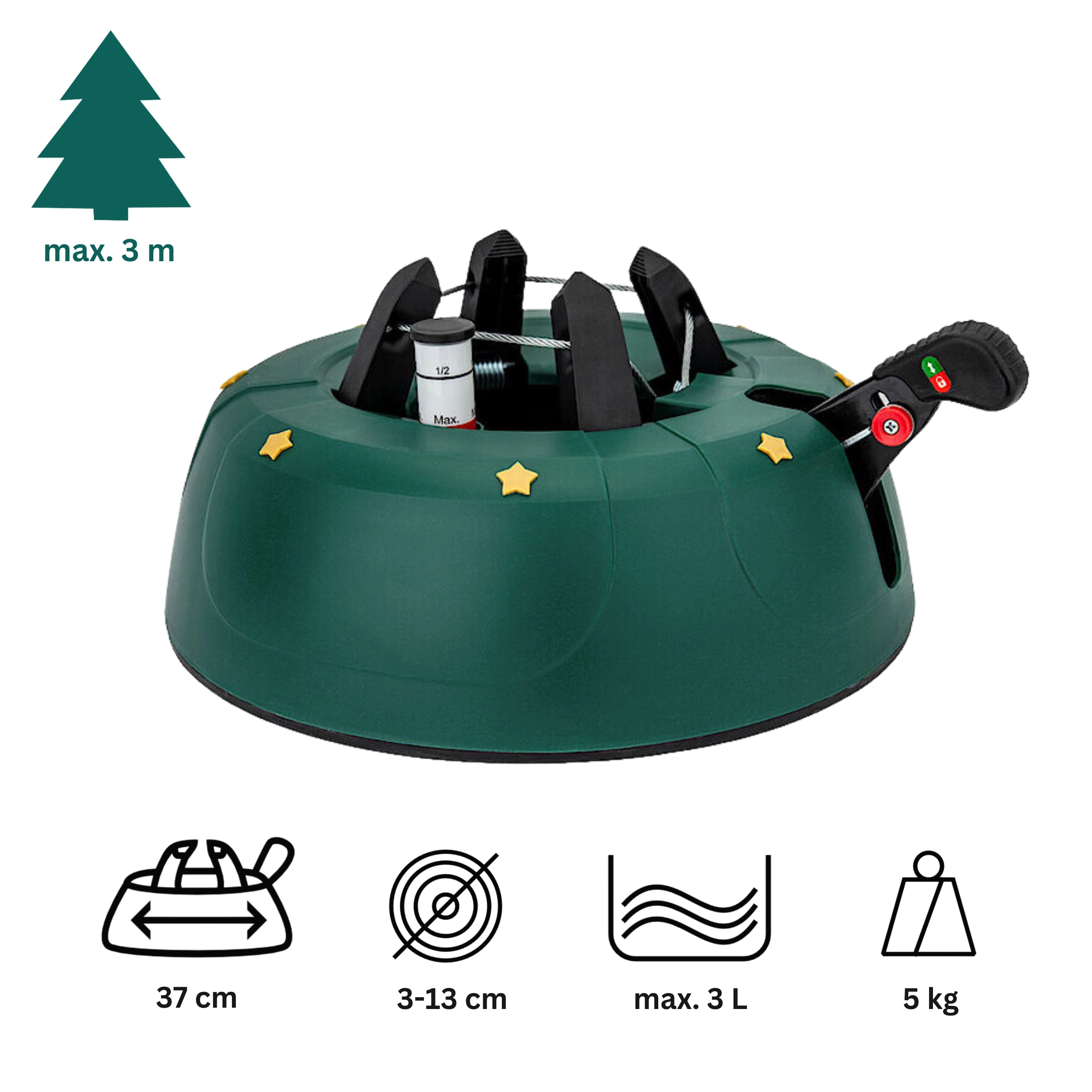 Kamai Start 3 est un support fiable pour sapins naturels jusqu’à 3 mètres de haut. Une large base, un poids de 5 kg et quatre crochets autobloquants avec un câble en acier résistant enserrent fermement le tronc (3–13 cm) et le maintiennent parfaitement vertical. Le réservoir d’eau intégré de 3 litres avec indicateur de niveau à flotteur aide à garder les aiguilles fraîches plus longtemps.