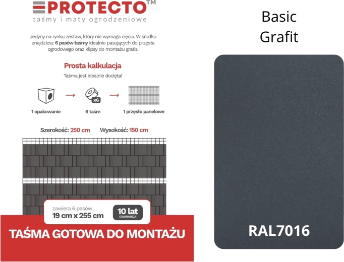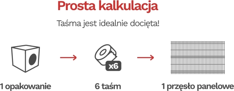 Le kit COMPACT comprend 6 bandes exactement longues de 2,55 m. Un colis suffit pour un panneau de clôture grillagée – il suffit d’entrelacer, de fixer éventuellement avec un clip et c’est terminé en quelques minutes.