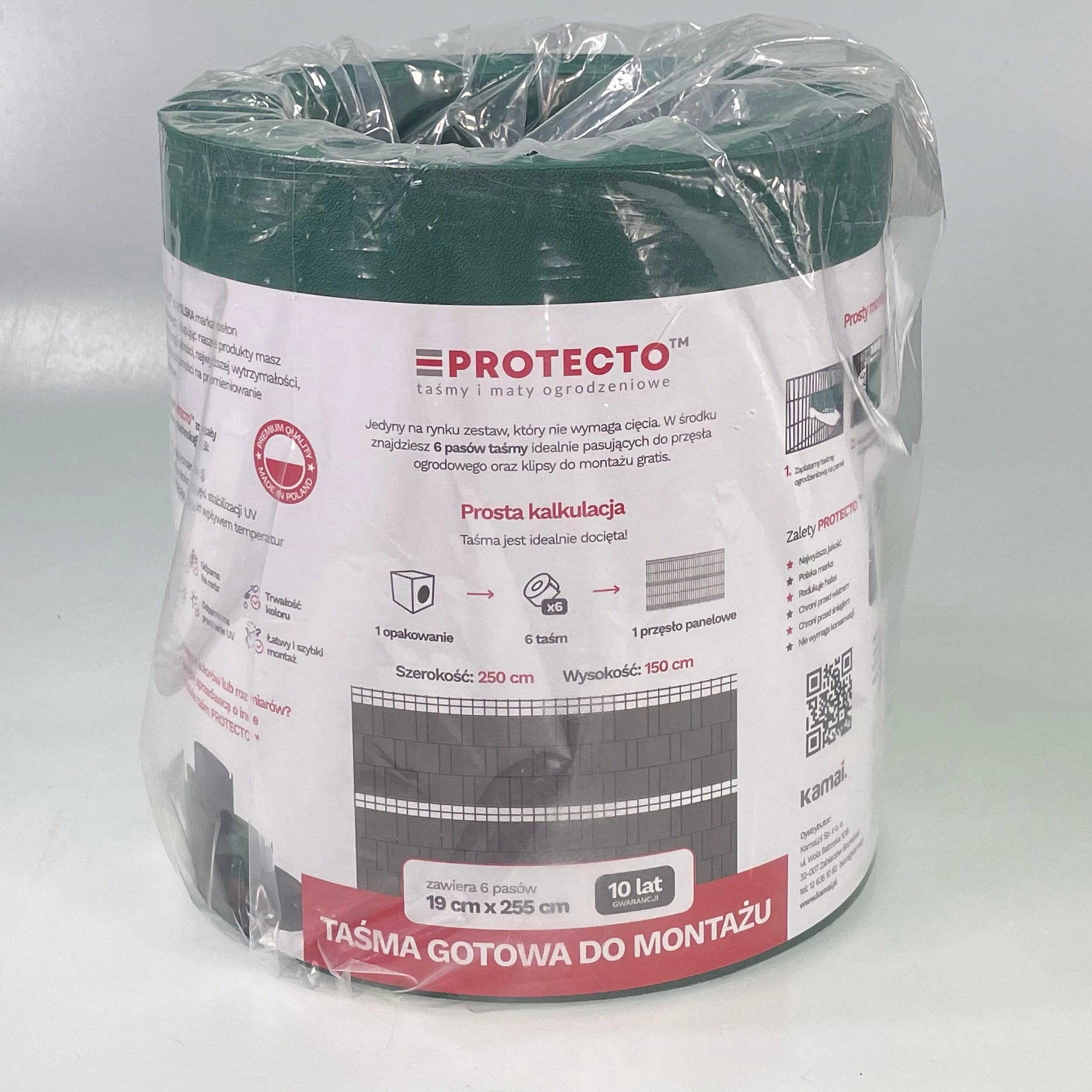 Kit prêt à l’emploi de lanières de clôture PROTECTO pour un panneau jusqu’à 2,55 m de large, offrant une installation rapide sans mesure ni découpe, un haut niveau d’intimité (~100 % d’occultation) et une résistance aux UV, au gel et au vent. Le polypropylène (PP) de qualité conserve sa forme et la couleur RAL 6005, et l’emballage comprend 6 bandes prédécoupées + 12 clips offerts.