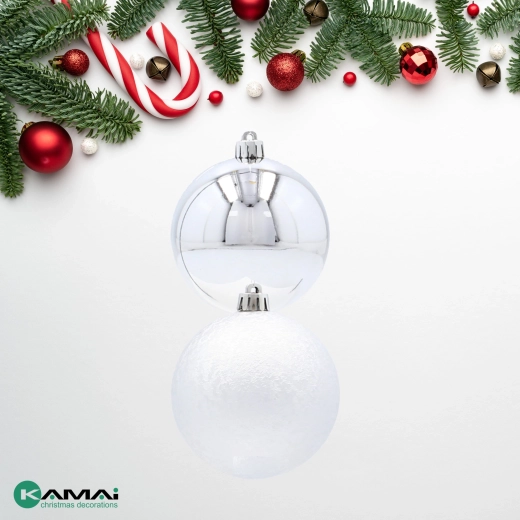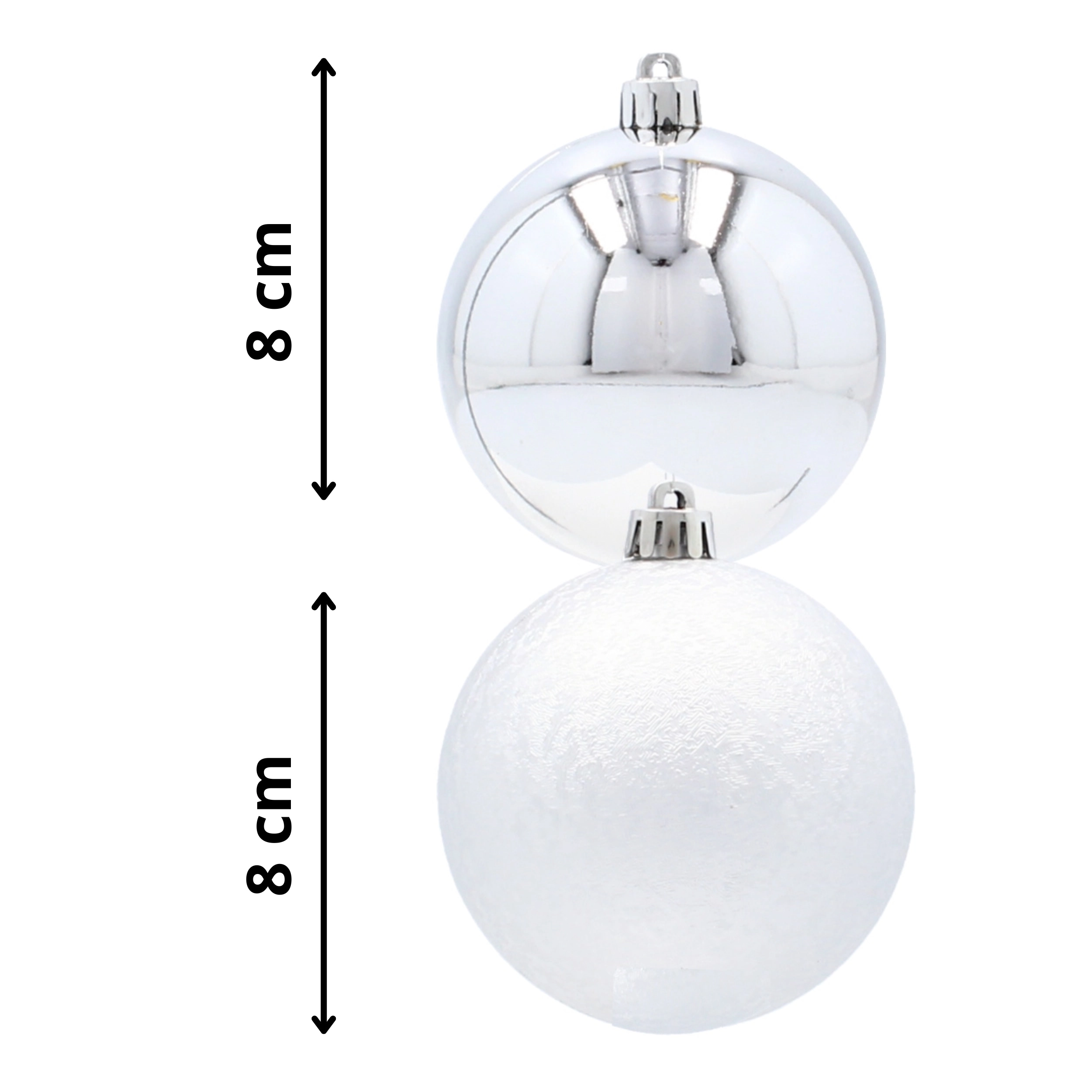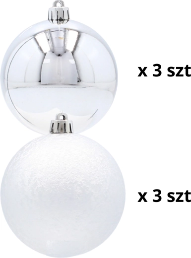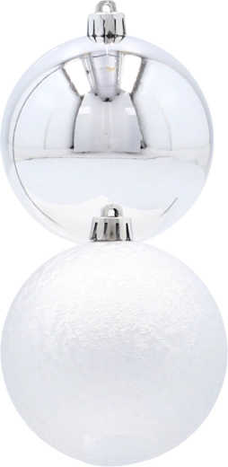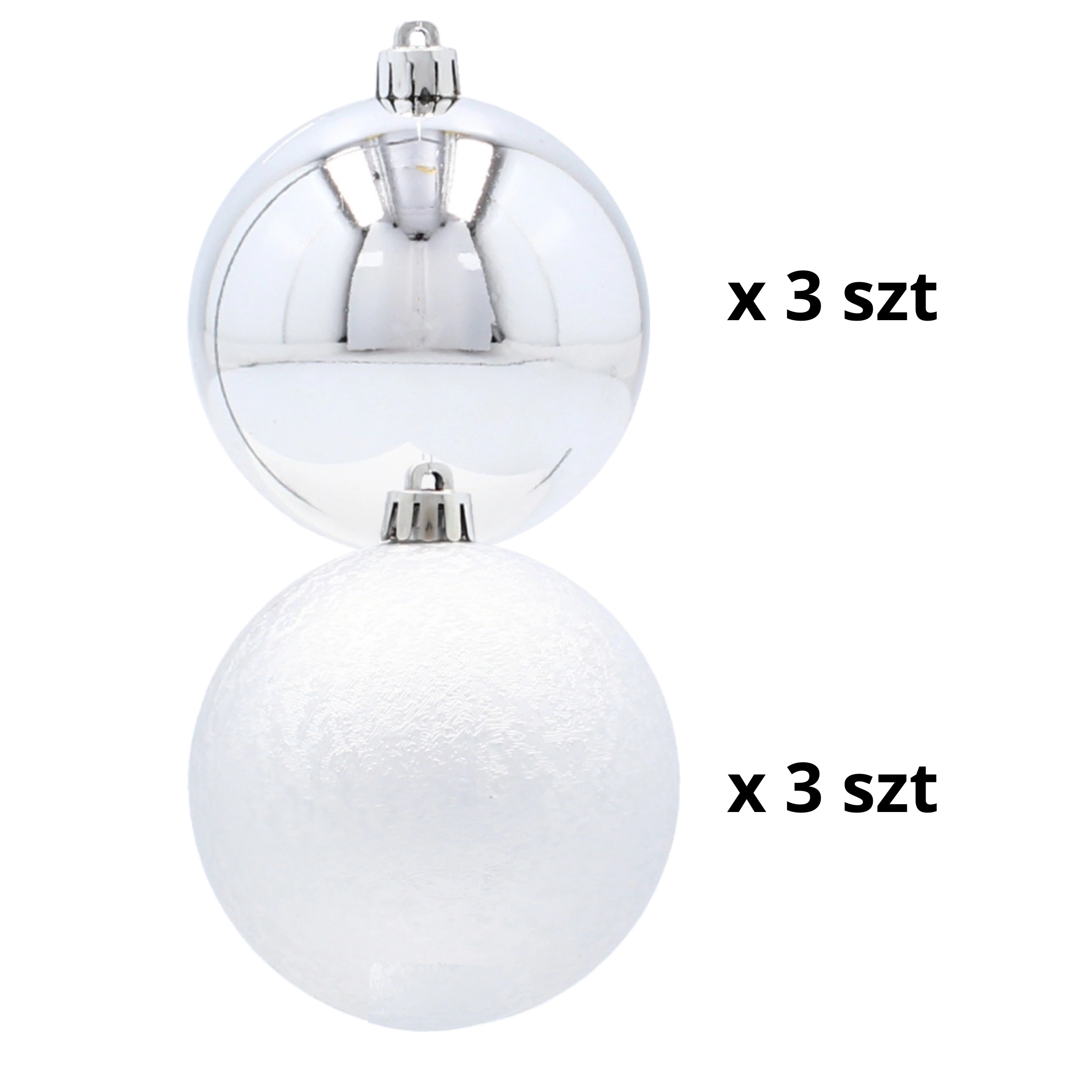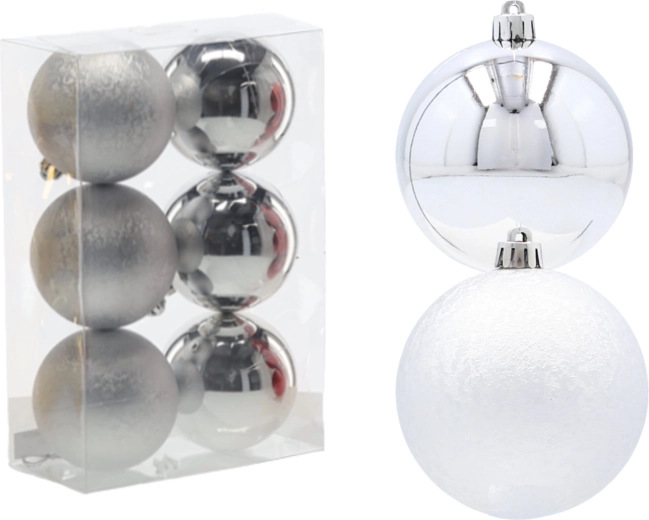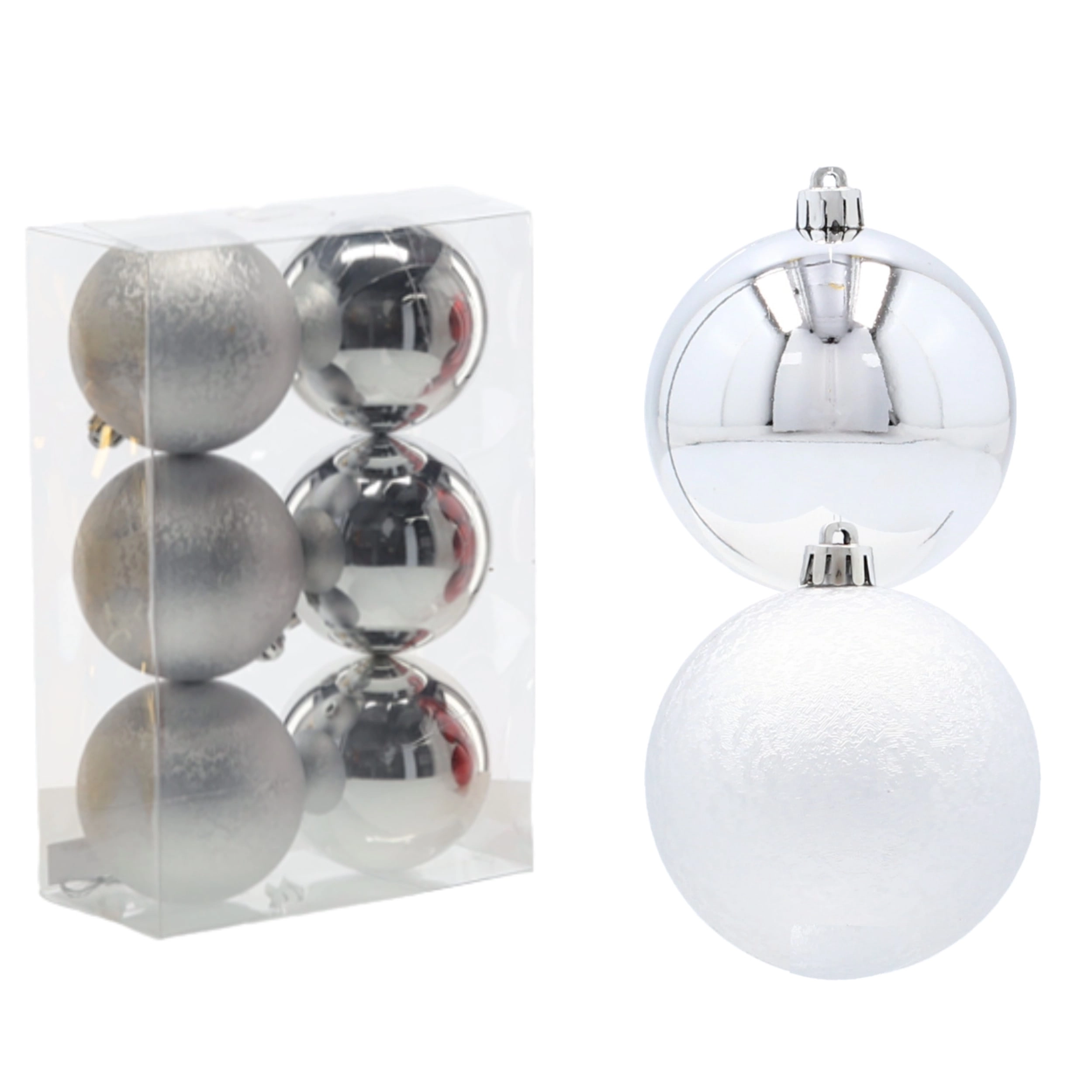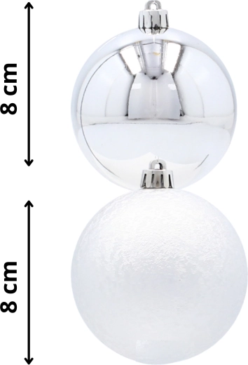 Découvrez l'éclat argenté délicat et l'élégance moderne avec cet ensemble exclusif de six boules de Noël de 8 cm de diamètre. La combinaison de surfaces lisses et délicatement texturées crée un contraste saisissant sur le sapin, tandis que la conception incassable garantit la sécurité des enfants et des foyers avec des animaux. Des ficelles argentées sont incluses pour une suspension immédiate.
