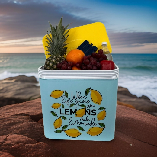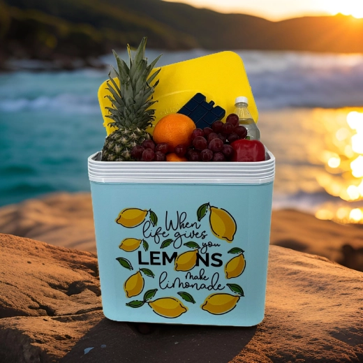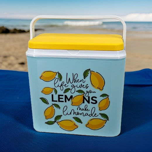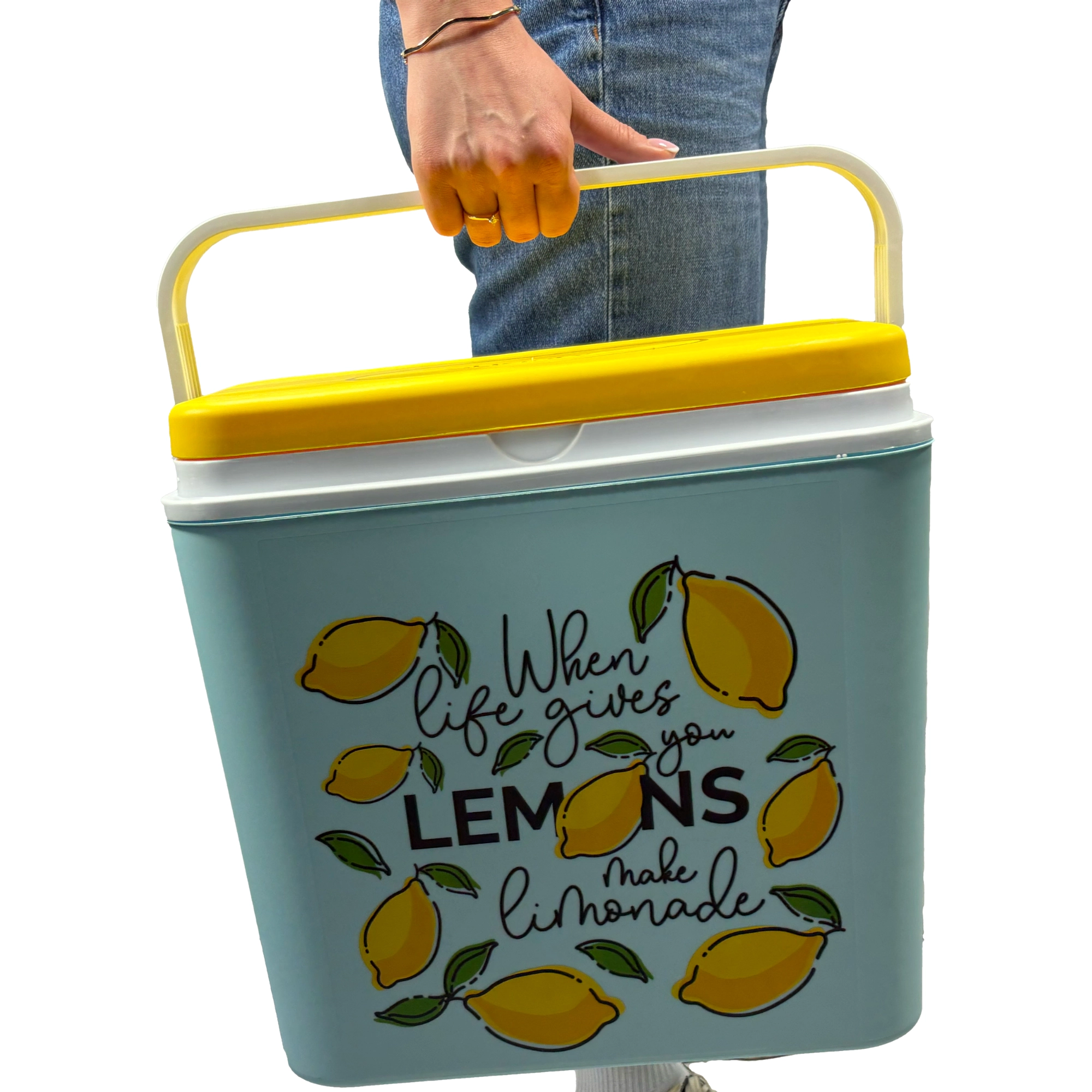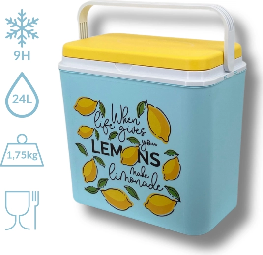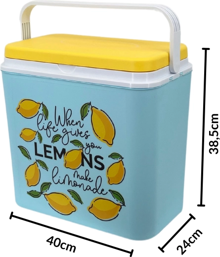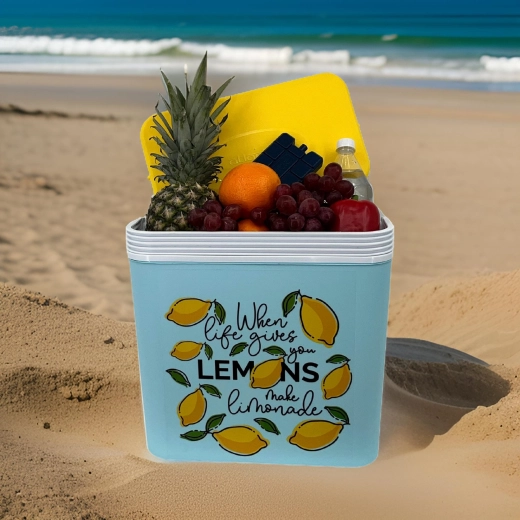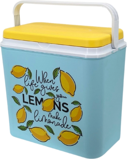 Cette glacière passive stylée séduit par son motif LEMONADE associant bleu clair et jaune. Grâce à son isolation bien pensée, elle maintient une basse température même par temps chaud et est idéale pour les sorties en famille, la plage et les pique-niques.