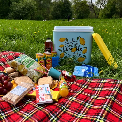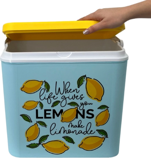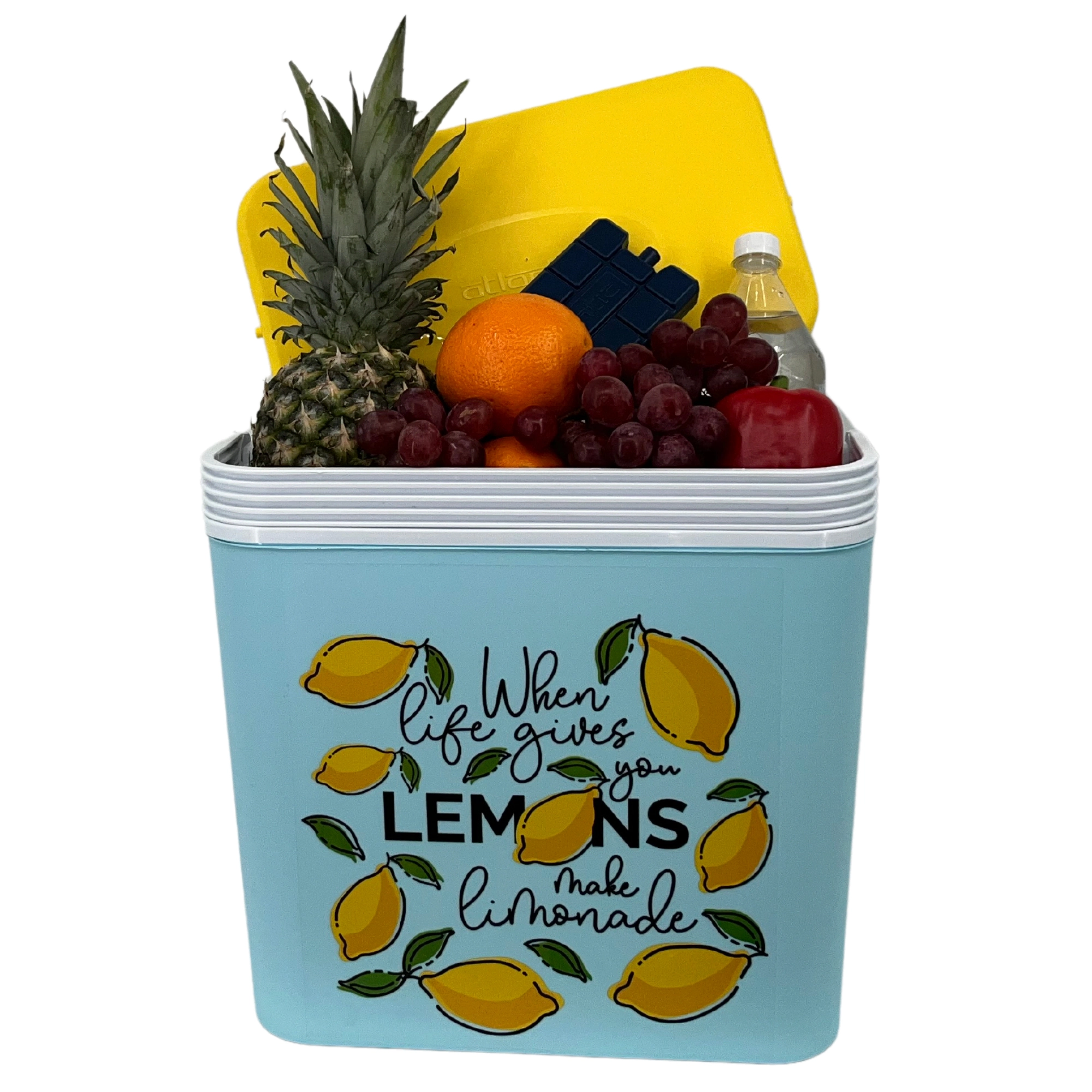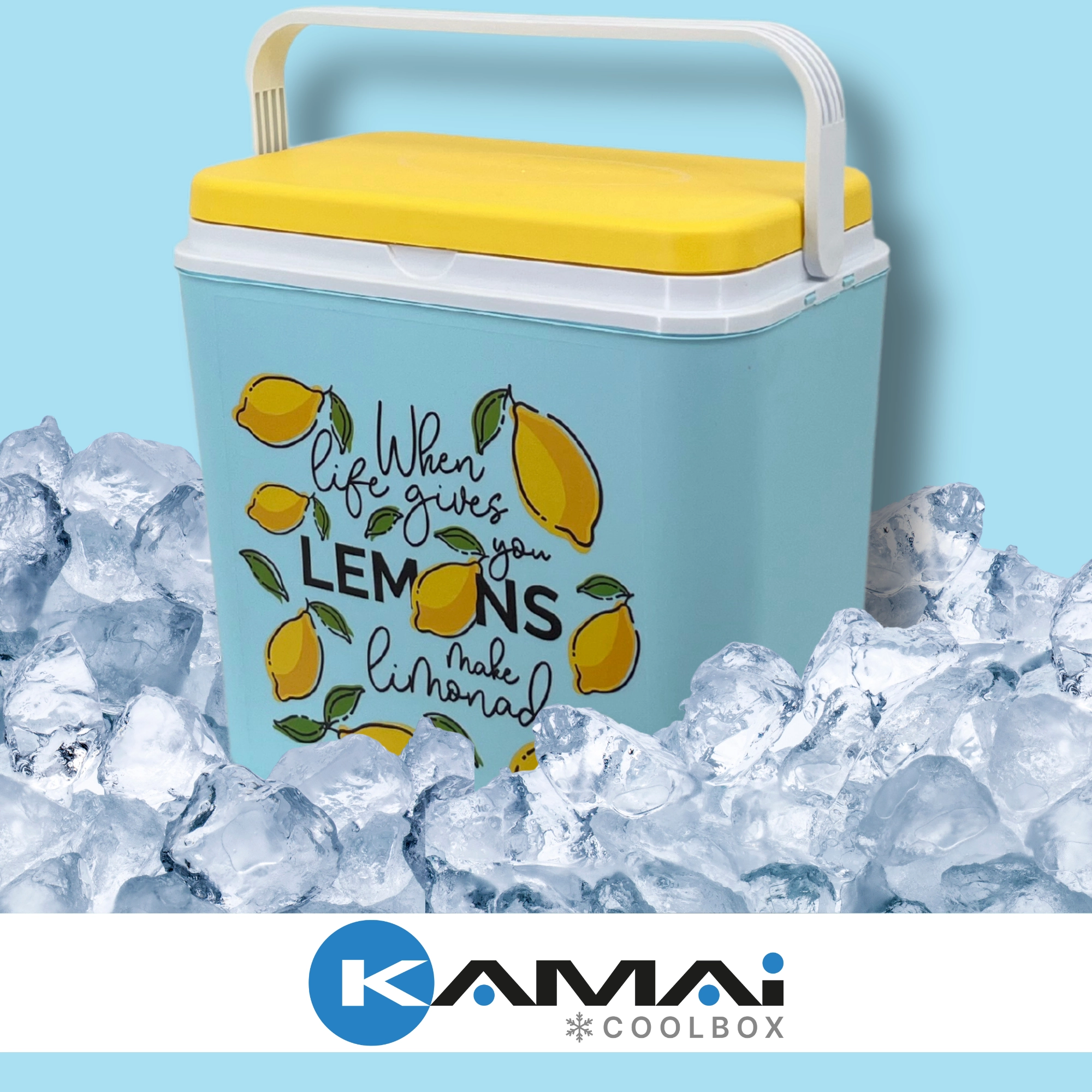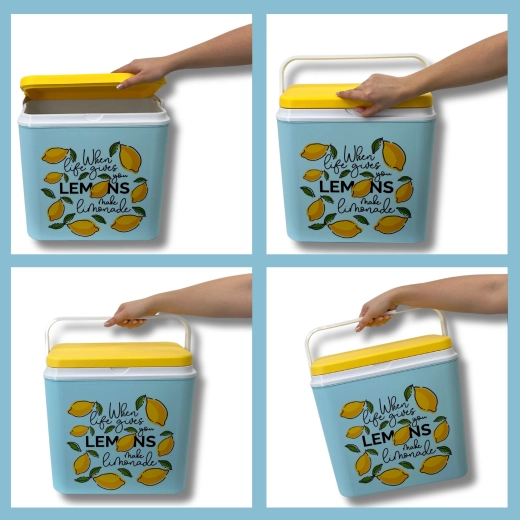 Cette glacière passive stylée séduit par son motif LEMONADE associant bleu clair et jaune. Grâce à son isolation bien pensée, elle maintient une basse température même par temps chaud et est idéale pour les sorties en famille, la plage et les pique-niques.