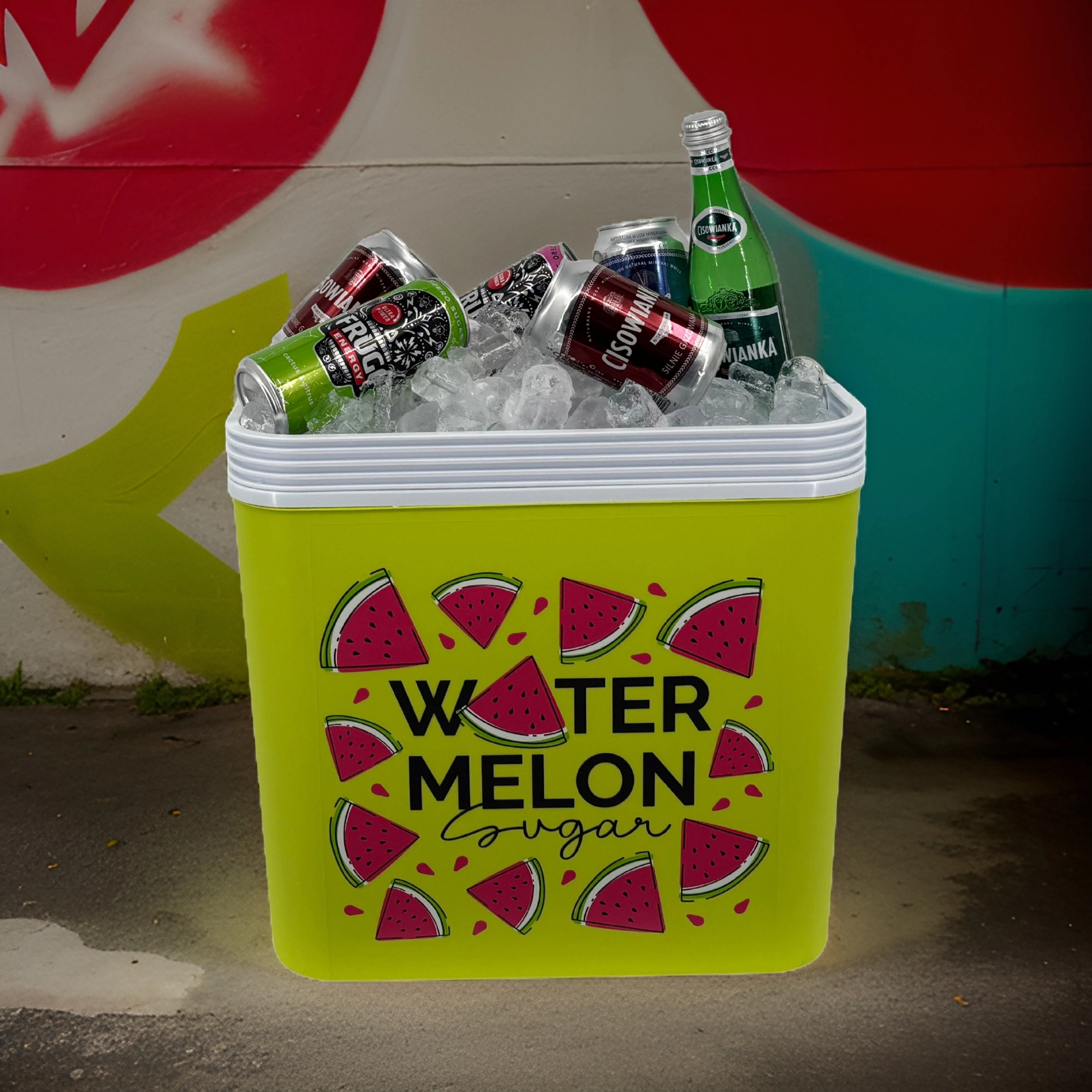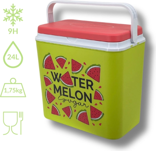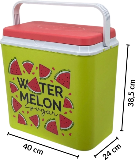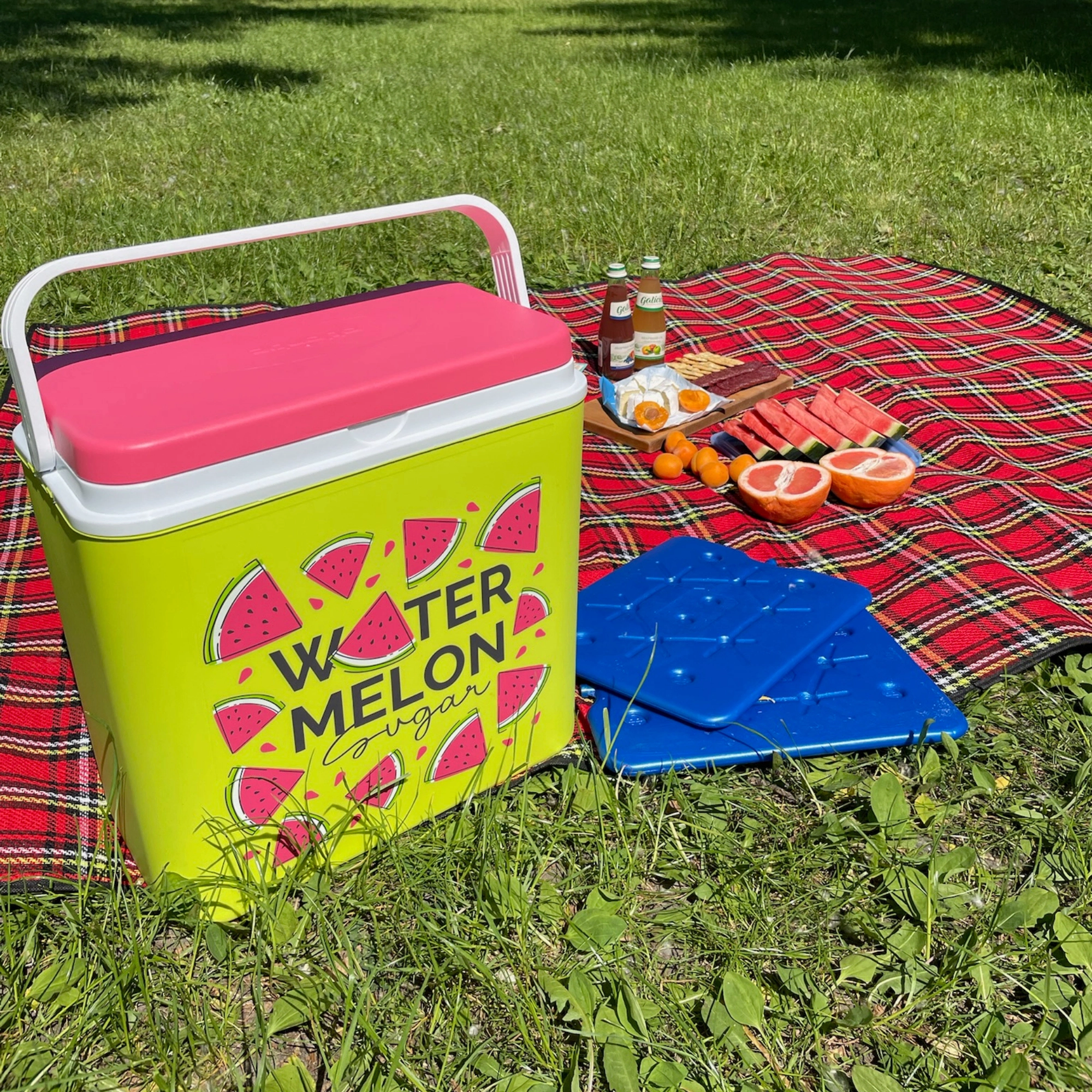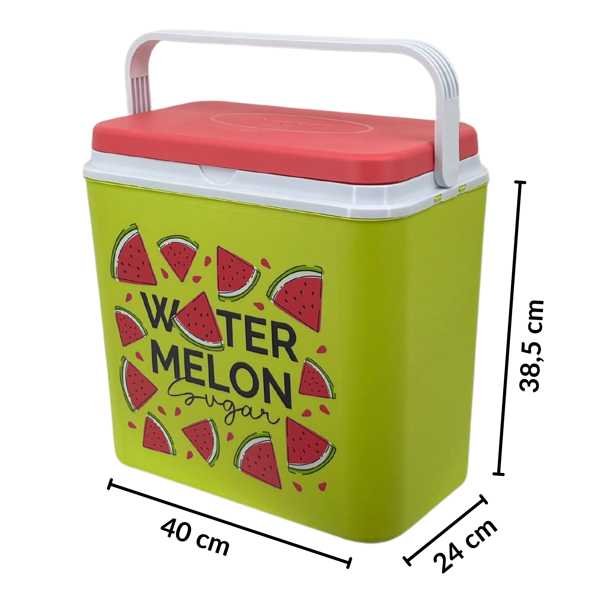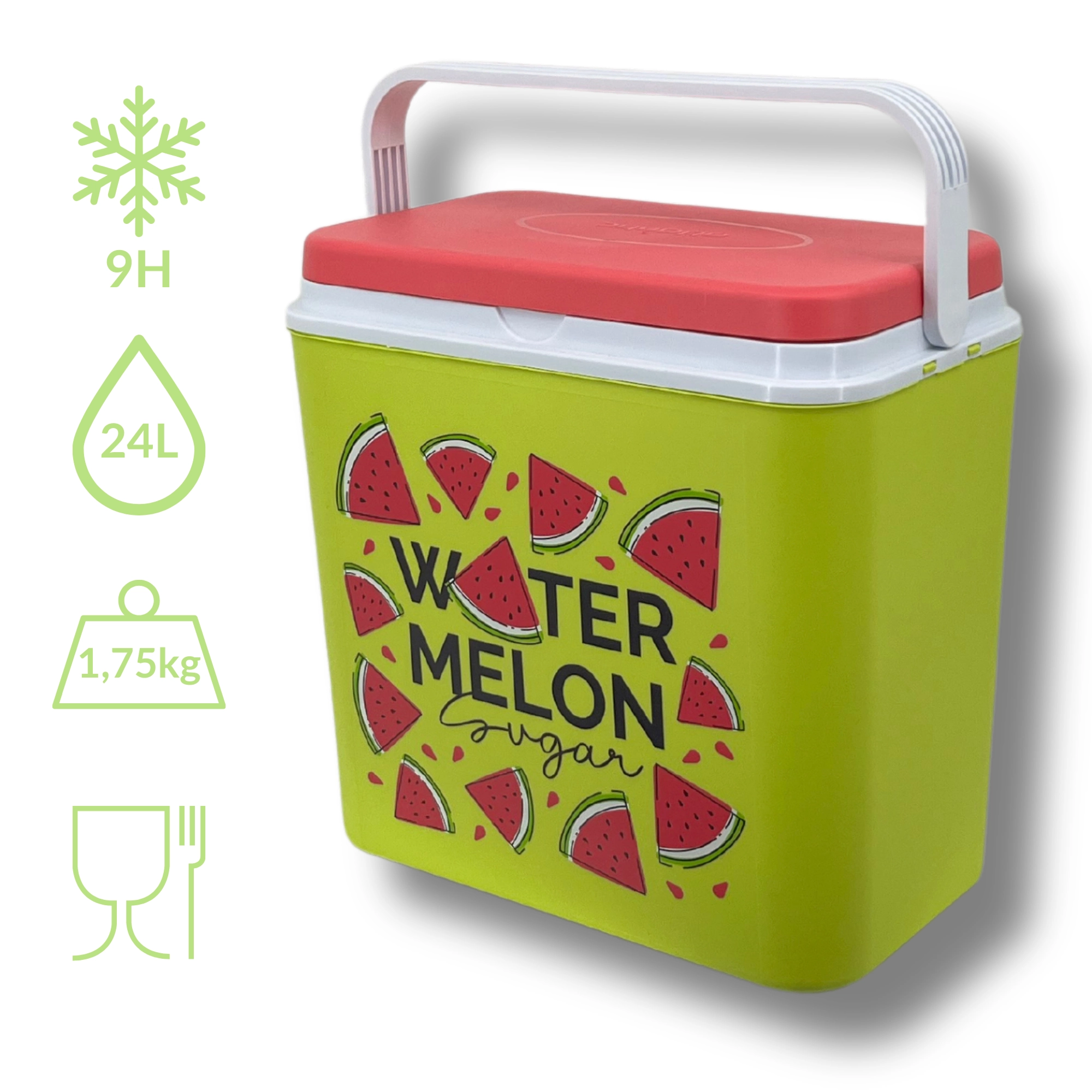 Glacière passive élégante de 24 l qui garde vos boissons et aliments frais longtemps grâce à une isolation de qualité et à l’utilisation d’accumulateurs de froid. Dimensions compactes, poignée robuste pour un transport facile et motif estival WATERMELON en font un choix parfait pour les excursions, la plage et les pique-niques. Fabriqué dans l’UE, sans danger pour le contact alimentaire et facile à nettoyer.