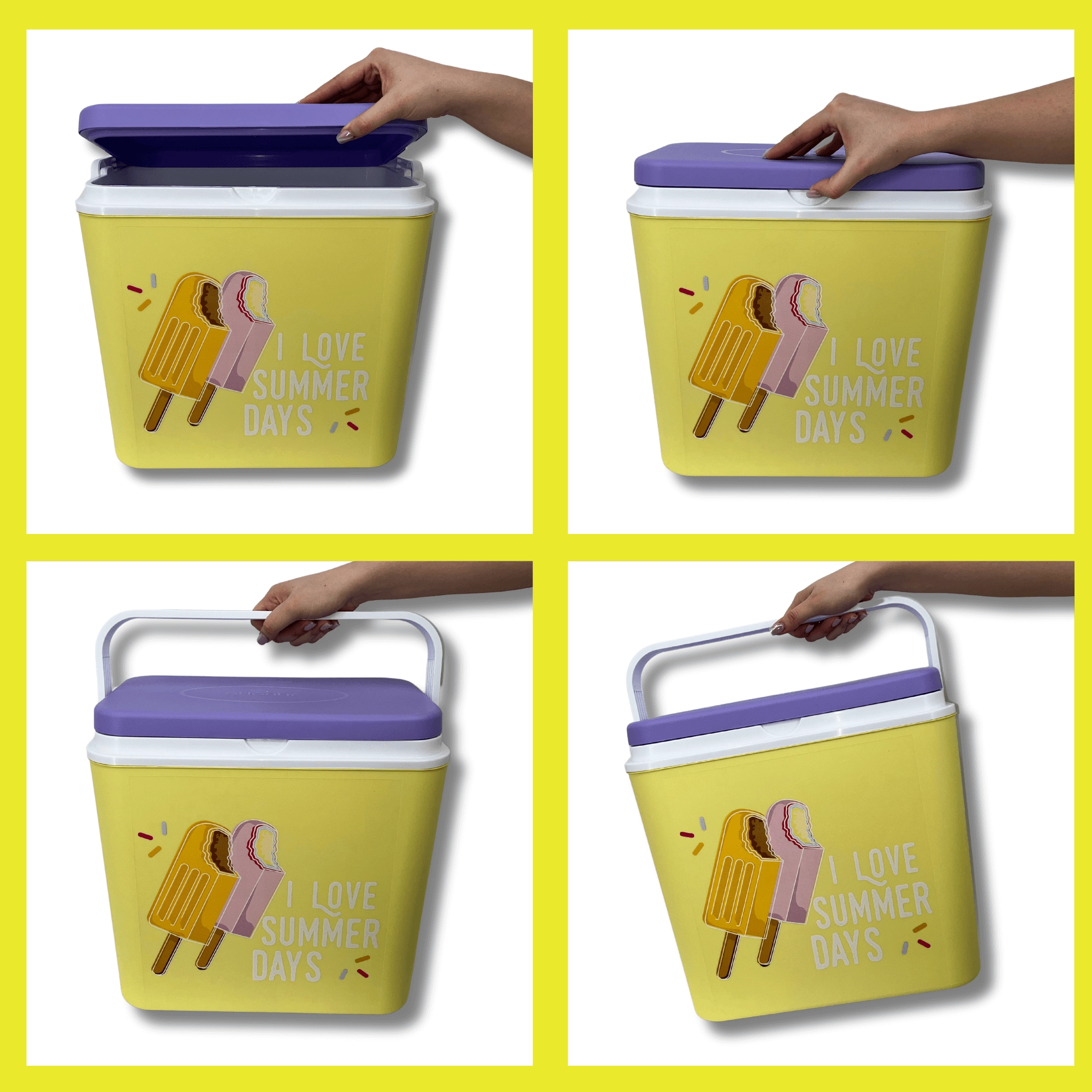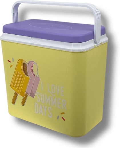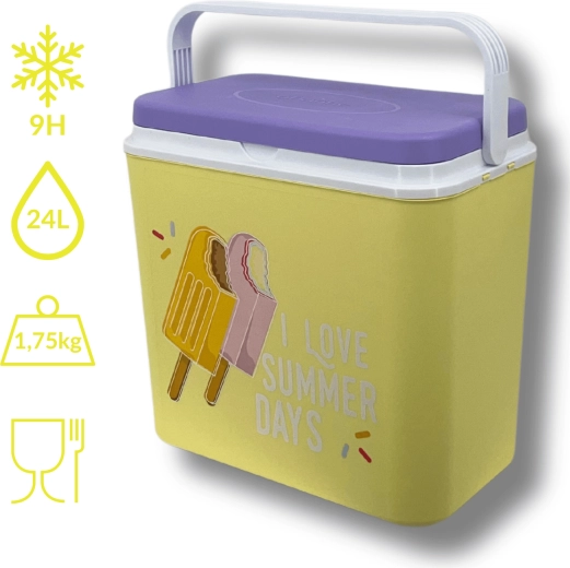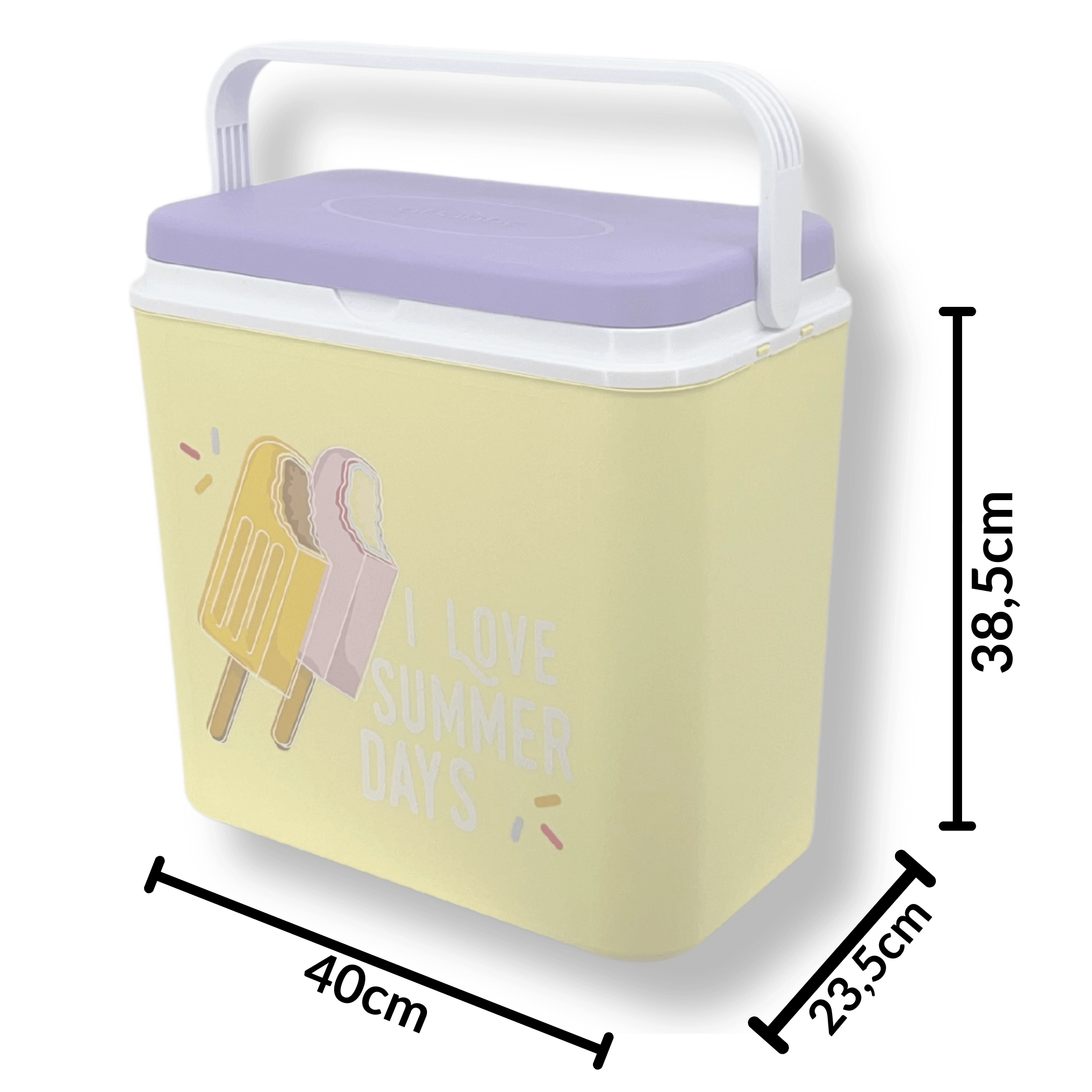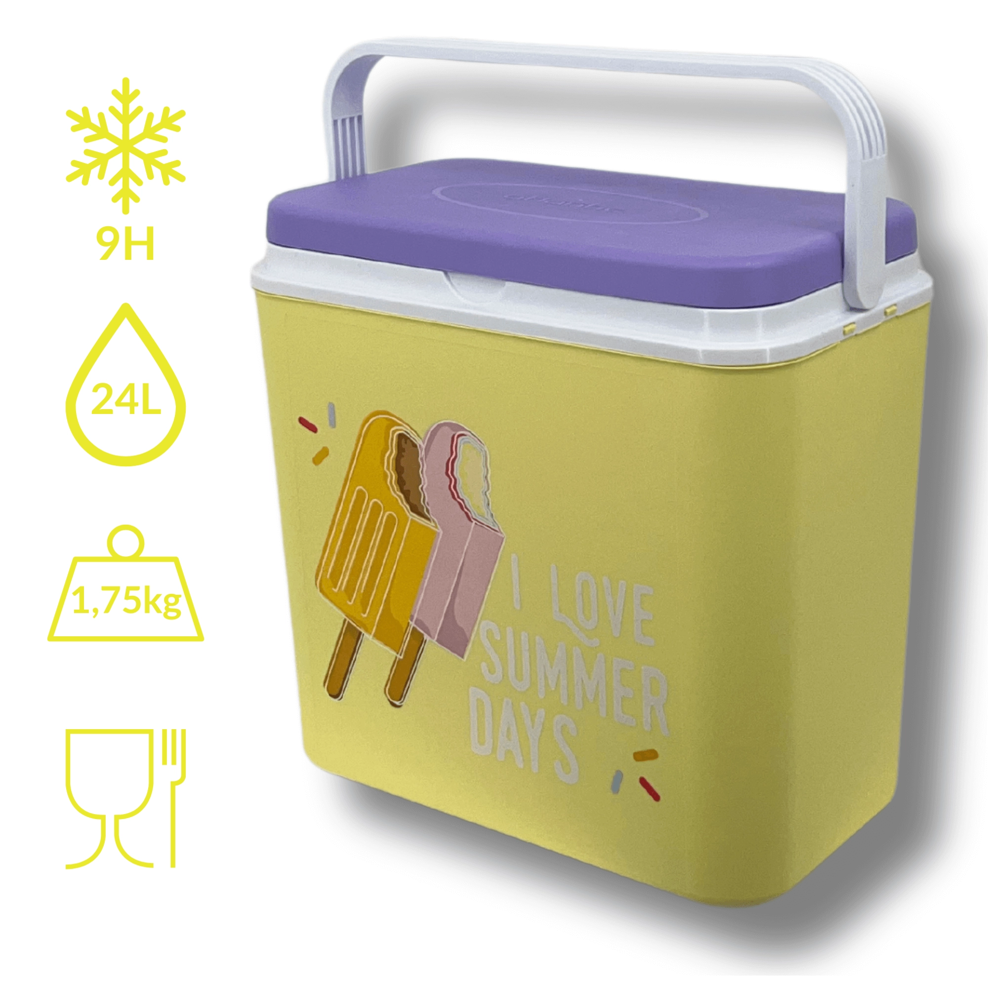 Profitez de boissons fraîches et de petites douceurs tout au long de la journée. Cette glacière passive de 24 l fonctionne avec des blocs réfrigérants, offre une isolation thermique avancée et, grâce à ses dimensions compactes, se glisse facilement dans une voiture, un camping-car ou un bateau. Le corps jaune pastel avec un imprimé numérique de qualité et le couvercle violet soulignent le style estival.