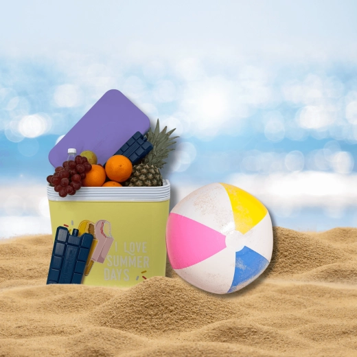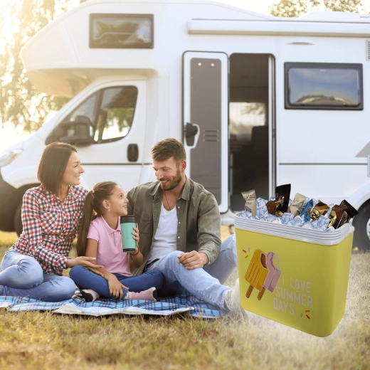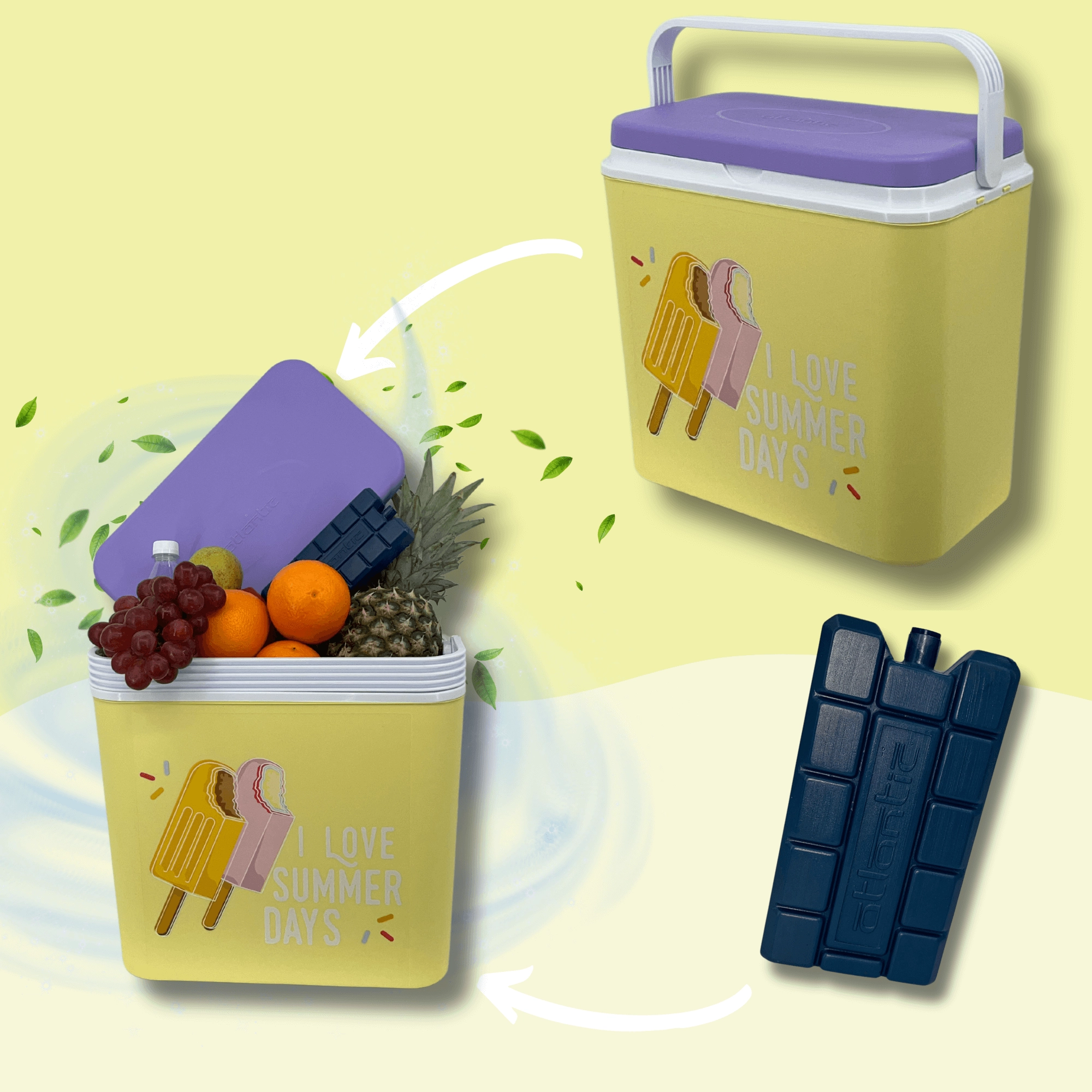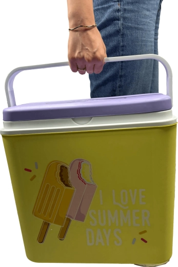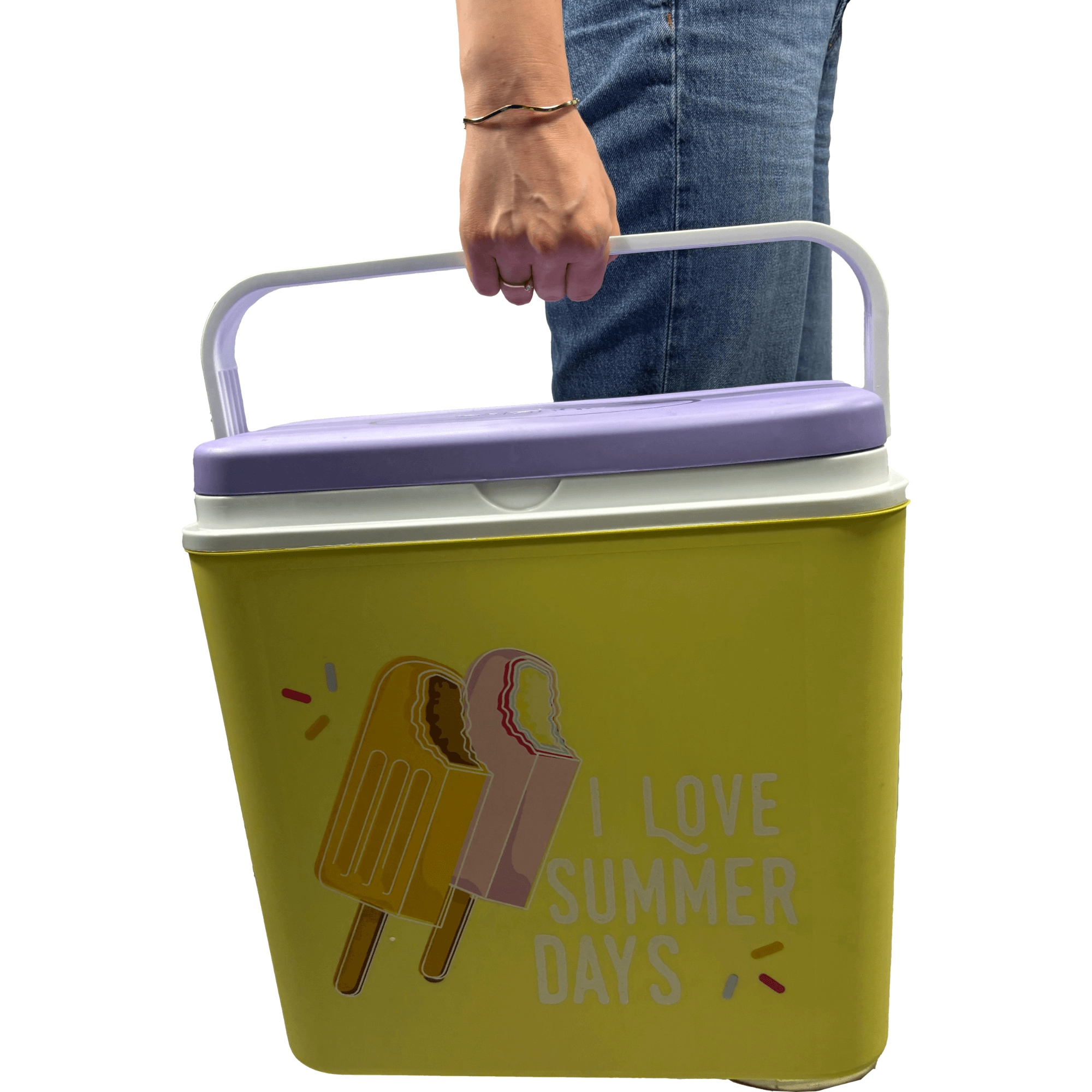 Profitez de boissons fraîches et de petites douceurs tout au long de la journée. Cette glacière passive de 24 l fonctionne avec des blocs réfrigérants, offre une isolation thermique avancée et, grâce à ses dimensions compactes, se glisse facilement dans une voiture, un camping-car ou un bateau. Le corps jaune pastel avec un imprimé numérique de qualité et le couvercle violet soulignent le style estival.