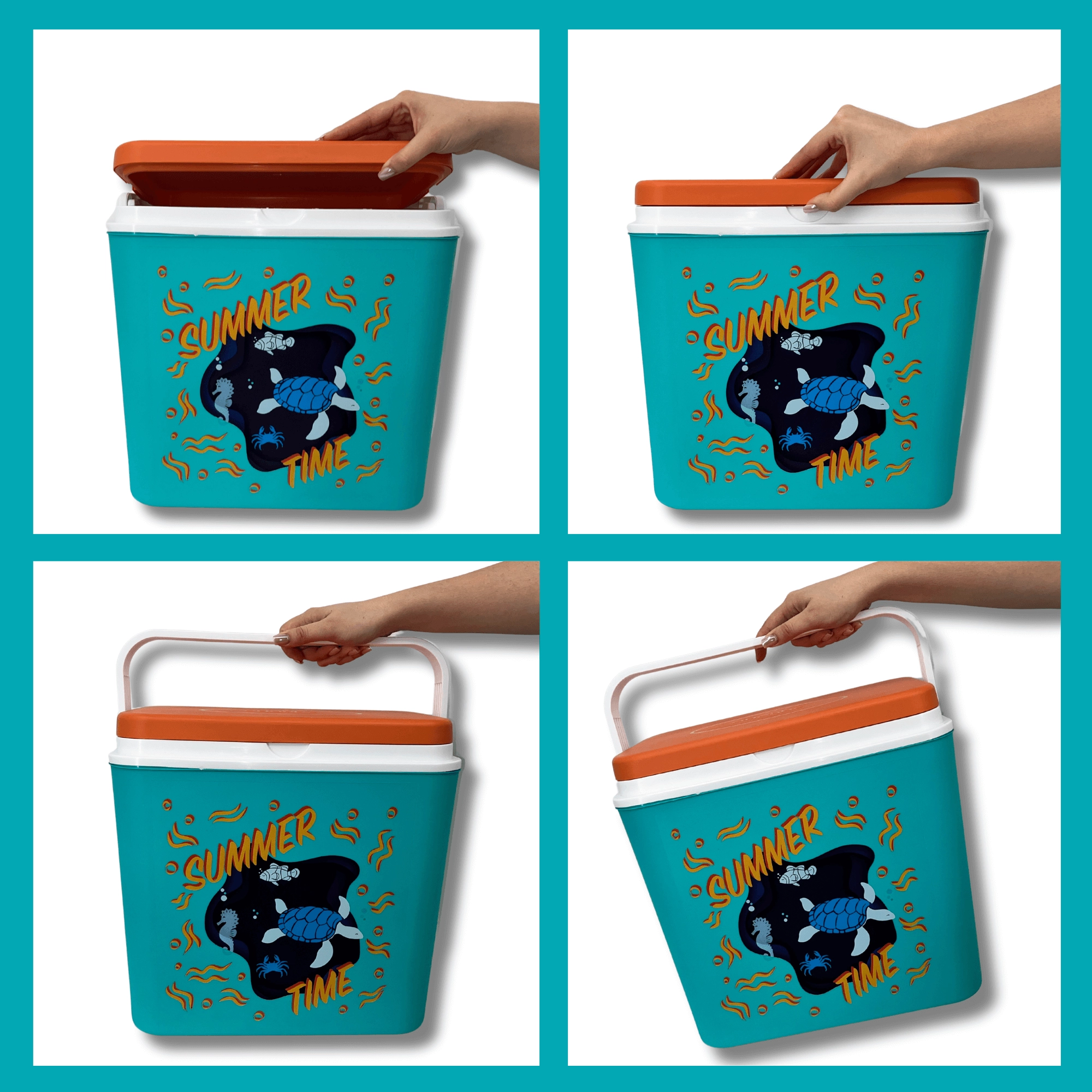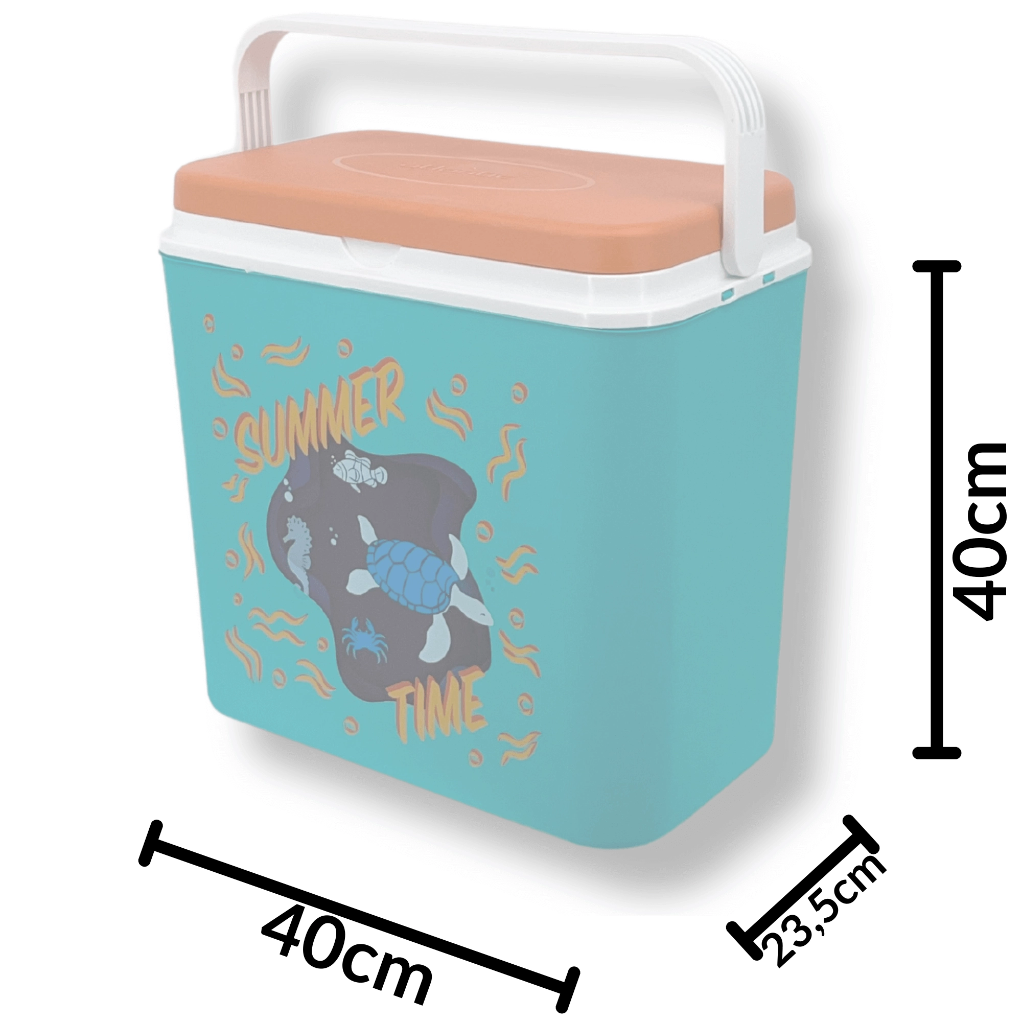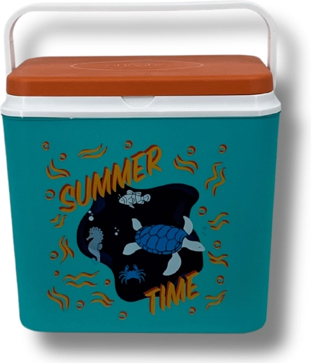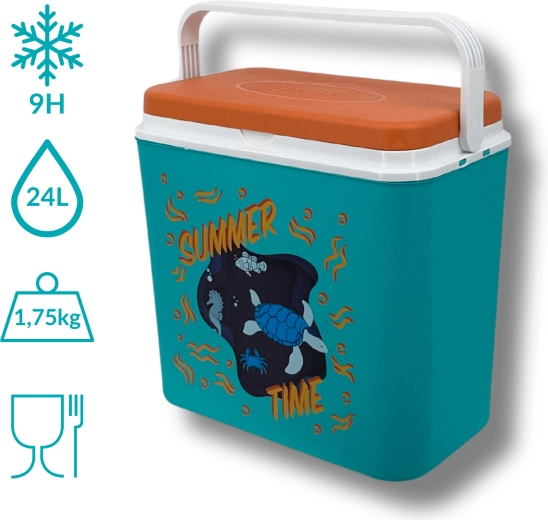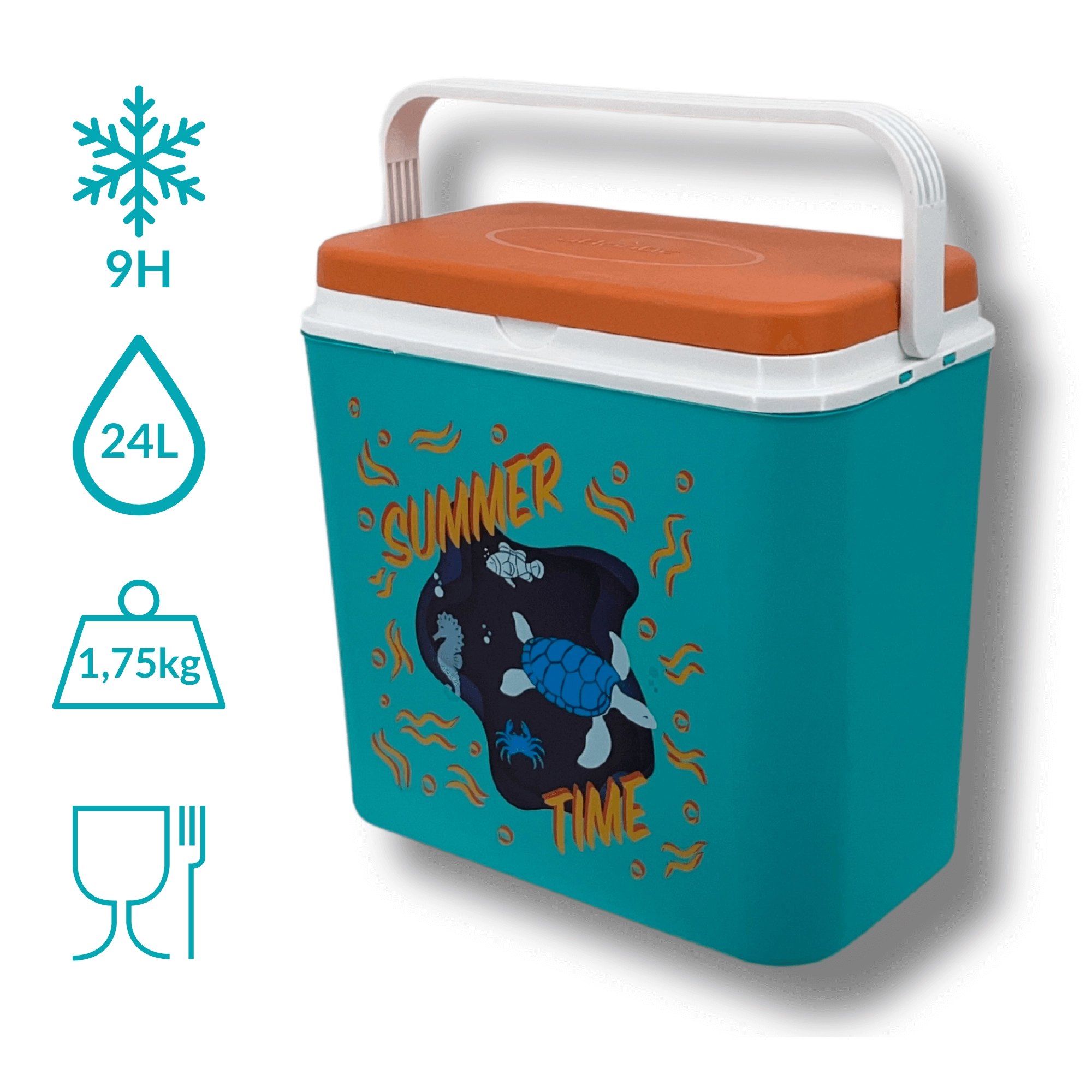 Le corps en polypropylène résistant se nettoie facilement et sa construction compacte s’intègre dans une voiture, une caravane ou un bateau. La hauteur intérieure permet de placer une bouteille de 2 l en position verticale; l’intérieur peut accueillir jusqu’à huit bouteilles de 1,5 l ou trois de 2 l côte à côte. L’impression estivale avec tortue et hippocampe et le couvercle contrasté confèrent à la glacière un look attrayant.