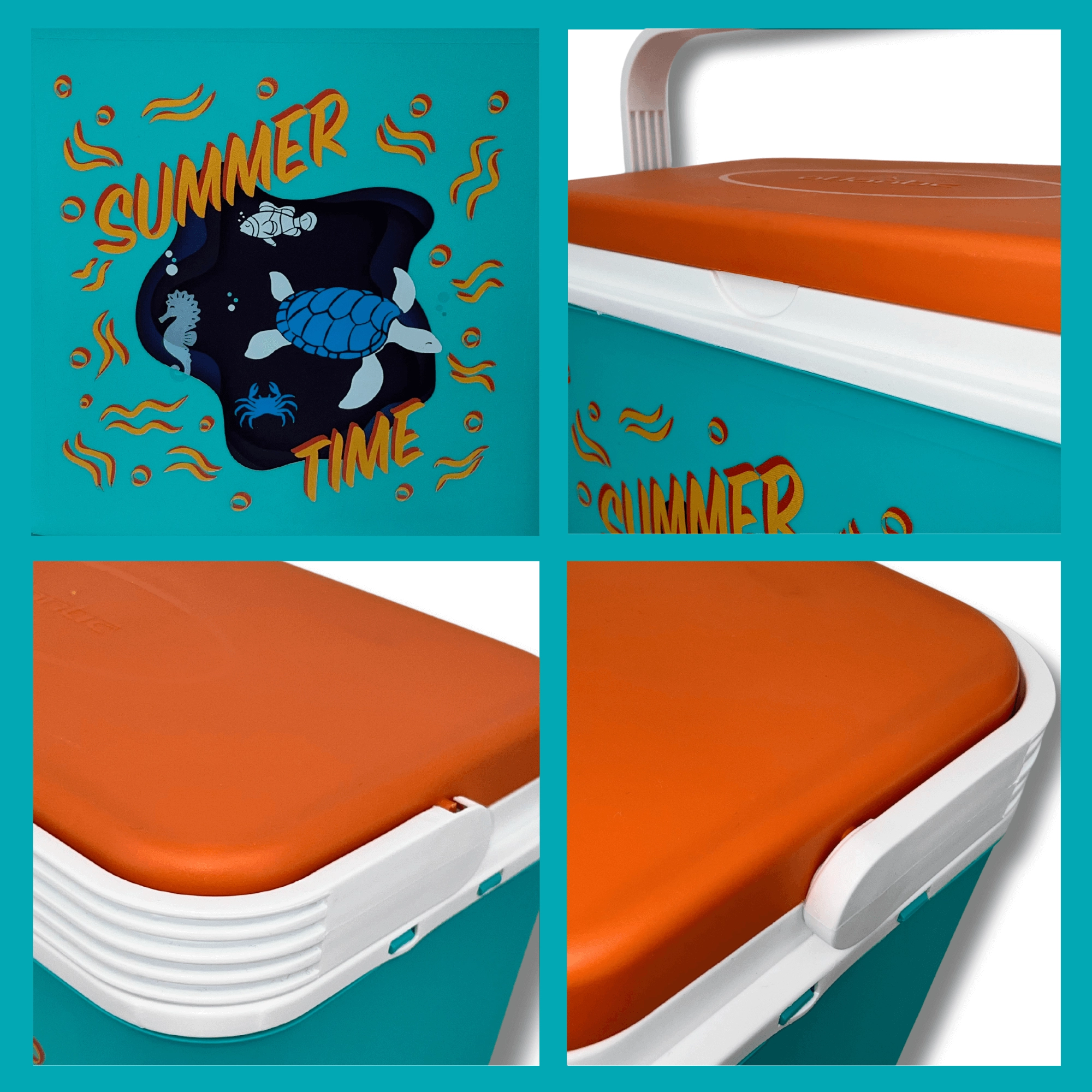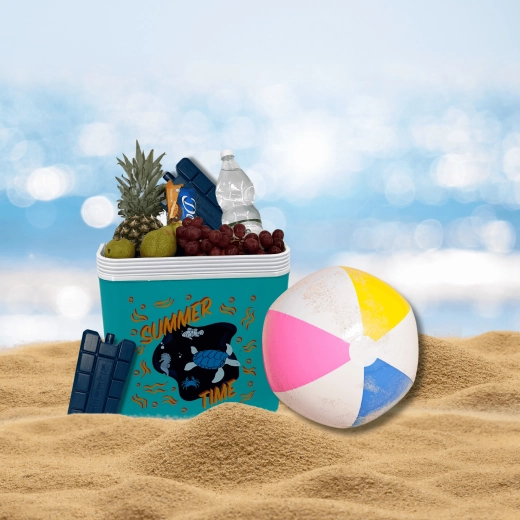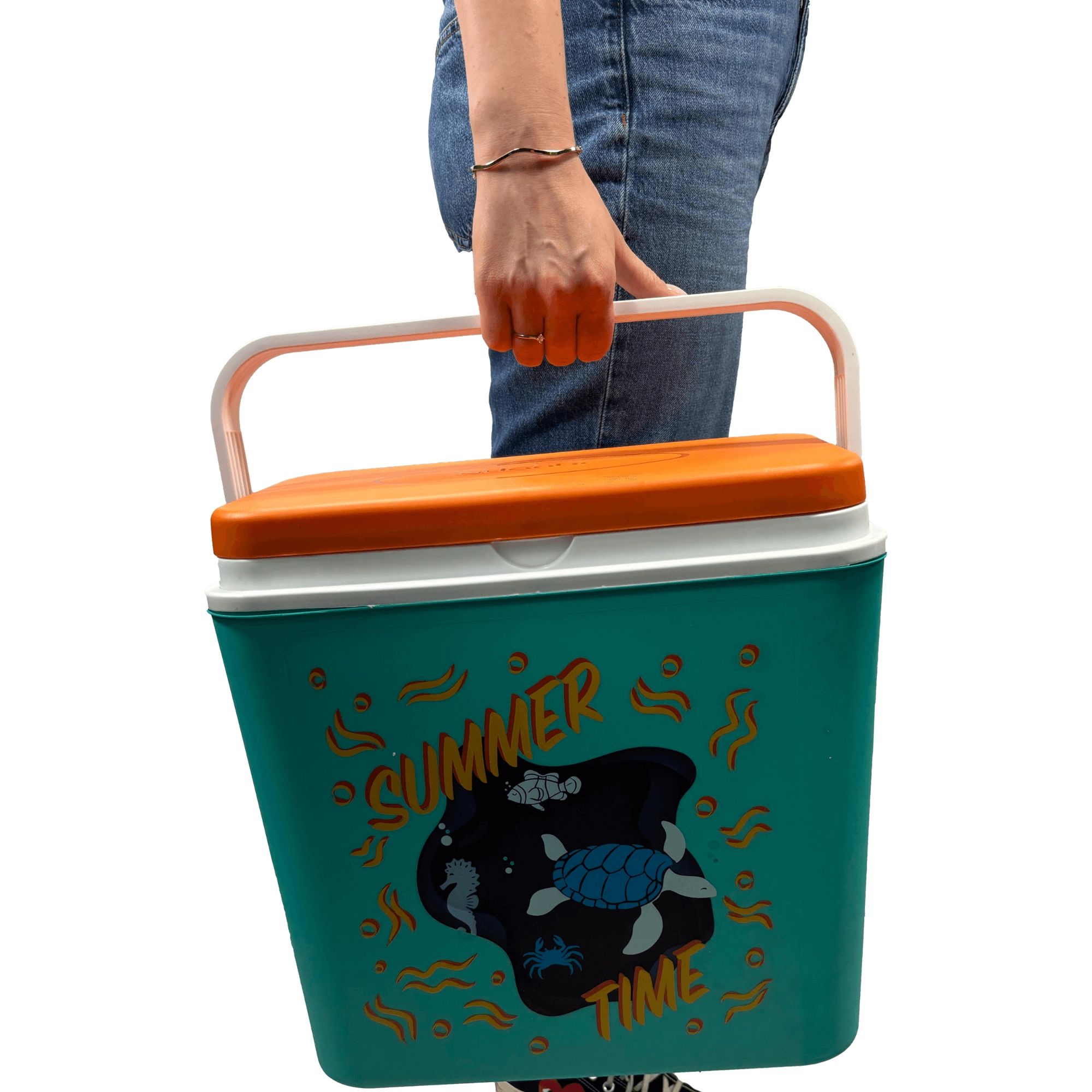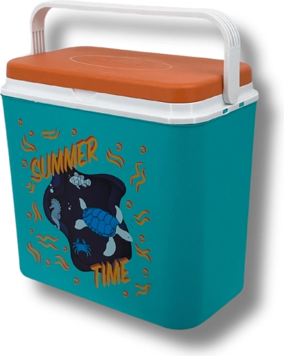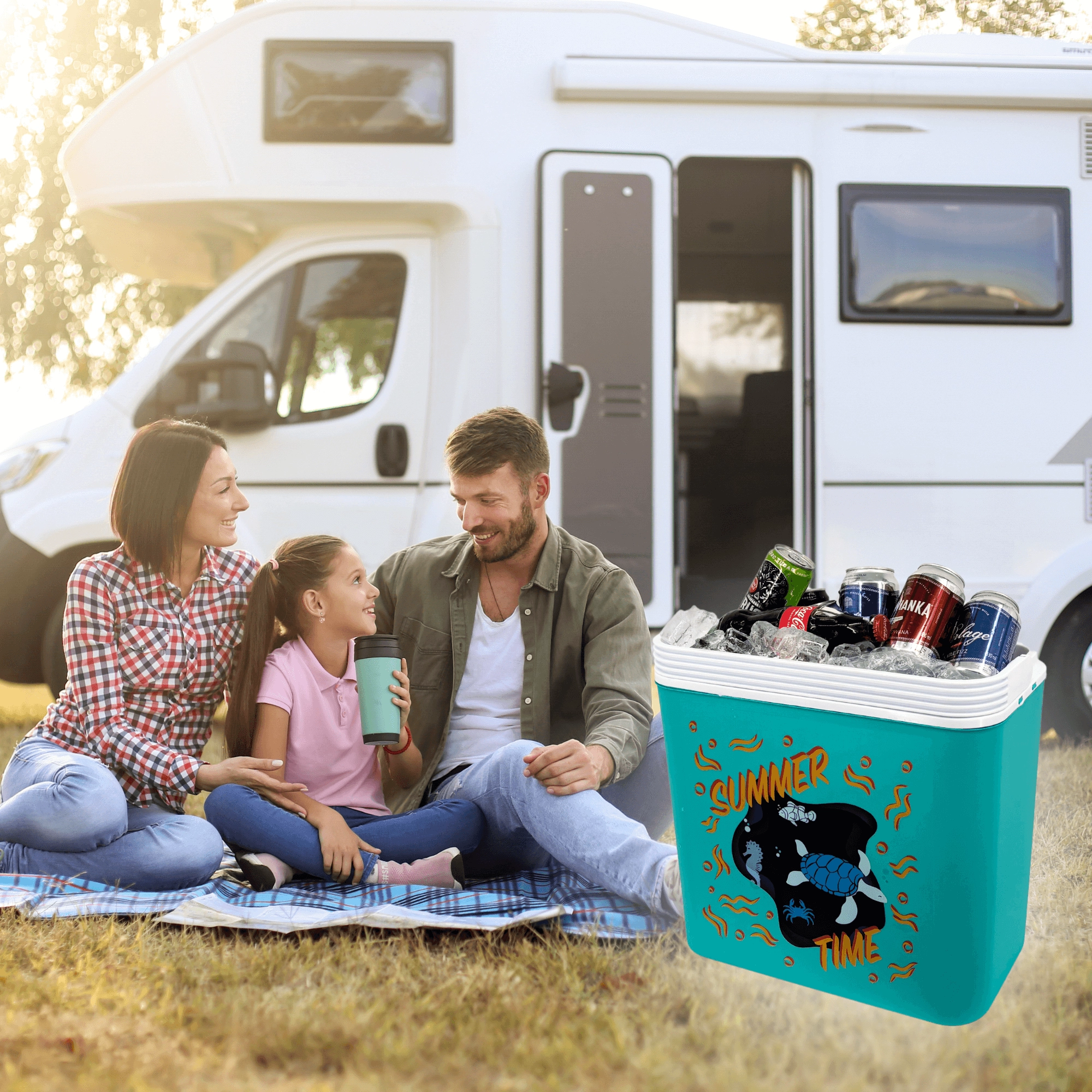 Le corps en polypropylène résistant se nettoie facilement et sa construction compacte s’intègre dans une voiture, une caravane ou un bateau. La hauteur intérieure permet de placer une bouteille de 2 l en position verticale; l’intérieur peut accueillir jusqu’à huit bouteilles de 1,5 l ou trois de 2 l côte à côte. L’impression estivale avec tortue et hippocampe et le couvercle contrasté confèrent à la glacière un look attrayant.