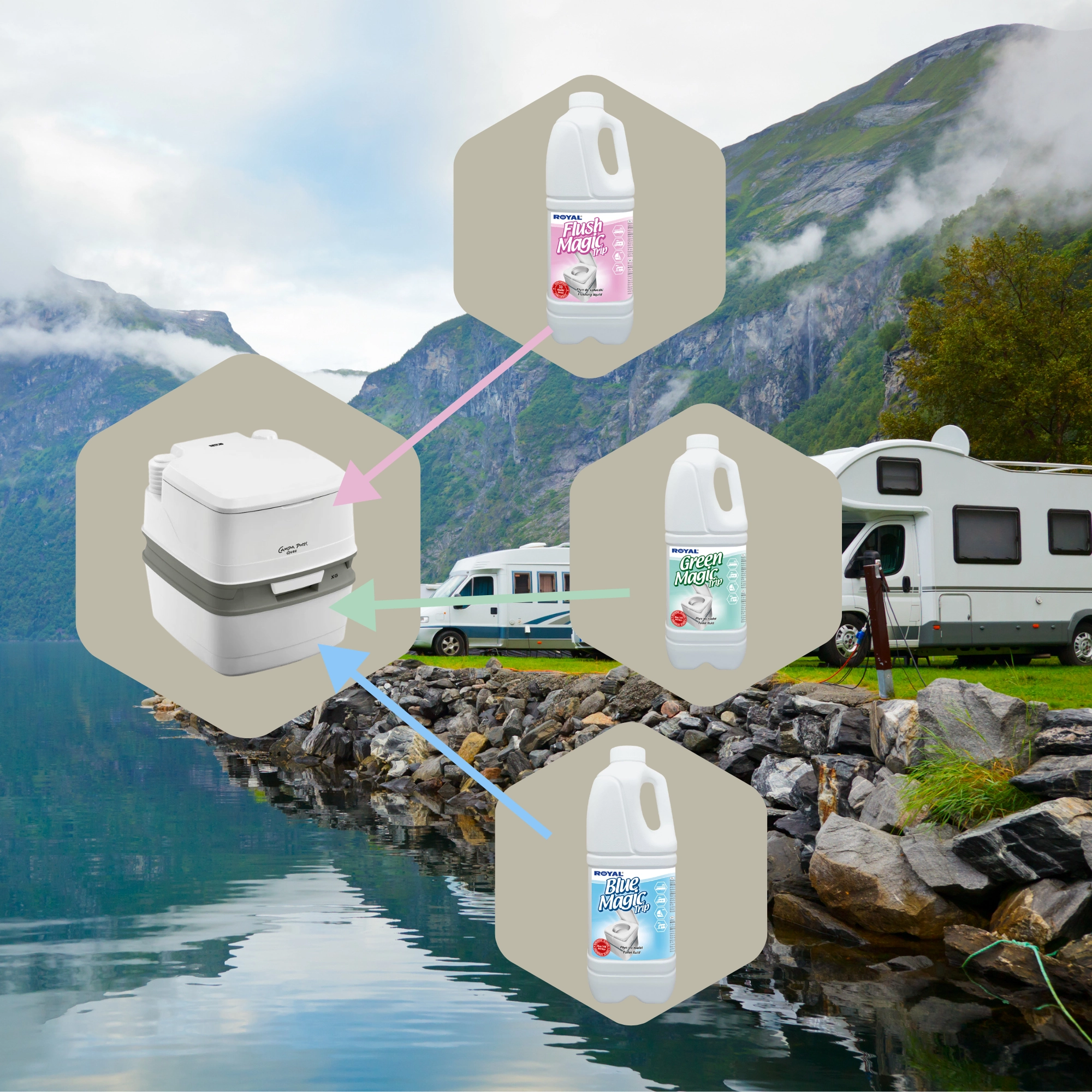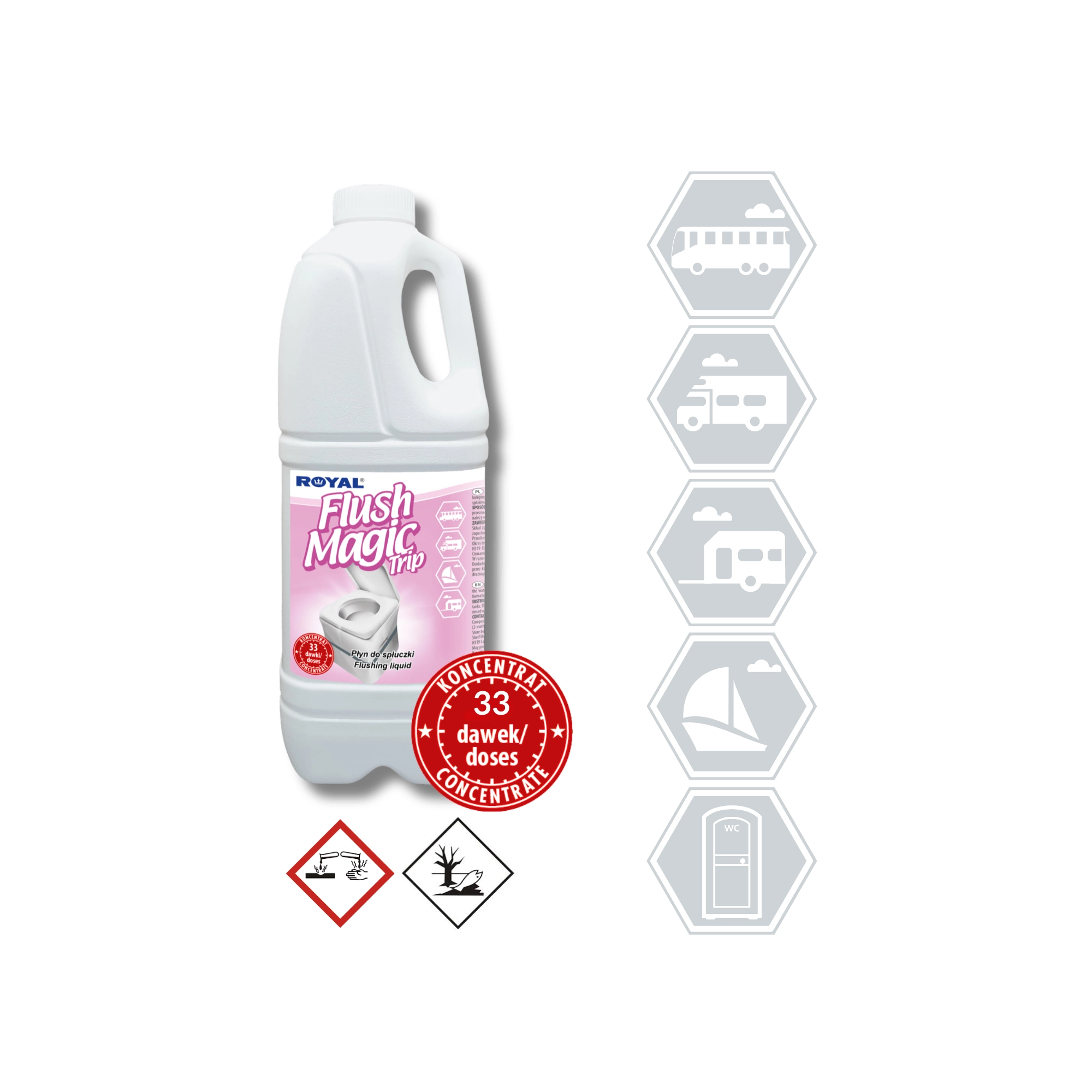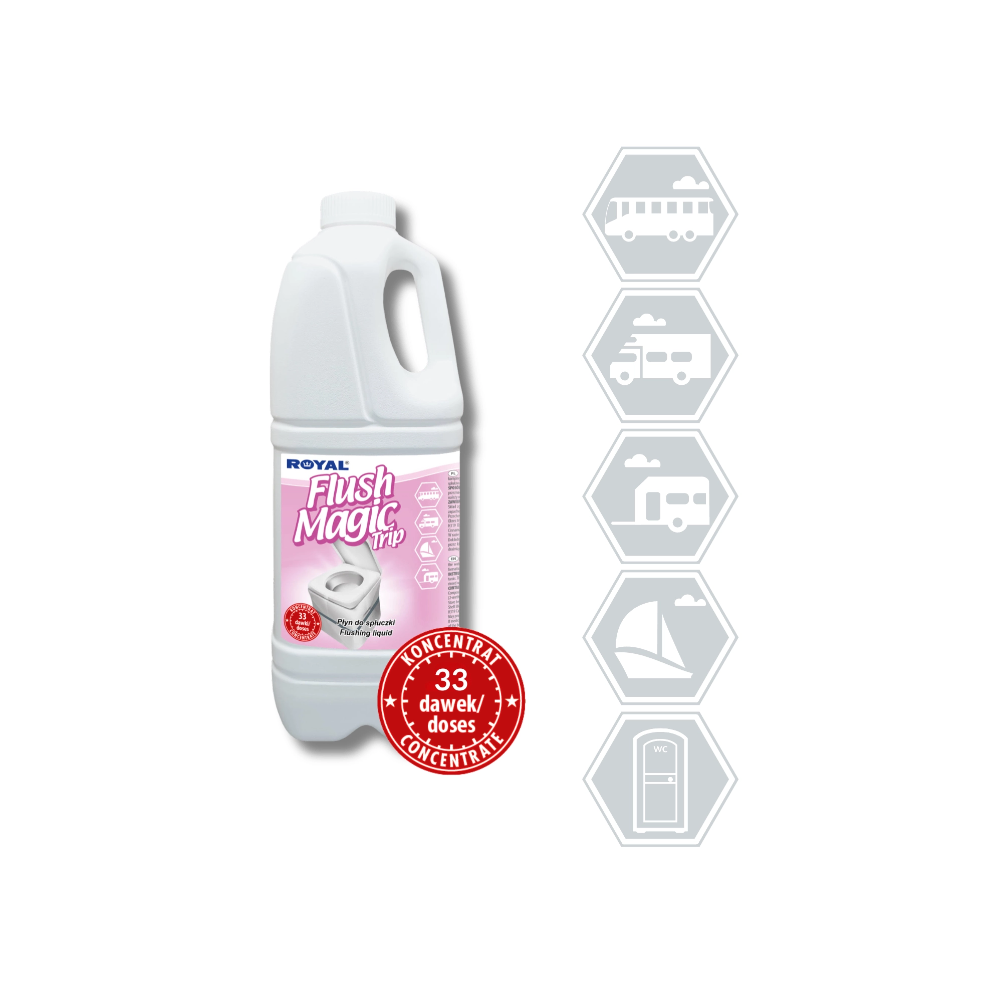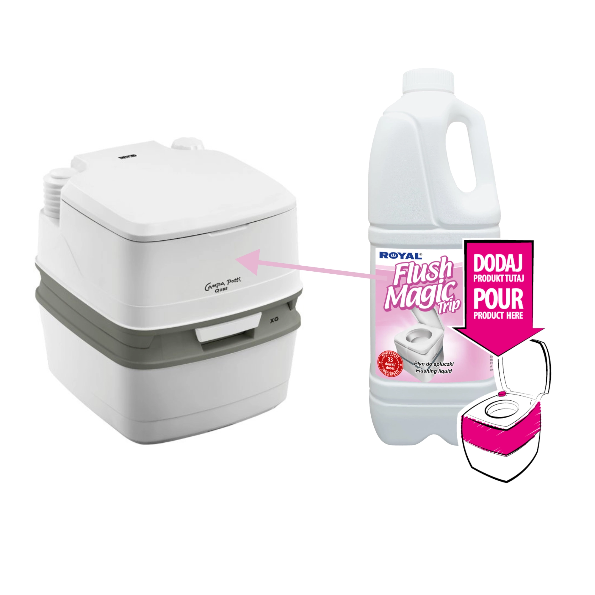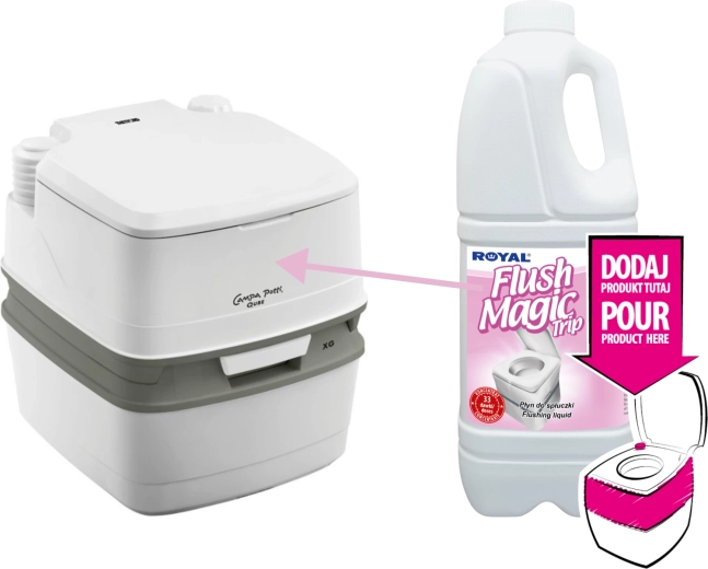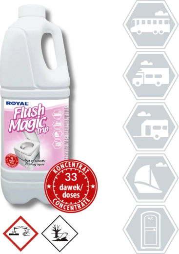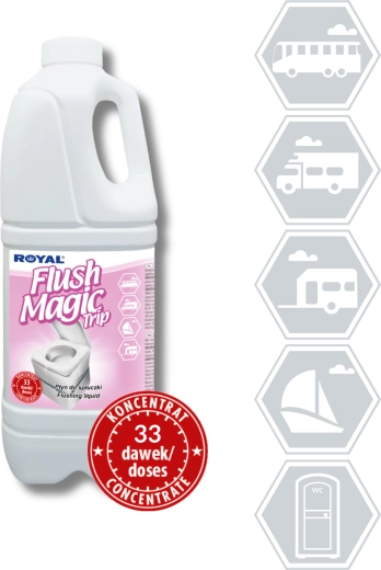 Flush Magic Trip est un additif concentré pour l’eau de rinçage des toilettes portatives, de camping et à cassette dans les caravanes, campings, bus, trains, avions et yachts. Il masque efficacement le contenu de la cuvette, élimine les mauvaises odeurs et maintient des conditions d’hygiène optimales.