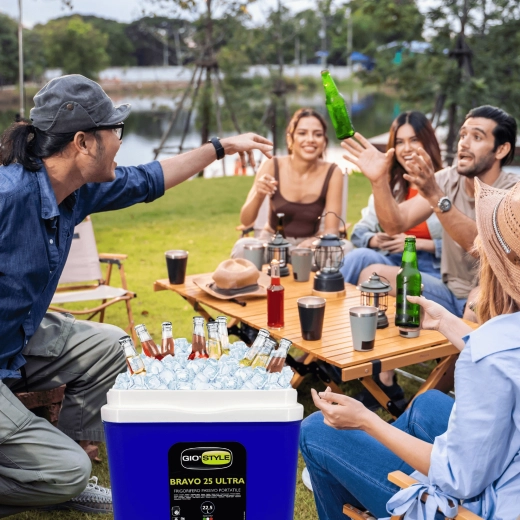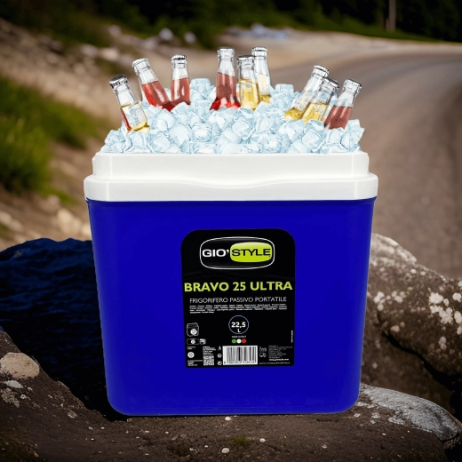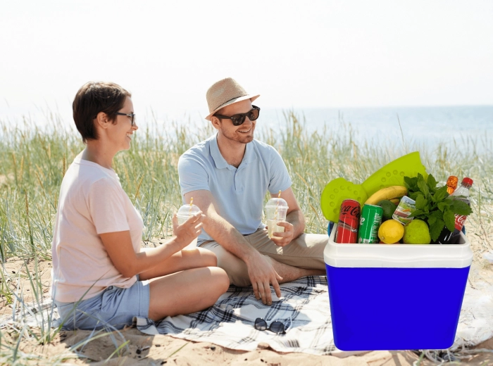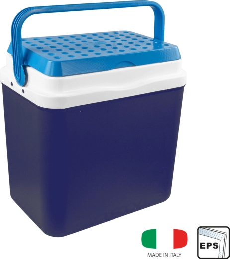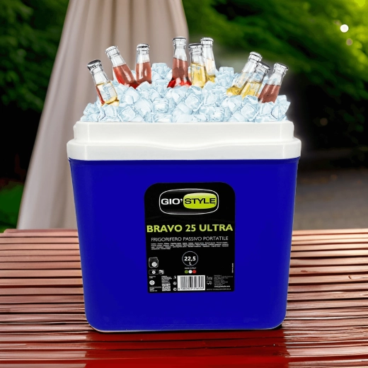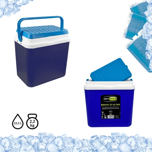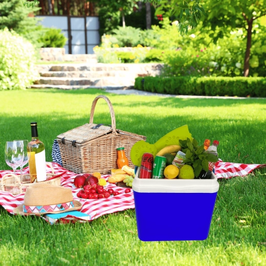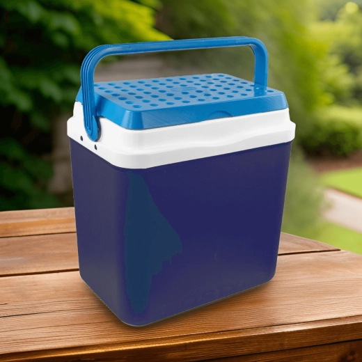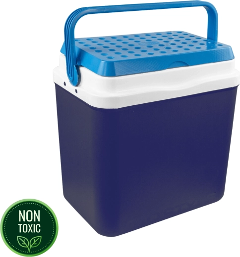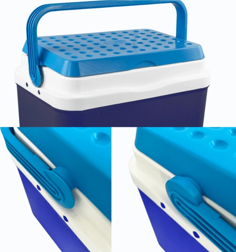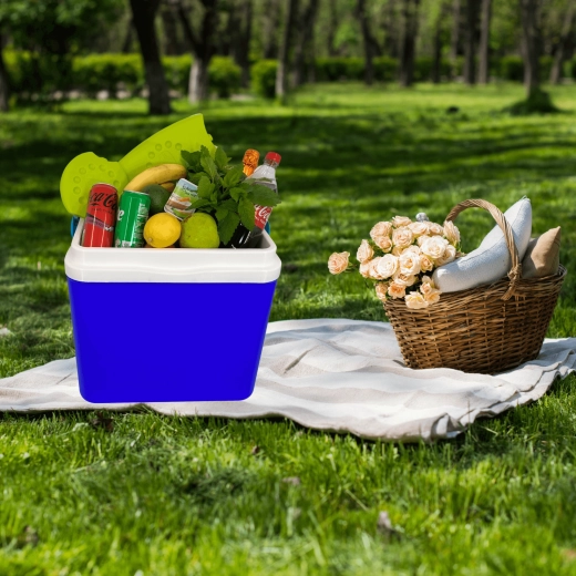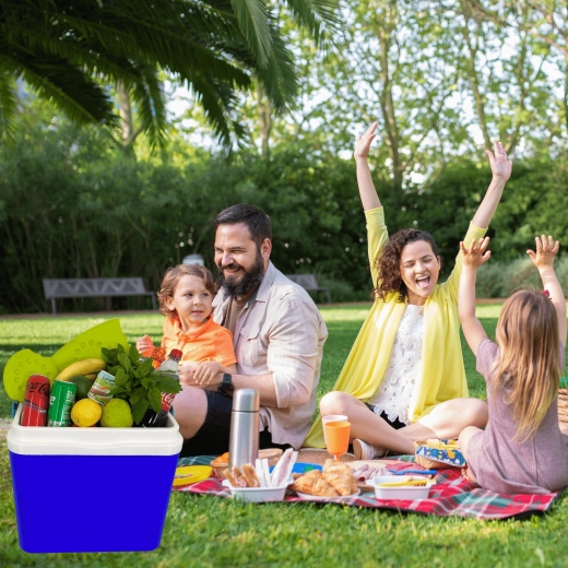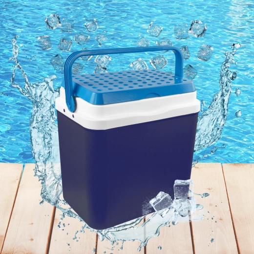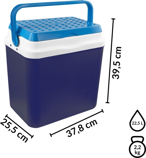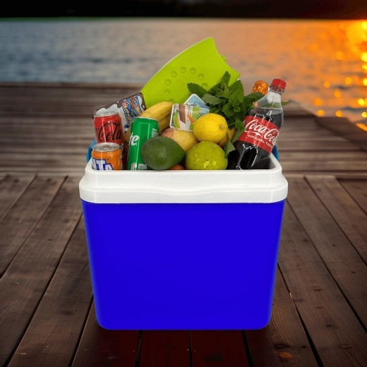 L’espace intérieur est conçu pour ranger confortablement boissons et aliments : elle peut accueillir une bouteille de 2 l en position verticale, jusqu’à 6 bouteilles de 1,5 l ou environ 15 canettes de 330 ml. Ses dimensions compactes facilitent son placement dans le coffre d’une voiture, d’un camping-car ou d’un bateau. Le corps bleu stylé avec couvercle turquoise souligne un design outdoor universel.