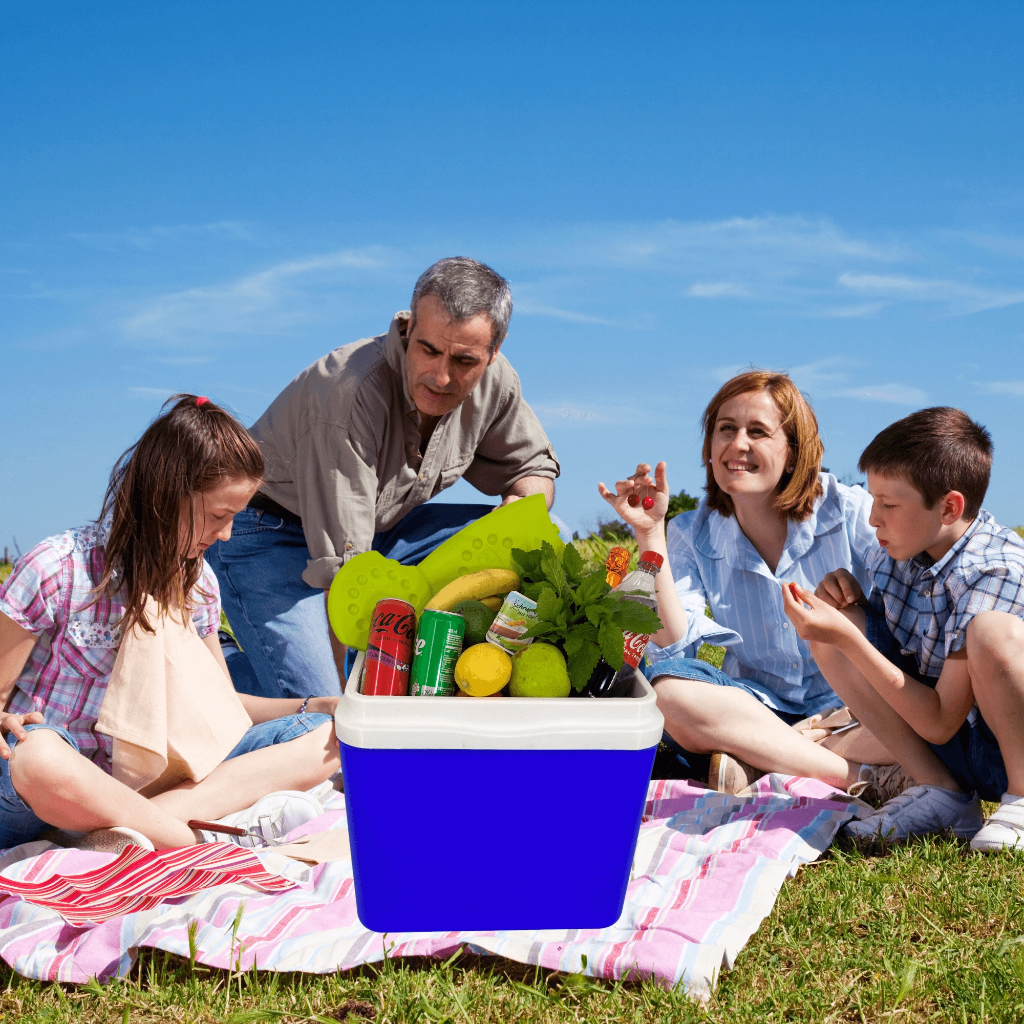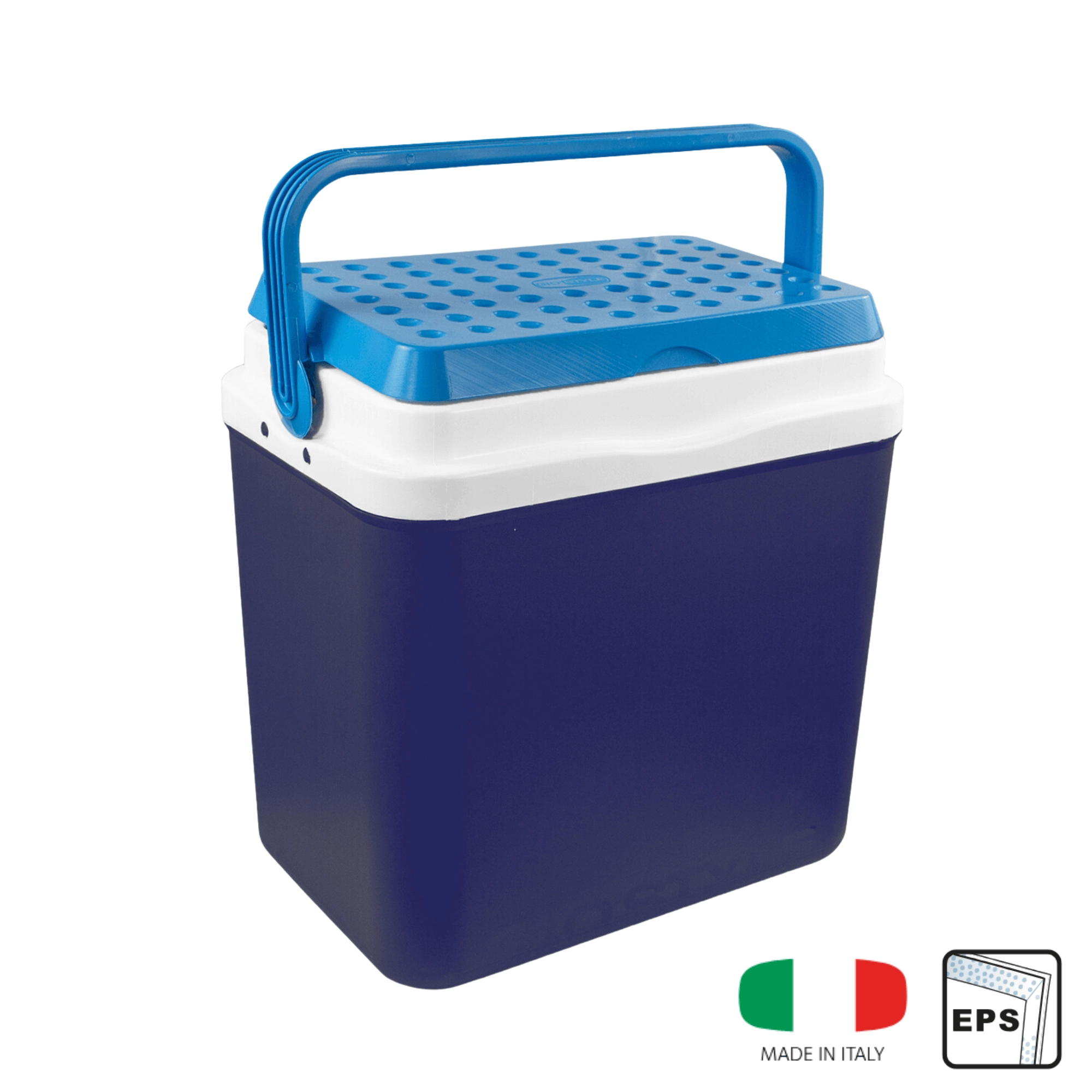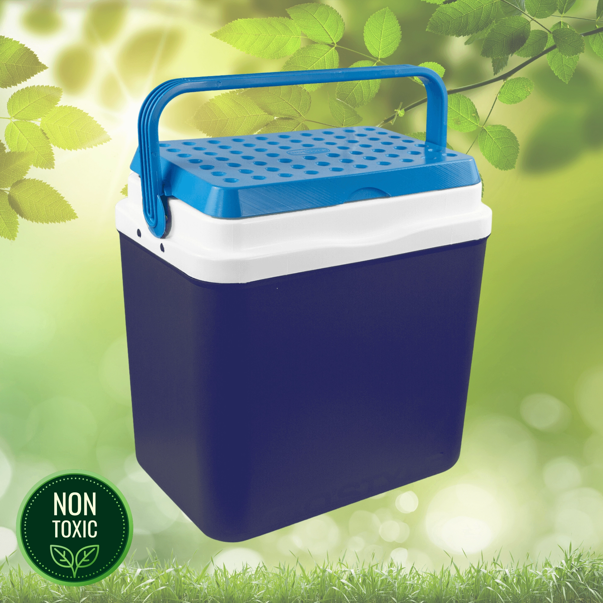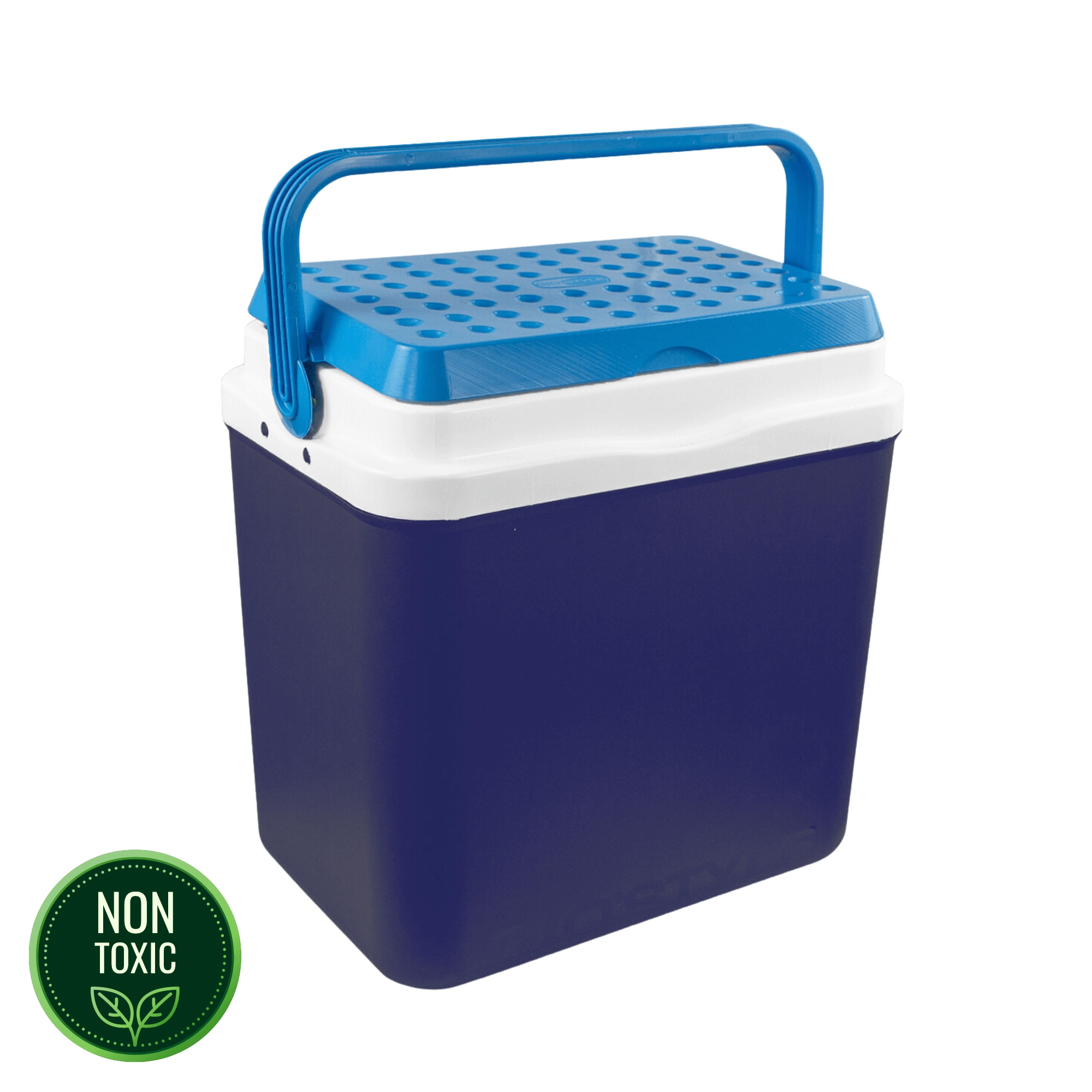 L’espace intérieur est conçu pour ranger confortablement boissons et aliments : elle peut accueillir une bouteille de 2 l en position verticale, jusqu’à 6 bouteilles de 1,5 l ou environ 15 canettes de 330 ml. Ses dimensions compactes facilitent son placement dans le coffre d’une voiture, d’un camping-car ou d’un bateau. Le corps bleu stylé avec couvercle turquoise souligne un design outdoor universel.