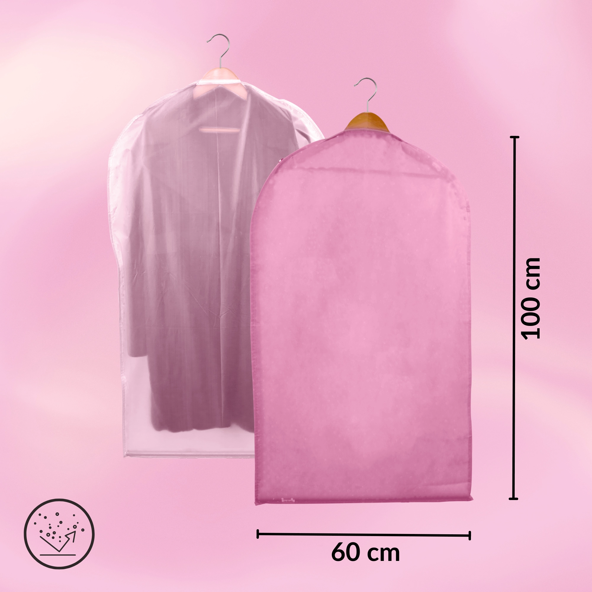 Le panneau frontal semi-transparent offre un aperçu visuel immédiat sans avoir à ouvrir. La fermeture éclair sur toute la longueur facilite la manipulation et le haut arrondi avec ouverture pour cintre assure une suspension aisée dans l’armoire ou le vestiaire. Le format 60 × 100 cm est universel pour la plupart des manteaux, robes et chemises.