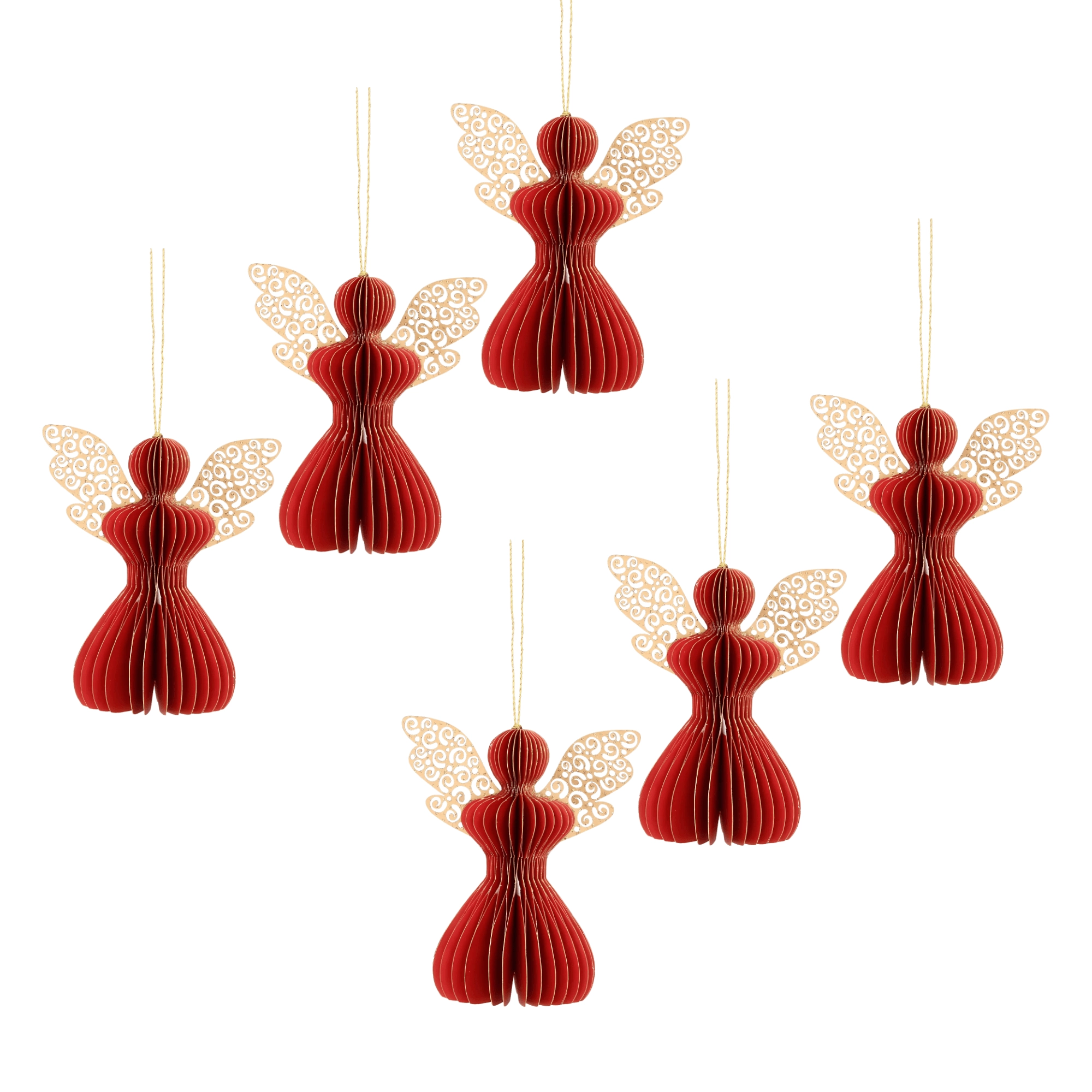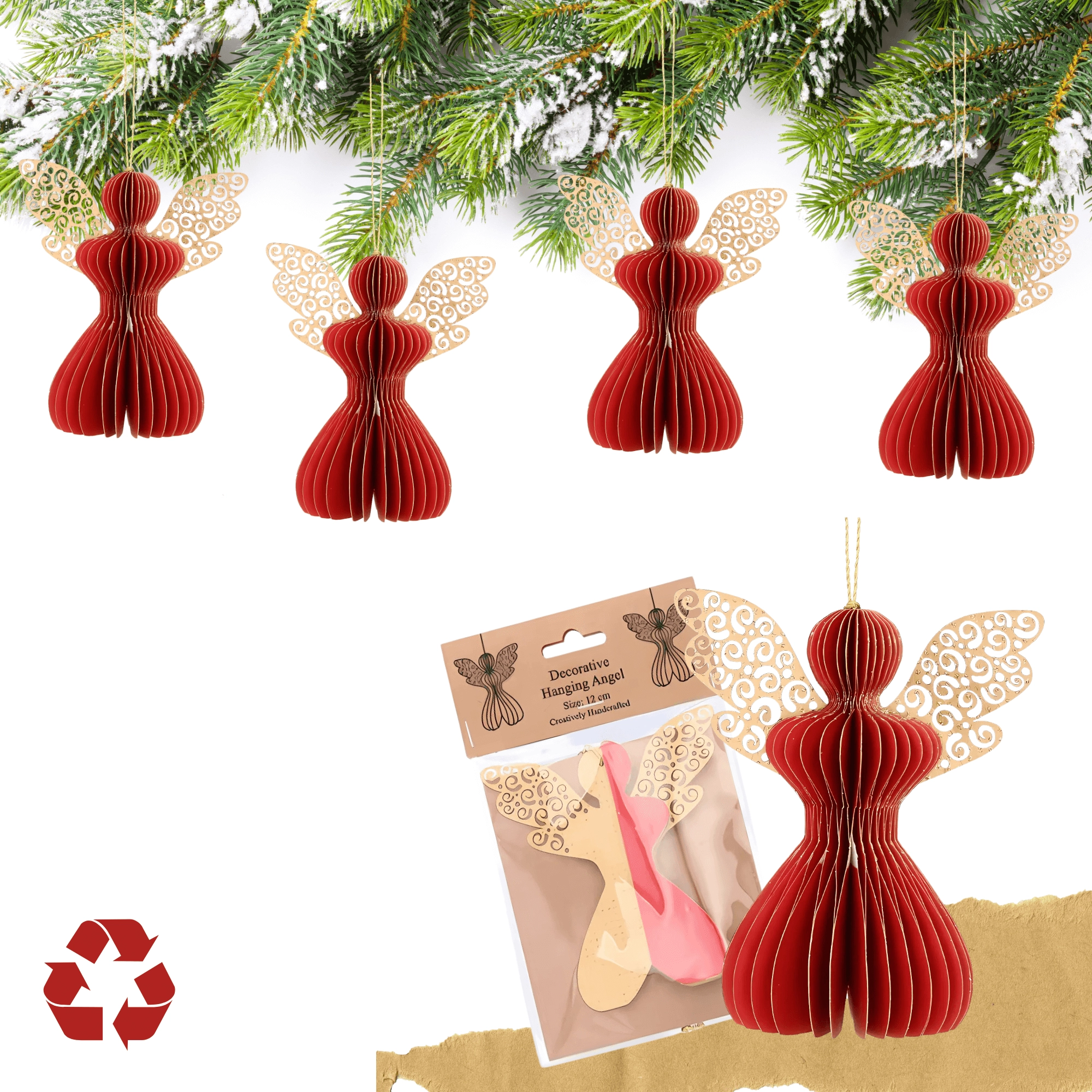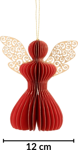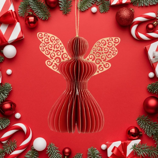 L’ange en papier rouge est une décoration de Noël polyvalente, adaptée aux intérieurs classiques comme modernes. Grâce à son design alvéolé (pliable) léger, il se suspend facilement et crée un bel effet 3D. Parfait pour le sapin, la couronne, les fenêtres ou comme touche délicate sur la table de fête.