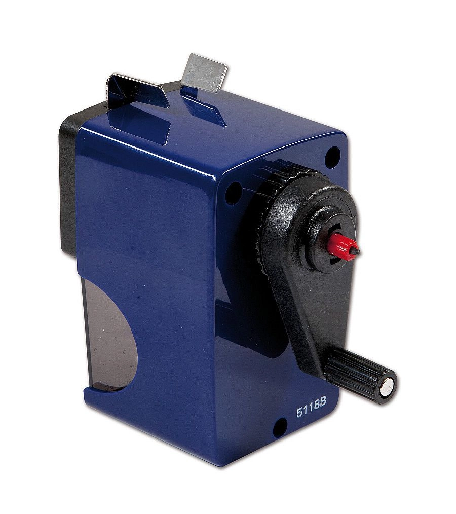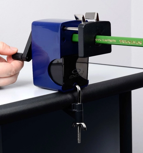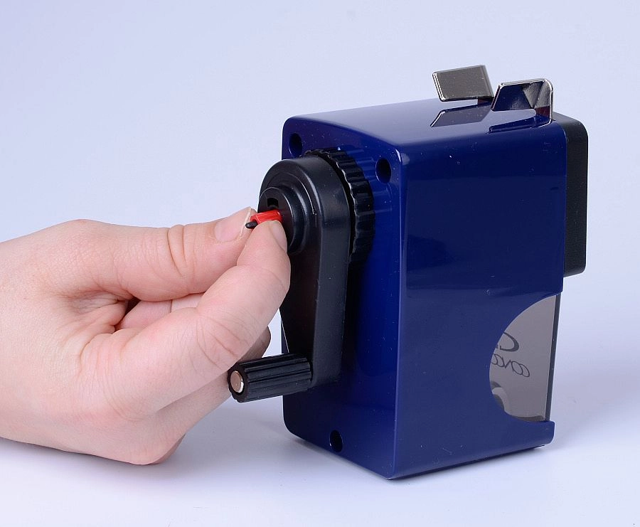 Taille-crayon de table pratique avec manivelle pour crayons fins et JUMBO de diamètres 7, 10 et 12 mm. Offre une avancée automatique du crayon lors de l’affûtage, un dégagement facile de la mine cassée à l’aide d’une tige et la possibilité d’un fixage solide au plan de travail pour une utilisation stable et sûre.